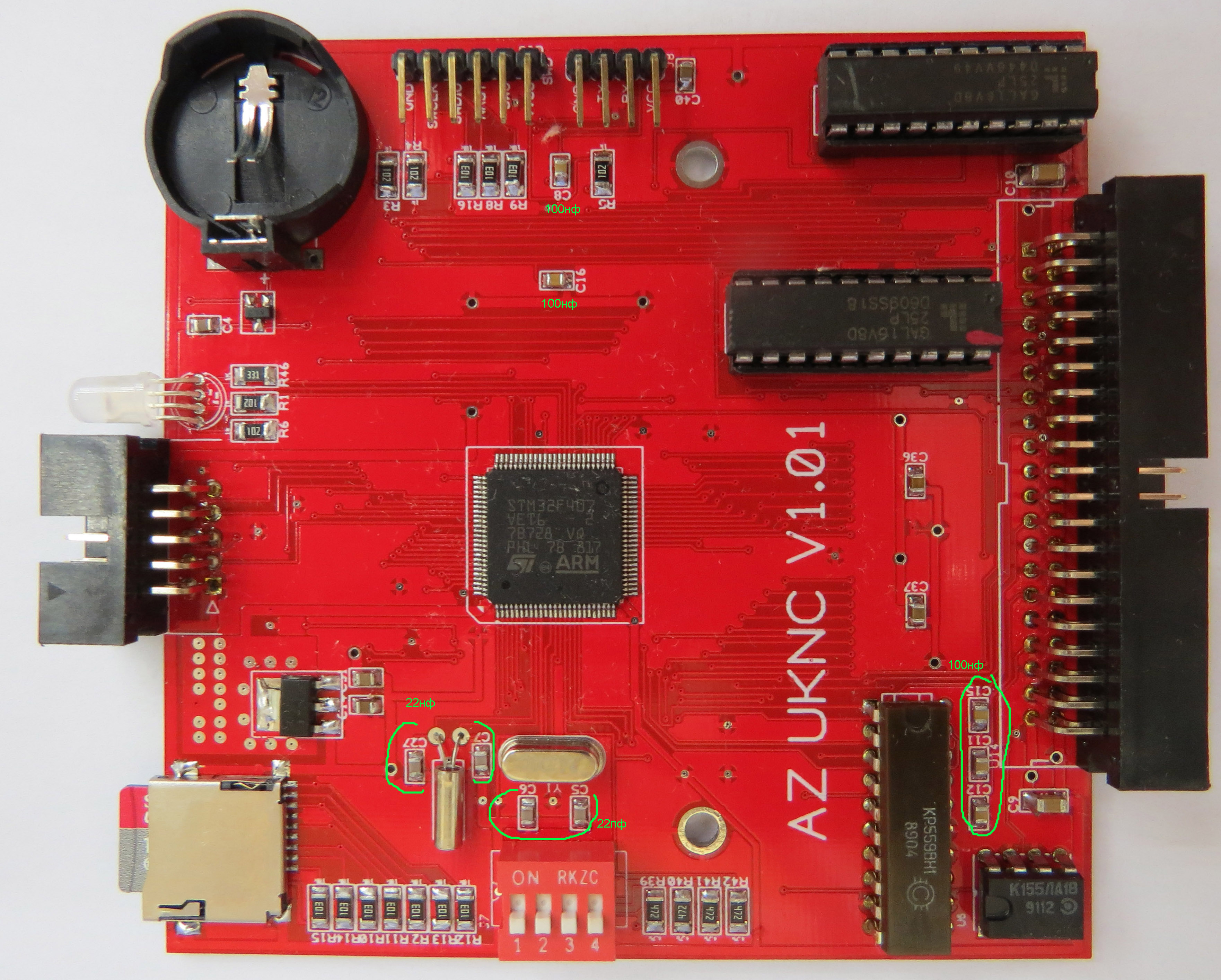 Для получения удовольствия от процесса сборки своими руками поставляются конструкторы контроллера в двух вариантах 1. минимальный конструктор - печатная плата + зашитые GAL-ки 2. полный конструктор Для сборки необходимы следующие детали: Cпецификация Резисторы SMD1206 330 Ом - 1шт 1 кОм - 5шт 4.7 кОм - 4шт 10 кОм - 10шт Конденсаторы керамические неполярные SMD1206 10мкФ - 2шт [допустима большая емкость] SMD0805 12пФ - 2шт [для обвязки кварца 32768] 22пФ - 2шт [для обвязки кварца 24MHz] 100нФ - 5шт 1мкФ -21шт [допустима большая емкость, кроме С3 С18 С22 С26] Микросхемы STM32F407VET6 - 1шт [допустима установка SMT32F407VGT6] SN74ALS245ADW - 2шт КР559ВН1-1шт КР155ЛА18 - 1шт LM1117-3.3В (AMS1117-3.3В) - 1шт GAL16V8D-25LP - 2шт (поставляются уже прошитые) Установочное IDC 2x5 угловой - 1шт Разъем MicroSD 9pin - 1шт Кварцевый резонатор 24 MHz - 1шт Кварцевый резонатор 32768 Hz - 1шт Переключатель DIP8 4позиции - 1шт Разъем под батарейку - 1шт Угловой 6pin - 1шт Панелька DIP20 - 2шт Диоды LED RGB 5мм c общим катодом, диффузный - 1шт BAT54C SOT23 сдвоенный диод шоттки - 1шт Сборка контроллера фотоинструкция по компонентам лицевая часть маркировка резисторов видна остальные (не подписанные ) конденсаторы 0805 - 1мкФ, 1206 - 10мкФ там где подписано 22нф: 22пф ставим на обвязку кварца 24MHz и 12пф ставим на обвязку кварца 32768 тыльная часть все конденсаторы - 1мкФ Важно: не смотря на исходную проверку микросхем в живом контроллере, есть риск их "прокисания" те это касается ЛА18 и ВН1, соответственно рекомендуется устанавливать их в панельки рекомендуемый порядок сборки: SMT32F406VET6 SMD компоненты с лицевой части SMD компоненты с тыльной части Установочное Микросхемы и прочие детали маркировка GAL: U8 - одна точка U9 - две точки Подготовка контроллера к работе 1. Контроллер псевдодиска на MicroSD: Процедура обновления firmware (прошивки) контроллера 2. Заливка на MicroSD карту образов, установка карты в контроллер 3. Установка контроллера в УКНЦ. запуск в работу. Ссылки: Приобрести контроллер для УКНЦ можно тут Приобрести контроллер для ДВК можно тут Процедура обновления firmware (прошивки) контроллера Контроллер псевдодиска на MicroSD на шину МПИ: особенности версии для УКНЦ Страницы разработки на ZX-PK УКНЦ + AZ - вариант контроллера псевдодисков на микро-SD для УКНЦ. Контроллер псевдодиска на SD-карте для ДВК -------------------- Живы будем - Не помрем !