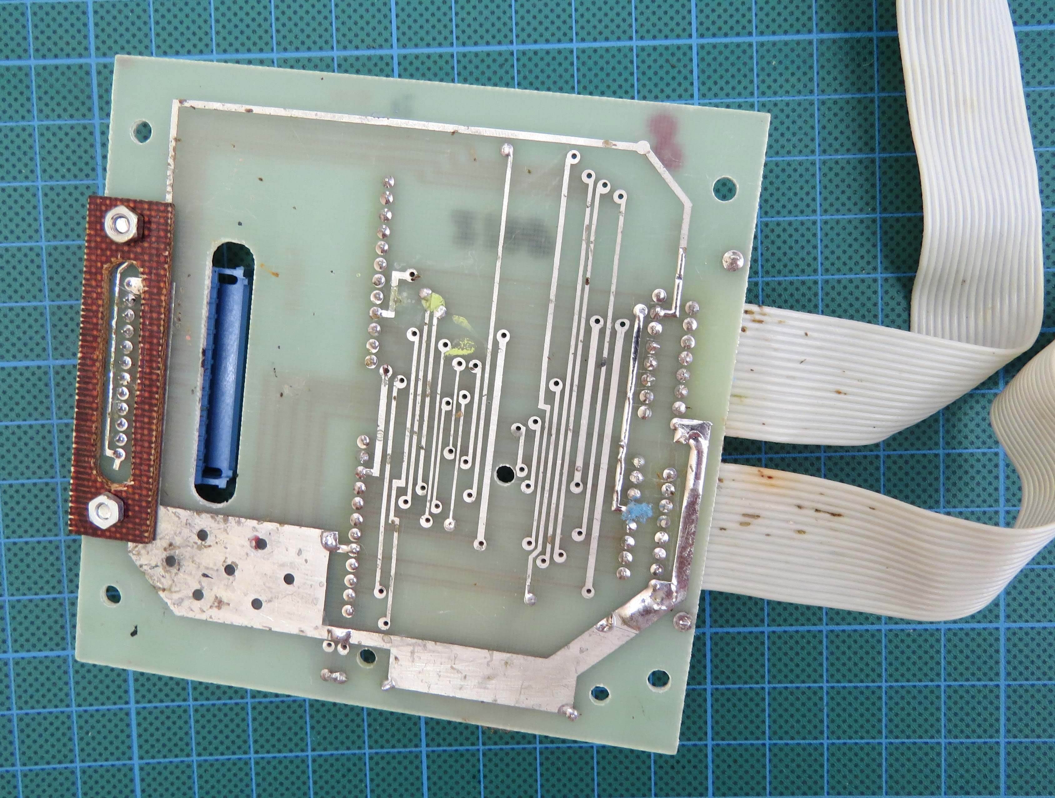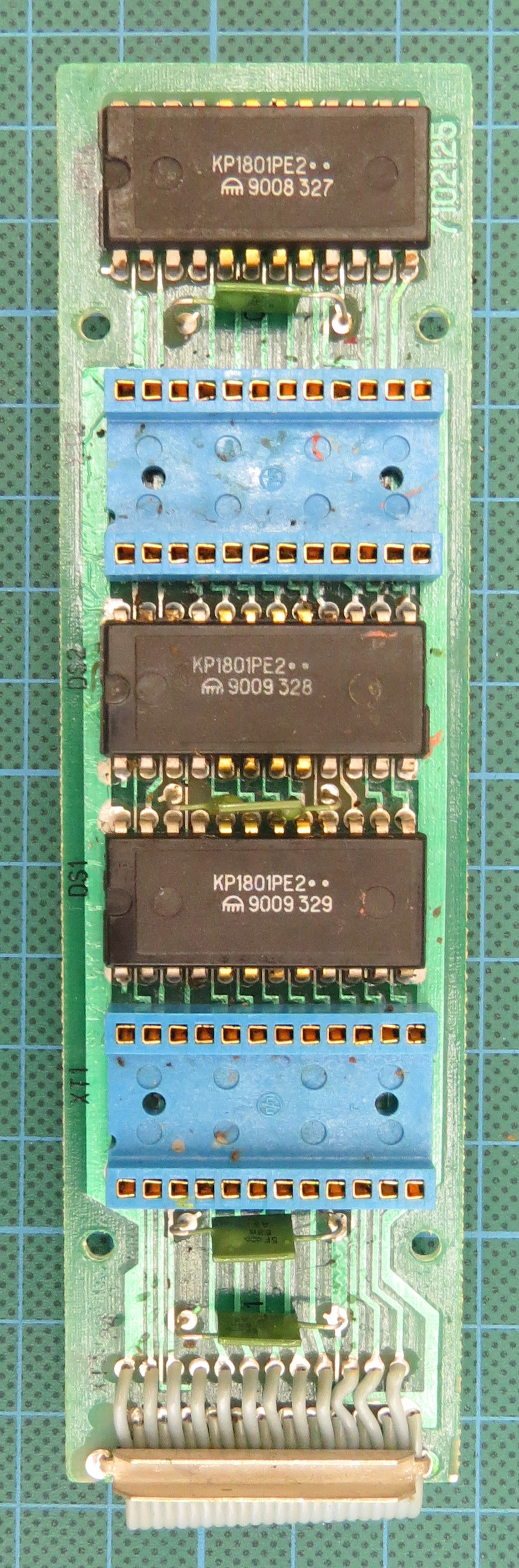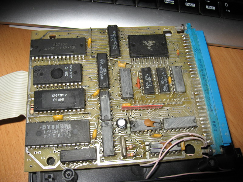 Контроллер дисковода. 1) Общий вид 2) Плата. Микросхема в керамическом корпусе - К1801РР1 с зашитым МКДОСом, припаяна прямо поверх микросхемы с драйвером дисковода. 3) А вот эти резисторы обеспечивают блокирование ПЗУ бейсика и загрузку драйверов и МКДОС вместо него при старте БКшки. |