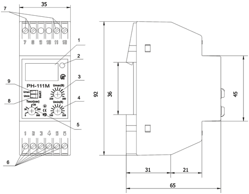 1- трехразрядный семисегментный индикатор 2- индикатор включения нагрузки 3- регулировка порога срабатывания реле по максимальному напряжению (Umax) 4- регулировка порога срабатывания реле по минимальному напряжению( Umin) 5- регулировка времени АПВ 6- выходные контакты 7- входные контакты 8-выключатель контроля минимального напряжения( Umin) 9-выключатель контроля максимального напряжения(Umax) -------------------- Живы будем - Не помрем !
