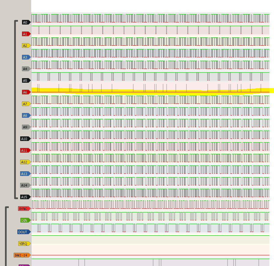 1. Осциллограф 2. Паяльник и сопутствующие принадлежности 3. Различные детали на замену. 4. кусачки для выкусывания микросхем 5. спиртоканифоль 6. ватные палочки, 96% спирт. Разберем типичные неисправности. 1. Достаточно часто выходит из строя память. Явные дефекты памяти диагностируются очень просто: смотрим на выход - ногу #14 РУ5(БК11/M) или #14 РУ6 (БК10) типичная картина: для шахматки 11М если же видим какой-то средний уровень без изменений или изменения явно отличаются от типичных на других выходах - микросхема явный кандидат на замену. Явные дефекты видны и на шахматке в виде системных черных или белых полос проходящих вертикально. [наконец-то попалась БКшка с дохлой памятью] вот тут видно, что не хватает 1 бита с высоким уровнем (логический 0, тк в БК шина инверсная) [фото осциллограммы к сожалению не получилось - там был какой-то средний уровень с небольшими помехами] а вот тут фото получилось для подтверждения - замыкаем 14й выход подозрительной озушки на землю и смотрим на экран. и появляется линия на всех словах: типичная картинка в режиме шахматки для БК-0010 * следует отметить, что ремонт старых машин, особенно хранившихся в плохих условиях - те с повышенной влажностью итд, может быть затруднен тотальным выходом из строя микросхем втч и в реальном времени. К примеру одна из БК11М, при первом включении запустилась, на втором сдохла одна ОЗУшка, послее ее замены - 5-10 минут работала и сдохло еще 3 ОЗУшки. После их замены полчаса работы и снова шахматка. ** общее замечание к ремонту - будьте готовы к самому невероятному поведению дефектных микросхем - те из-за нарушения технологии производства, со временем они могут принципиально поменять свой функционал: случаи из опыта (те что пока вспомнил) - ремонтирую БП ДВК3М. основная причина - свист, и низкая нагрузочная способность. выясняется причина - ЛА9 стала счетчиком-делителем - те на входе ~16кГц на выходе примерно 4кГц (те она просто тупо пропускает импульсы). ИР1 перепутал выходы те вход 1 ушел в небо, вход 2 завязался на выход 1 и 2 вход3 связался с выходом 4 итд причина - плохо промытые кристаллы после травления. тут следует отметить что наибольшие замечания подобного вида характерны для "армянских" микросхем. Осциллограммы с рабочей БК11М выход с памяти РУ5 БК11М выход с ИР13 нога 4 Допустим мы прошлись по памяти и там вроде картинка похожая на правду опишу примерный план действий дальше: 1. остановить проц и пройтись осцилом по шине, вполне удобно пройтись по панельке ПЗУ или самой микросхеме - там почти все сигналы в одном месте задача - проверить а не садит ли шину что-либо ? те целевое состояние это все сигналы в высоком физическом уровне и в районе _напряжения_питания_ это важно! если к примеру вы обнаружите что AD12 имеет линию в 3В тогда как все в 5В то это уже повод для поиска неисправности причем, cтоит понимать, что не всякая просадка шины фатальна - те БК может работать с просаженной шиной, но это может потом закончится ее полной неисправностью или глюками, невозможностью ее разогнать итд. искать методично разрезая скальпелем дорожки проблемного бита. но начинать стоит с резисторных матриц ибо они легко ломаются и получают микротрещины. 2. в состоянии остановленного проца пройтись по логике - те простым логическим микросхемам на предмет их статической исправности - те если у нас элемент 2И-НЕ то если на входе 0+