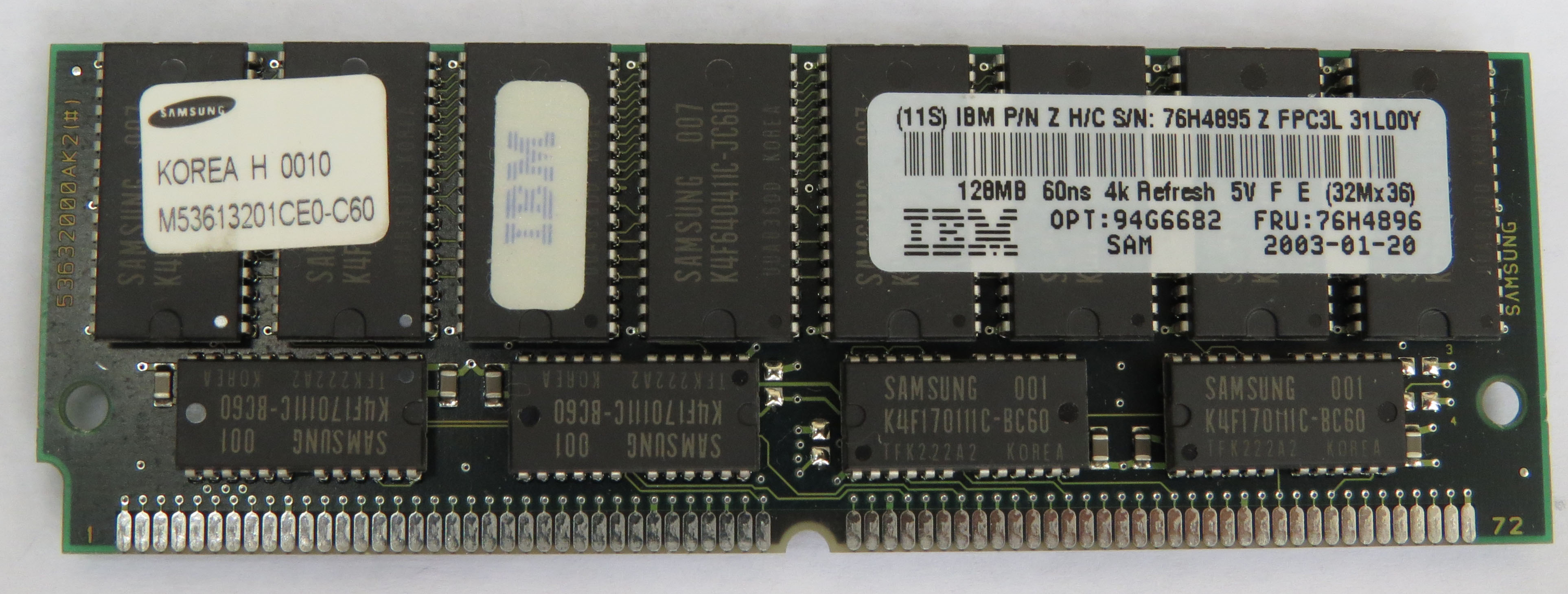 подходит любая память SIMM72 FPM объемом от 32х до 128МБ устанавливается парами тк шина данных 64бита Штатно установлено две планки по 32МБ DEC 5421277 memory 8mx36 70ns for Alpha station 400 В запасах было найдена пара вот таких 128МБ первый IBM 128MB 60ns 4k Refresh 5V (32Mx36) OPT: 94G6682 FRU: 76H4896 второй SEC KMM53632000AK-6U (по сути это одно и тоже, первый просто промаркирован IBM-ом) прекрасно подошли! -------------------- Живы будем - Не помрем !