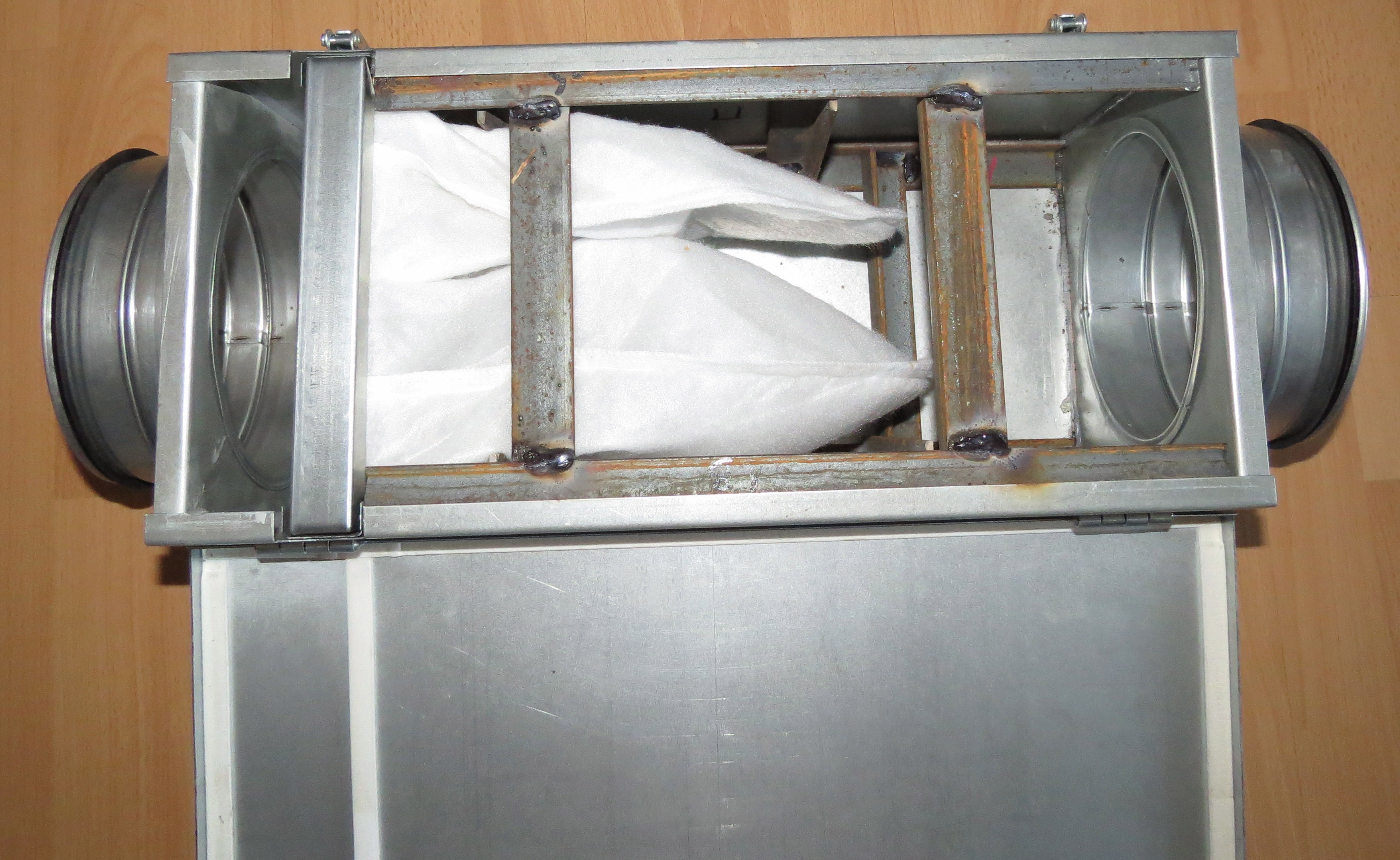берем готовый канальный вентиляционный фильтр со сменной кассетой Ввариваем каркас безопасности - иначе его раздавит атмосферное давление Штатные клепки усиливаем - те ставим вместо 2х по 10 на каждую сторону Подключаем к системе при помощи переходников - готовый канализационный колпак на 160мм + фланец и труба на 50мм -------------------- Живы будем - Не помрем !