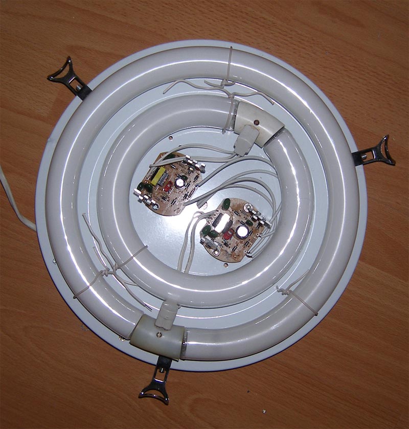Готовим светильник для туалета те берем готовый светильник с ЛН, убираем патроны монтируем две кольцевых лампы (32 и 22Вт), ЭПРА под них сразу ставим небольшие радиаторы на транзисторы в ЭПРА для исключения перегрева (собственно только перегрев ограничивает ресурс ЭПРА) вид на внутренности готового светильника -------------------- Живы будем - Не помрем !