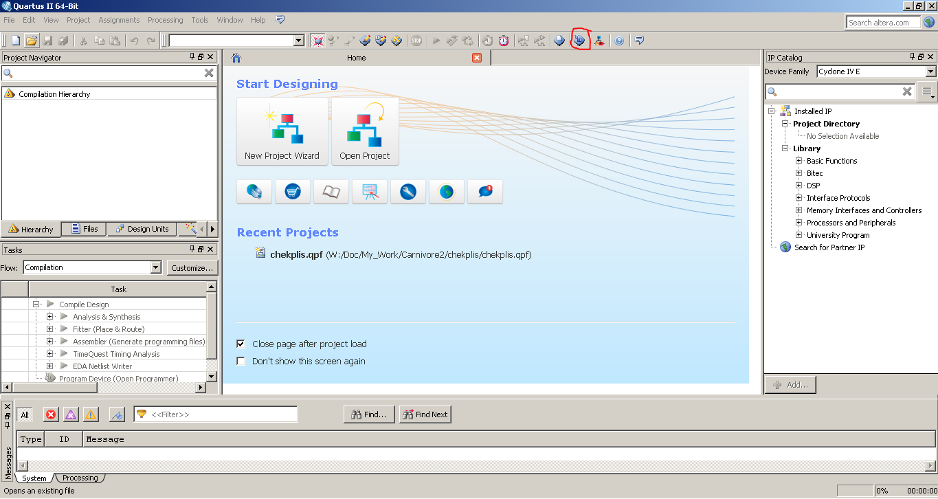 обновление прошивки ПЛИС производится при включенном питании БК и вставленном в нее AZBK в собранном виде. допустимо собрать платы вместе и вставить сетевую карту и подключить VGA монитор. подключаем программатор USB Blaster к порту AS на нижней плате AZBK: второй порт JTAG предназначен для отладки и при обычной прошивке не требуется затем подключаем к ПК [желательно использовать для прошивки ноутбук или планшет для исключения проблем с блуждающим нолем на питании] итак, запускаем Quartus, в меню выбираем Programmer видим что нет программатора - нажимаем видим, что система его обнаружила, его надо выбрать из выпадающего списка если в системе программатор не виден, втыкаем в другой рабочий порт USB, перегружаем компьютер и делаем стандартные действия для обеспечения работы USB устройства ![]() выбрали ![]() выберем режим программирования теперь добавим файл прошивки ставим галочки - прошивка и проверка прошивки готово подводные камни: китайцы наштамповали всякие USB Blaster-ы на разных контроллерах и как следствие не исключены глюки, увы на которые мы никак повлиять не можем. лечить - переставлять в другой USB-порт, USB-хаб или использовать более старшую версию Quartus-а. (или наоборот - младшую - 13ую к примеру) Ссылки: Загрузочный кабель USB Blaster для ПЛИС ALTERA Приобрести USB Blaster можно тут -------------------- Живы будем - Не помрем !