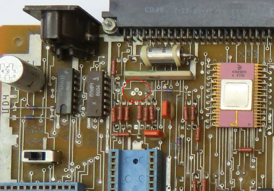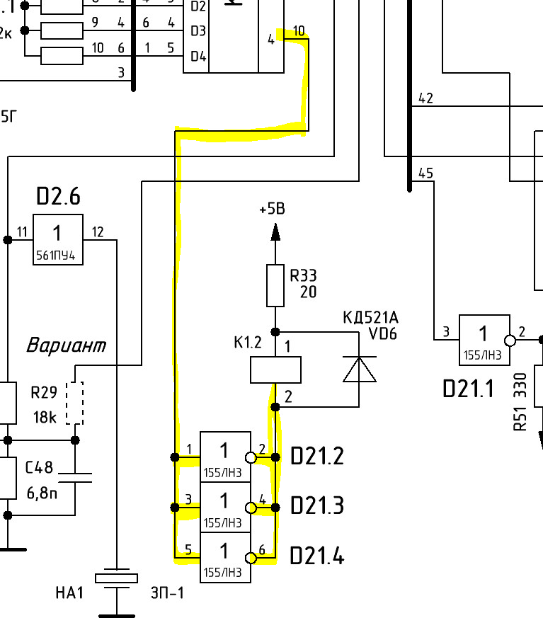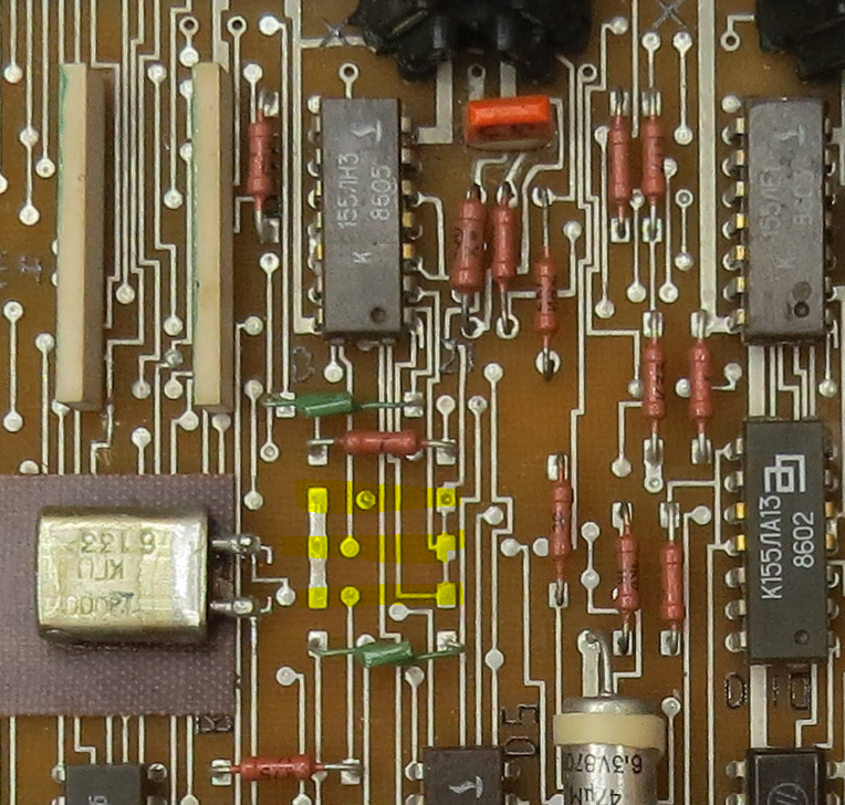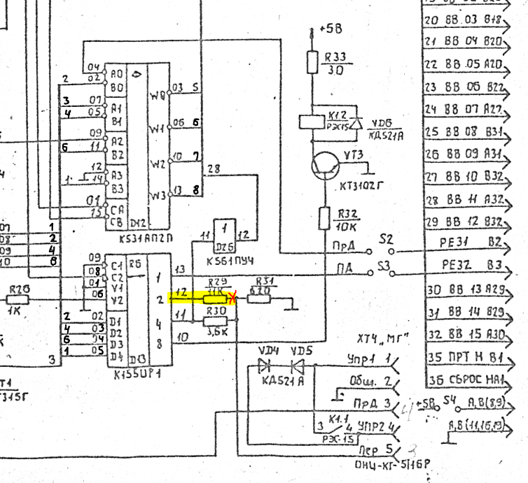 восполняю пробел БК-0010 оригинал обработка - подписал плохочитаемое обнаруженные ошибки на схеме сигнал на УП B1 имеет подключение не к шине 35 как на схеме а к 41 Б1 соединен с Б8 и через резистор 11ком подключен к выходу 12 регистра ИР1 технически это бит 5 (используется для передачи данных на магнитофон, либо сигнала готовности на линию) те на схеме он должен быть соединен с выходом на магнитофон, но в ранних БК этого не было ни на одной БК-0010(01) нет никакого КТ3102 - есть место под него и только - отмечено красным а реально реле включено через ЛН3: тут на схеме есть кусок с формированием градаций яркости, который был заложен на печатные платы: вот тут должны были стоять резисторы градаций яркости (отмечено желтым): [это ранняя БК] но реально там проводами все три элемента объединены для управление реле магнитофона далее появились просто перемычки: детальное описание всех отличий БК-0010(01) в этой теме Эмуляция БК-0011М на базе БК-0010(01) + AZБК -------------------- Живы будем - Не помрем !