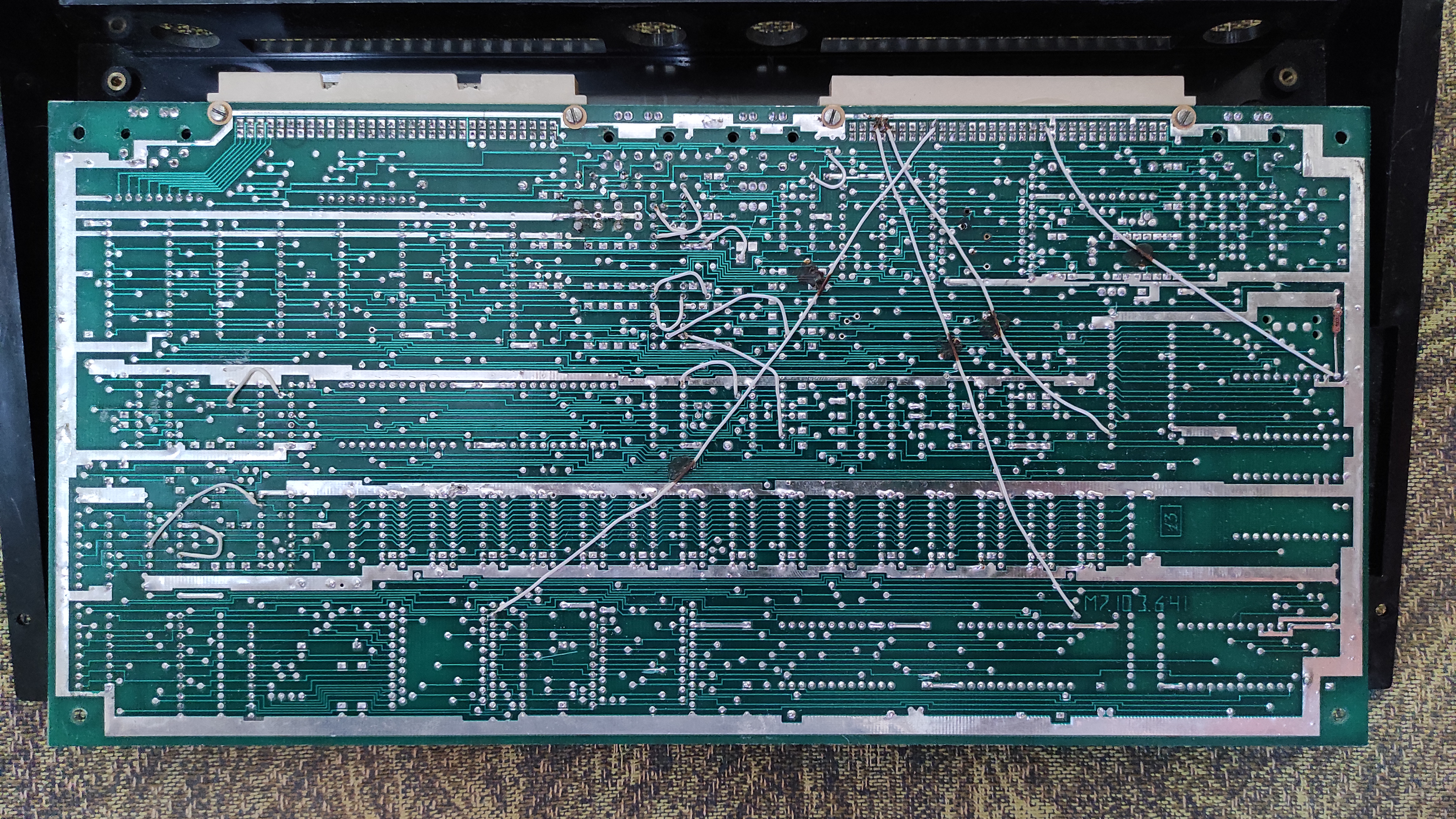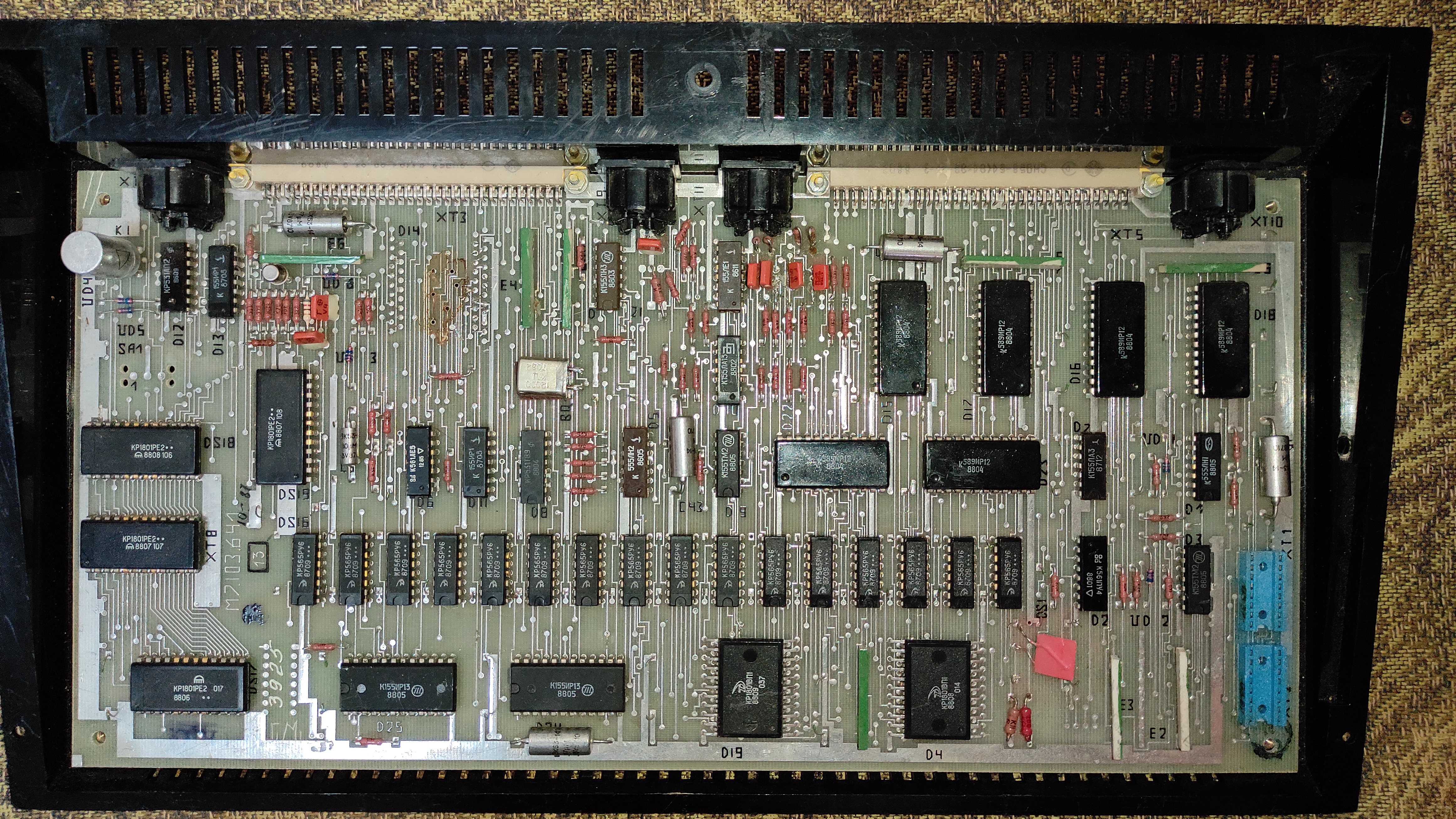 Плата БК-0010.01 после вандалов с заводской доработкой - добавленая блокировка бейсика - виден резистор и проводок на А14 и отрезанные дорожки