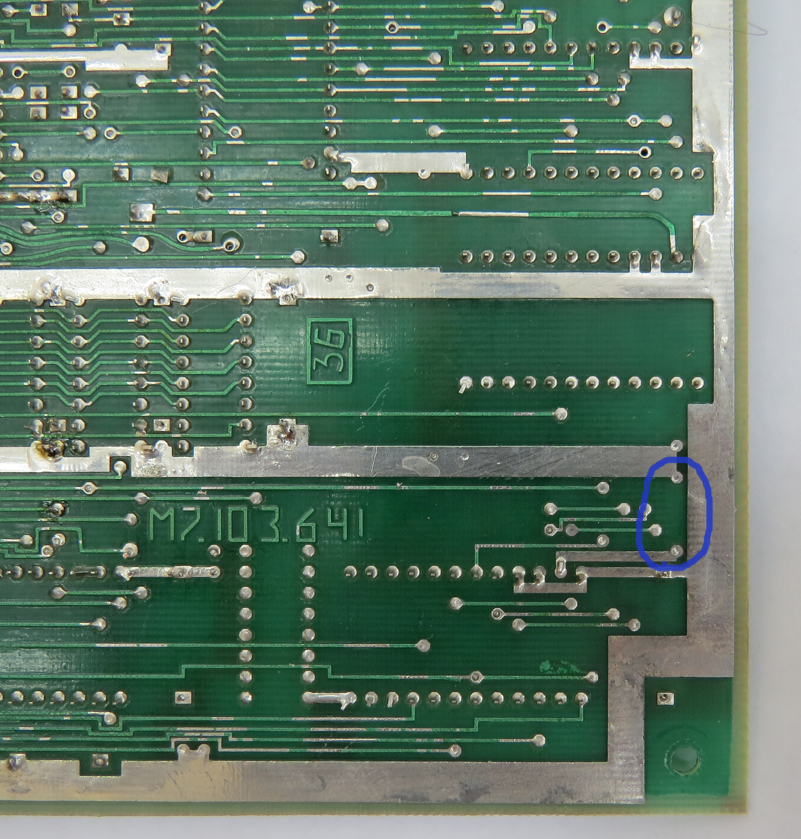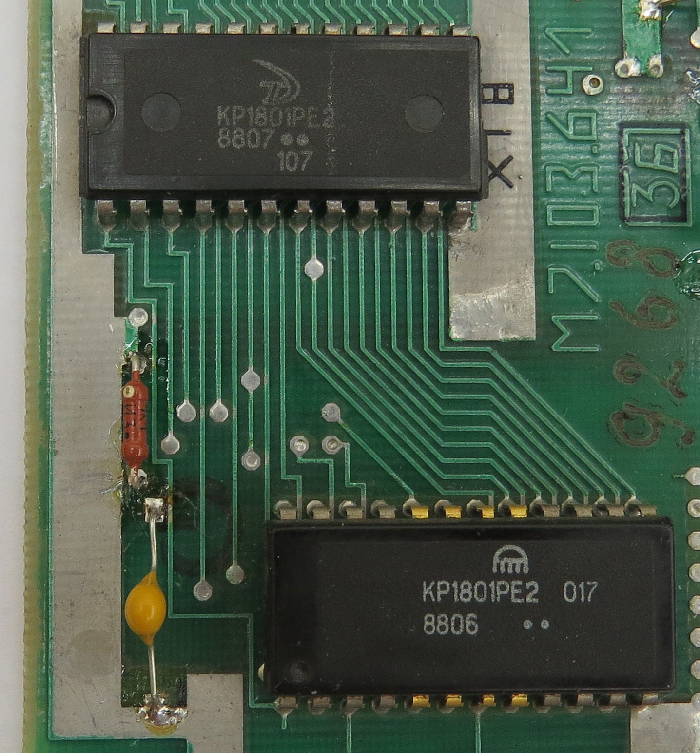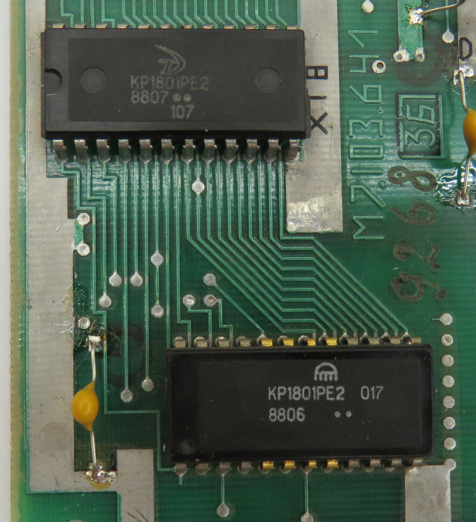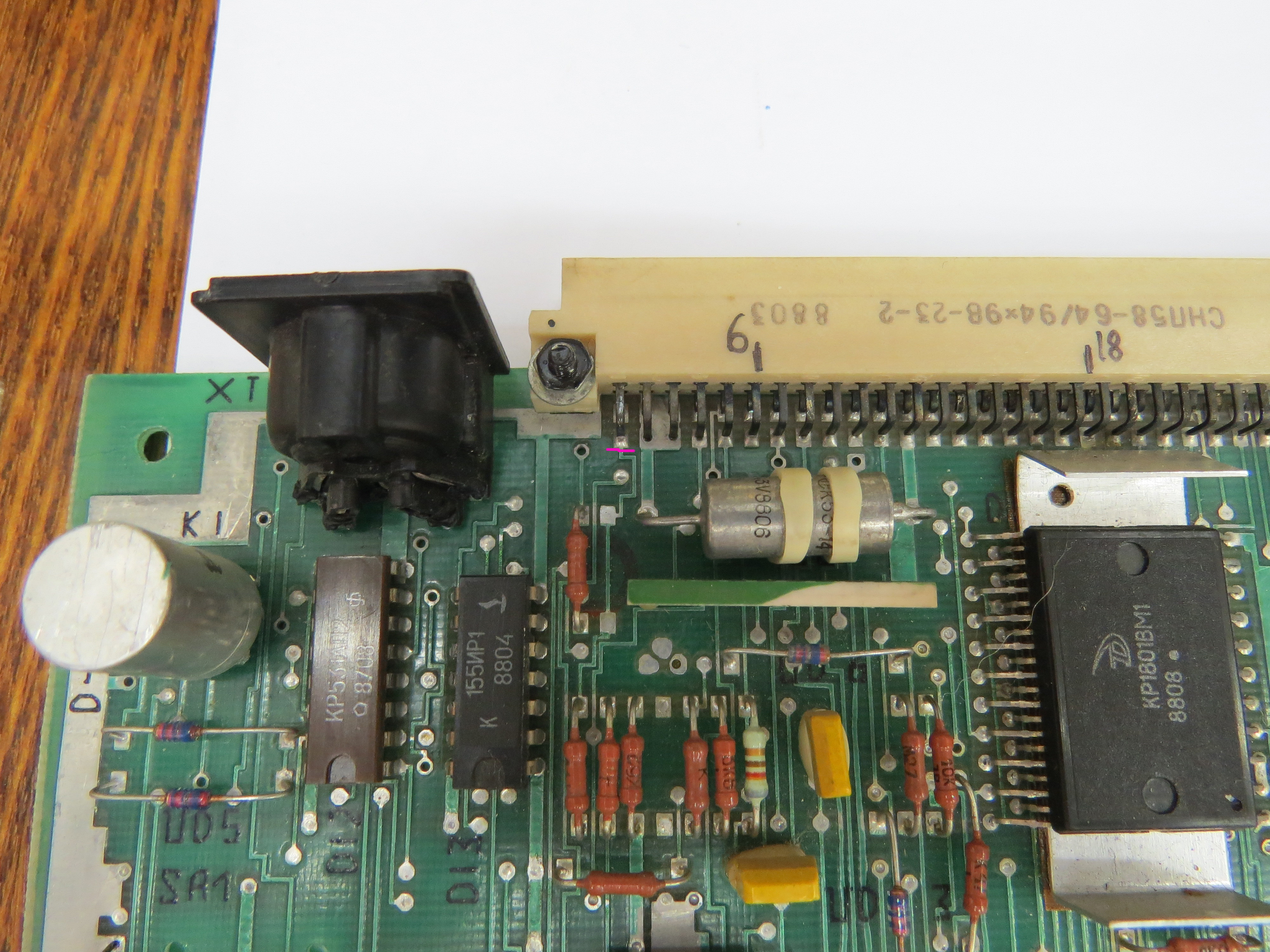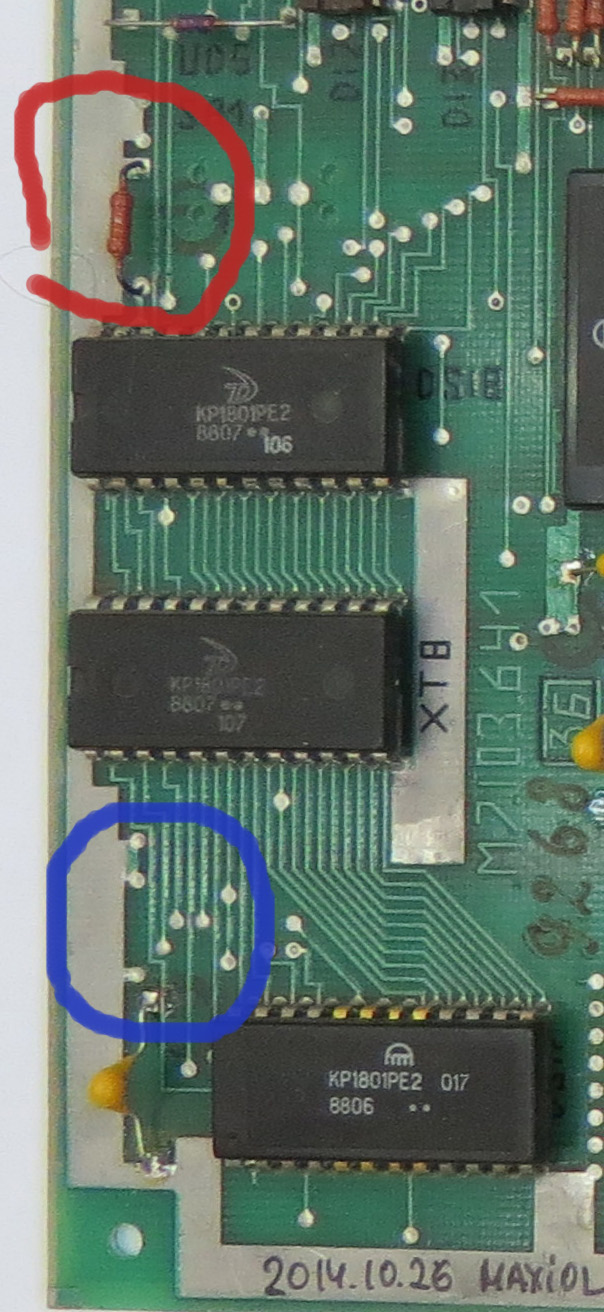 На БК0010-01 последней версии, выпускаемой заводом "Экситон" с 1991 года, возможно отключение монитора-ПЗУ БК и подключение на его место вторых 8 Кбайт ДОЗУ, что дает возможность внесения изменений в монитор БК, максимально надежного перехвата обращений программ к магнитофону за счет изменения содержимого ячейки 100036, загрузки любых экранных шрифтов и прочие возможности. БК-0010.01 выпущенные ранее тоже можно легко доработать добавив этот функционал: Для этого потребуется 1 резистор номиналом 1кОм и провод Для примера у нас есть вот такая плата Тут уже есть штатная доработка для отключения ПЗУ Бейсика - это хорошо видно по резистору выделенному красным А синим выделено место, для установки резистора нужного для отключения ПЗУ монитора, иначе говоря это уже планировалось, но почему-то не было реализовано Вот плата снизу и место где будет резистор нужный для отключения монитора Шаг первый - необходимо отрезать перемычку которая соединяет 23й пин ПЗУ с землей рез показан зеленым ![]() результат вот такой Шаг второй - впаиваем резистор, номинал 1кОм результат вот такой Шаг третий - припаиваем проводок он соединяет B1 и 23 ногу ПЗУ 017 * Опционально: если Б1 уже имеет соединение с Б8 то необходимо отключить его режем вот тут Доработка очень проста и ее легко можно сделать самостоятельно любому БКшнику Данная доработка используется контроллерами SMK-512 и AZБК -------------------- Живы будем - Не помрем !