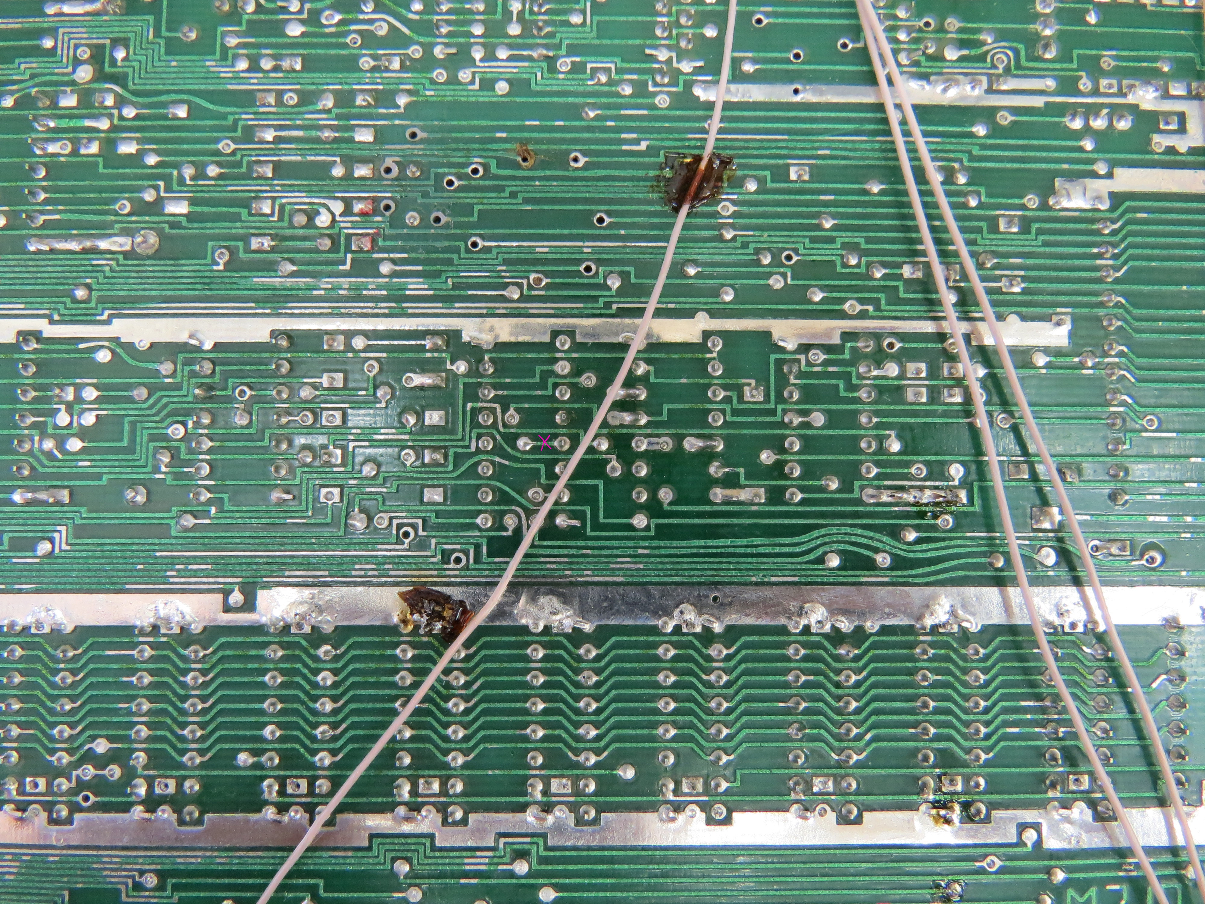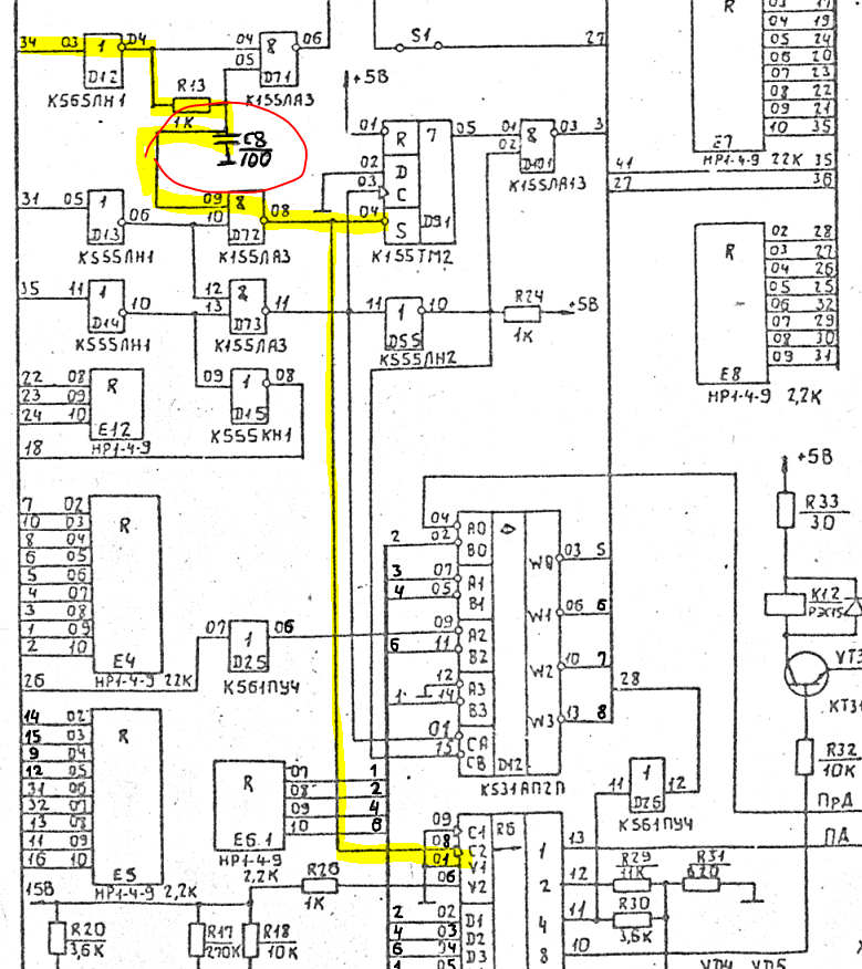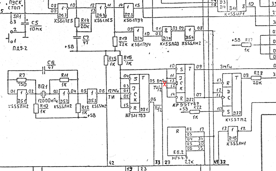 припомнил, как я делал это в начале 90х сначала посмотрим на схему D8.2 делит входную частоту на 2 и обе фазы используются соответственно правильно разрезать тут - см крестик те подать на 13й вход иную частоту - сейчас там штатные 6MHz с делителя на D8.1 соответственно режем дорожку - см фото - по крестику и соединяем 13й с 1м D8 - получаем стабильные чистые 6MHz! важно для понимания, форма тактовой частоты подаваемой на процессор имеет значение и потому переключатели частоты установленные прямо в пути сигнала нежелательны ибо будут нарушать его форму тк до переключателей будут еще и длинные провода какие возможны проблемы при таком разгоне 1. регистр 177716 может не успевать получать данные. к примеру флаг нажатия кнопок может быть не обработан корректно. при этом внешняя клавиатура PS/2 через AZБК работает отлично. причина в RC цепочке - см схема лечить изменением сопротивления R13 или емкости С8 2. глюки и зависания. тут уже не тянет процессор, лечить его заменой. не все процессоры стабильно тянут такой разгон. также надо понимать, что внутри БК достаточно жарко и процессор нагревается до 70С по идее надо бы вентилятор внутрь БК встроить ;-) -------------------- Живы будем - Не помрем !