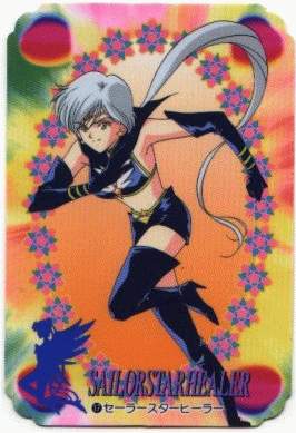 Имя-Сейя Коу(Seiya Kou) Значение имени-«Свет звёздной поляны» Имя воина-Сейлор Звёздная Воительница(Sailor Star Fighter) Возраст-16 лет Рост-165,1 см День рождения-30 июля Знак зодиака-Лев Группа крови-A(II) Цвет глаз-Синий Цвет волос-Чёрные волосы, завязанные в длинный хвост В группе-Вокалист Отношение к учёбе-Сейя начинает учиться почти так же, как Усаги и Макото(176 серия), но позже берётся за ум и улучшает свои показатели. Он не с большим рвением рвётся к получению знаний, отдавая себя полностью сражениям и людской жизни Любимый предмет в школе-Физическое обучение Нелюбимый предмет в школе-Литература Любимая еда-Гамбургер Близкий друг-Усаги, Какиу, Ятен и Таики (дружбой последних двух он особенно дорожит) Хобби-Игра в американский футбол Положение в команде-Скорее всего, Сейя является лидером Воинов Звёздного Света (наверное, из-за особых отношений с Принцессой, которые показаны только в аниме, в манге она только её защитник). Он ценит и уважает людей. Он полюбил Усаги с того момента, когда впервые увидел её. Сейя хочет отомстить Галаксии за уничтожение их родной планеты, а также хочет найти Принцессу Какиу. Он больше других хочет подружиться с защитниками Солнечной системы, поэтому СейлорМун тоже хочет стать его другом. В конце мультсериала, когда Сейя покидал Землю, он сказал ей, что никогда её не забудет. Неправильно думать, что Усаги не поняла его любви, наоборот она тоже любила его, но другой любовью, любовью друга Первое появление-Эпизод 173 Фраза при появлении -Yami wo kirissa sassurai no nagareboshi, Sailor StarFighter Stage on! Перевоплощение-Fighter Star Power, make up! (Звёздная сила Воителя, дай мне силу!) Сейя произносит фразу в свой наушечный микрофон (камера показывает его лицо в профиль). Затем поворачивается к нам лицом (камера показывает его грудь – грудь юноши) и на экране пролетают 3 яркие жёлтые звёзды, формируя его звёздную брошь. После этого красный свет формирует его женские груди, одновременно формируя её чёрный топик, превращая в девушку. Затем этот же красный свет опоясывает её талию, формируя чёрные шорты. Затем она поворачивается к нам лицом, стоя в форме креста и на её руках и ногах появляются чёрные перчатки и сапоги. Появляются снова 3 звезды, показывая её полностью одетой в форму. Она делает сальто назад и становится в боевую позу: вытянув в сторону правую руку, левую держа на бедре Атака-Star Serious Laser! (сила, движущая звезды!) Мы видим, как на тёмном звёздном фоне пролетает жёлтая звезда, оставляя после себя след. Она крутится и сзади неё виднеется тёмная фигура Воительницы. Затем по диагонали экрана прорезается небольшое окно, в котором мы видим уже её лицо. Прорезь исчезает, и мы видим, как перед Воительницей находится её амулет (белая звезда с каким-то драгоценным камнем внутри и двумя крылышками), который начинает мигать. Она схватывает его обеими руками, резко правой рукой поднимает над собой и выкрикивает фразу. После этого несколько ярких лучей собираются в этот амулет, и она резко направляет его на врага. Из амулета выстреливает огромный белый луч (лазер). СЕЙЛОР ЗВЁЗДНАЯ ТВОРИТЕЛЬНИЦА Имя-Таики Коу(Taiki Kou) Значение имени-"Свет воздуха" Имя воина-Сейлор Звёздная Творительница(Sailor Star Maker) Возраст-16 лет Рост-187,96 см (самая высокая из всех воинов) День рождения-30 мая Знак зодиака-Близнецы Группа крови-AB(IV) Цвет глаз-Сине-фиолетовые Цвет волос -Коричневые волосы, завязанные в 