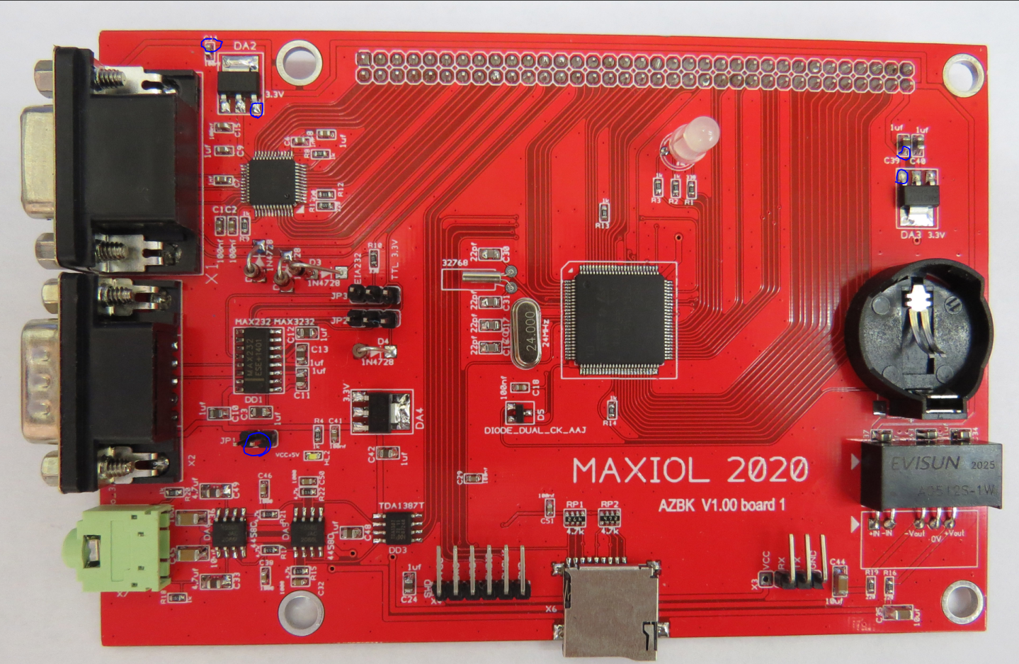 так AZБК кушает 600ма, то при длинных или тонких проводах питания к БК, напряжение может просесть и будут наблюдаться различные глюки вот тут на фото синим обведены точки где можно проводить измерения шины +5В измерение проводится относительно общего провода - к примеру корпусов металлических разъемов VGA и RS232 номинальное напряжение на вышеуказанных точках - не менее 4.8В и не более 5.0В -------------------- Живы будем - Не помрем !