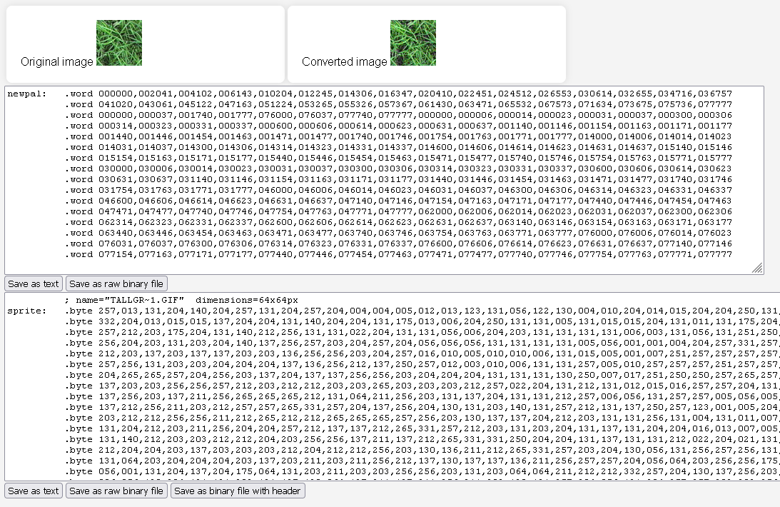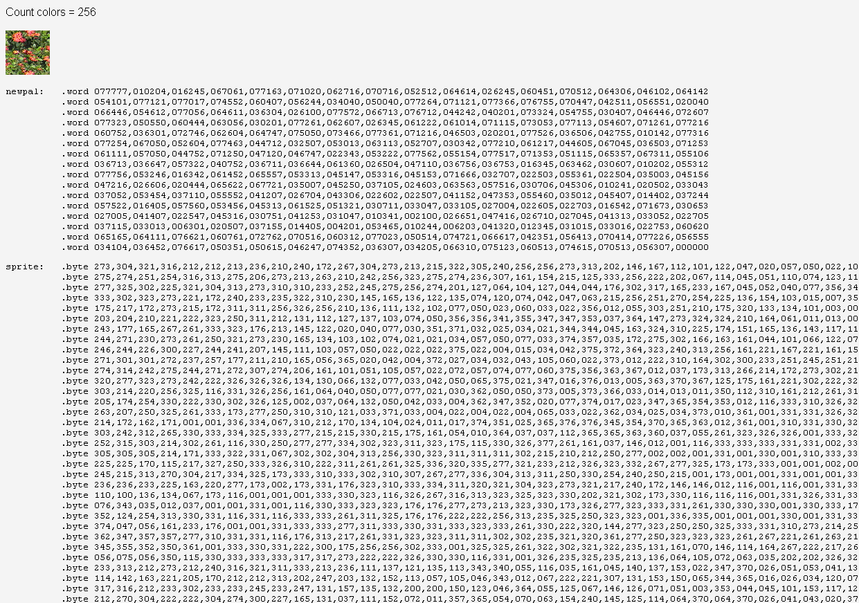 Кол-во скачиваний: 1518открываете GIF-ку и сохраняете ее кадры в PNG Важные моменты: - палитра в GIFке может быть локальной - иначе говоря в каждом кадре - своя соответственно надо сделать глобальную палитру тк перезагрузка всей палитры это достаточно ресурсоемкая процедура (пересылка 512 слов в регистры) Конвертер картинок в код - "как есть", те он извлекает палитру и саму картинку на вход подаем картинку 256цветов - на выход получаем два текстовых блока - значения для палитр и сам спрайт ![]() блок загрузки палитр есть в примере №3 Конвертер картинок в WEB SAFE палитру (почти тк я туда добавил еще 32 градации серого) на вход подаем картинку до 256цветов включительно - на выход получаем два текстовых блока - значения для палитр - оно для всех картинок будет одинаковым и сам спрайт, цвета которого скорректированы для этой палитры ![]() этот конвертер интересен тем что можно готовить разный графический материал (множество спрайтов фонов итд итп) в единую палитру в конвертере есть кнопки сохранения текстовых и бинарных файлов (они уже сразу в big-endian упаковке байтов) вариант сохранения спрайта в формате с заголовком отличается от простого бинарного тем что в начале идет слово размера по горизонтали, затем слово высоты по горизонтали (в пикселях) Конвертер использовался для подготовки примера №4 Подготовка информации в Photoshop так как возникли вопросы по предварительной конвертации картинок то подсвечу важные моменты: 1. исходная картинка как правило в true color ![]() 2. конвертируем ее в indexed color ![]() 3.вот так - выбираем WEB safe палитру и нажимая галку preview видим что меняется ![]() и при необходимости можем поправить цвета до конвертации или выбрать дизеринг Подготовка 16ти цветных картинок Для начала посмотрим на штатную палитру номер цвета - десятичный, коды палитры dec, hec и oct - что удобнее технически штатная палитра это стандартный 16ти цветный набор но конечно который можно менять как угодно Подготовка монохромных картинок подготовка монохромной картинки, явных ограничений на видеорежим нет Picture converter to text format for AZBK (mono) -------------------- Живы будем - Не помрем !