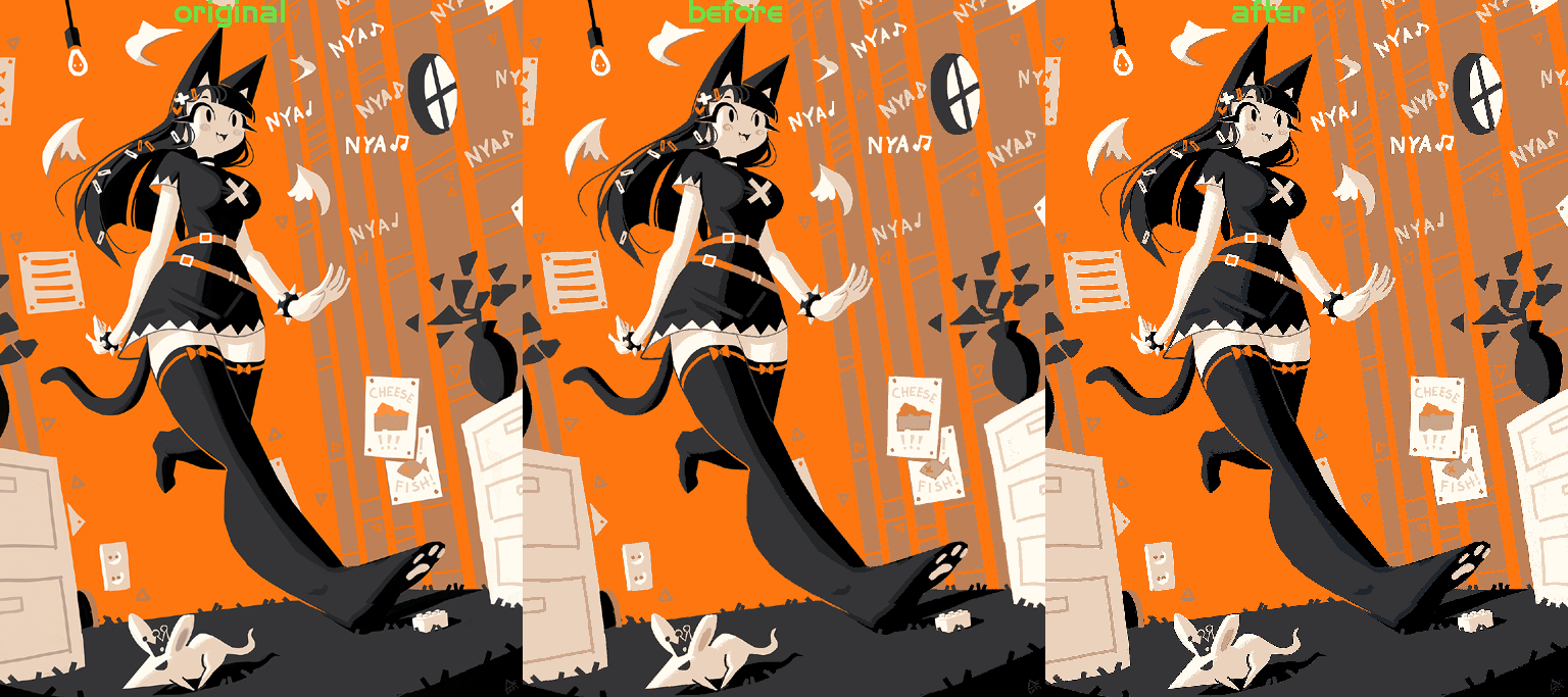 Для уменьшения количества цветов удобно использовать линейку Adobe Photoshop Технология проста - открываем картинку, выбираем Image/Mode/Indexed color ![]() тут вводим 16ть цветов которые мы хотим получить и обязательно убираем галку Transparency (иначе она съест один цвет) нажимая на галочку Preview - мы можем увидеть отличия - что было до и что стало теперь обратим внимание на выбор локальной палитры - тут есть 3 варианта локальной палитры Perceprual Selective Adaptive выбираем ту в которой мы получаем лучшую картинку (как правило это Selective но возможны варианты) Теперь сравним порядок ресайза исходная картинка это 1280х1707 - нам это много соответственно надо сделать меньше - к примеру нам подойдет 512х683 но возникает вопрос - когда же изменять количество цветов ? профессионалы, конечно знают, но я явно подсвечу различия слева - оригинал только resize в 512х683 в середине сначала resize в 512х683 а потом indexed color справа - сначала indexed color а уже потом resize в 512х683 вывод прост - вся обработка графики делается ДО уменьшения количества цветов, это финальный этап подготовки графики для сохранения результата нам нужен формат который понимает 16ти цветную картинку и при этом еще поддерживается софтом - это GIF вот к примеру картинка с которой можно будет работать дальше - вывести ее на БК в видеорежиме 1024х768х4bit Однако для красивого примера, картинка таки великовата - вырезаем кусочек и ресайзим в 256x192 и затем уже приводим 16ти цветной палитре результат конечно же сохраняем в GIF ![]() Займемся конвертацией картинки в удобный для обработки на БК формат идем сюда https://master.pdp-11.ru/picword16/picword.php загрузим картинку ![]() Получим результат тут есть и палитра, сверху выводится легенда палитры - дабы можно было легко посмотреть где какой цвет в окне ниже - хекс вывод картинки, он удобен для восприятия тк цвет 4х битный по нажатию кнопок можно получить бинарные варианты или в восьмеричной системе Теперь напишем программу которая выведет данную картинку