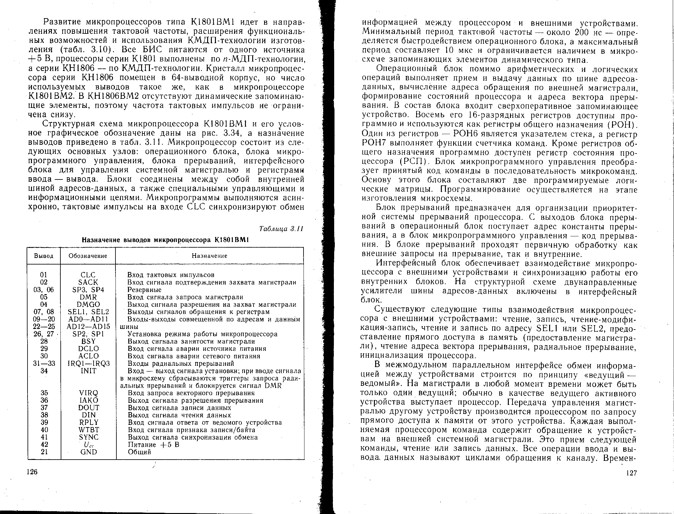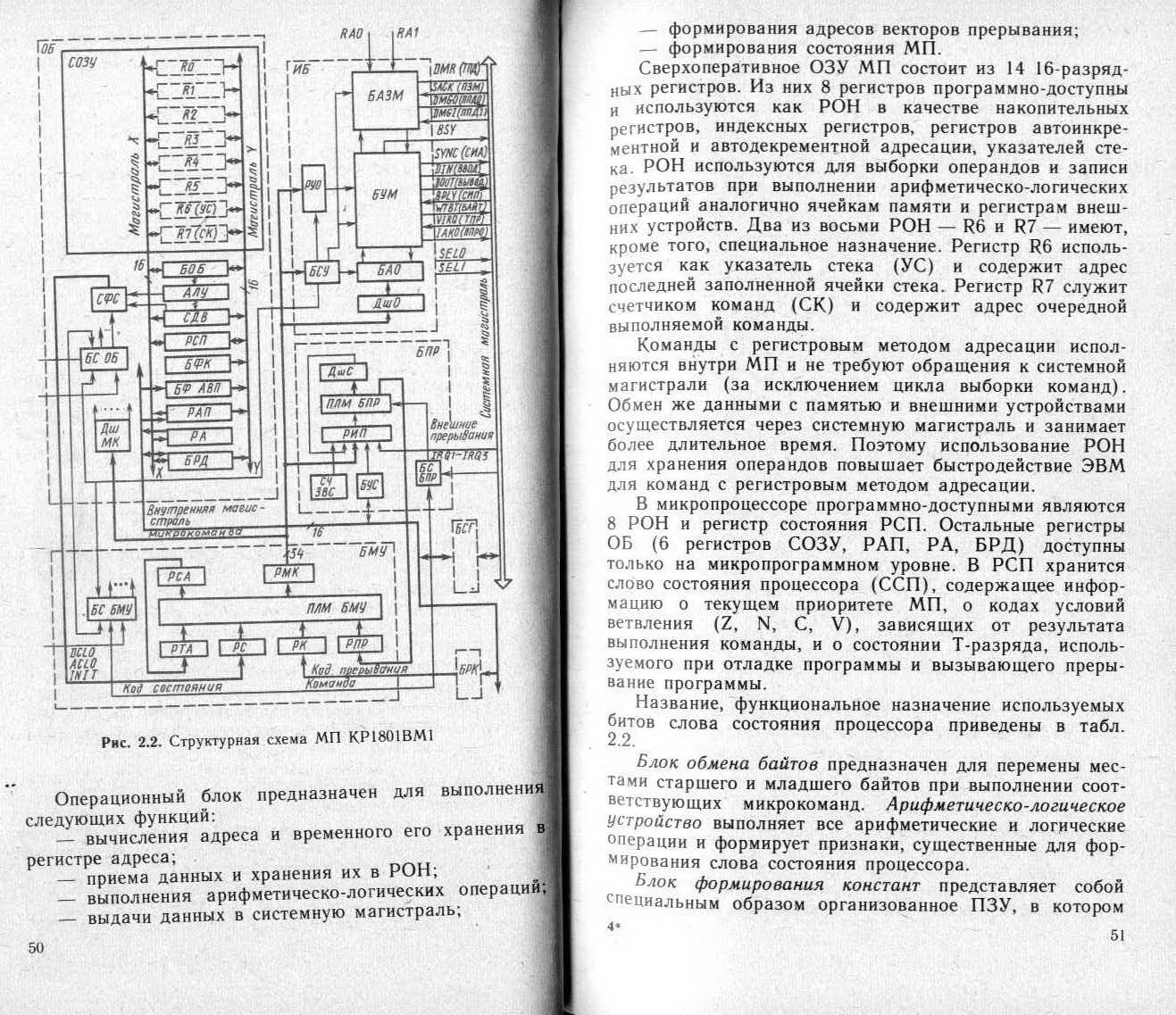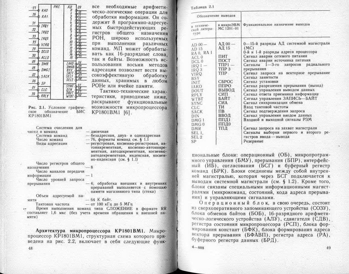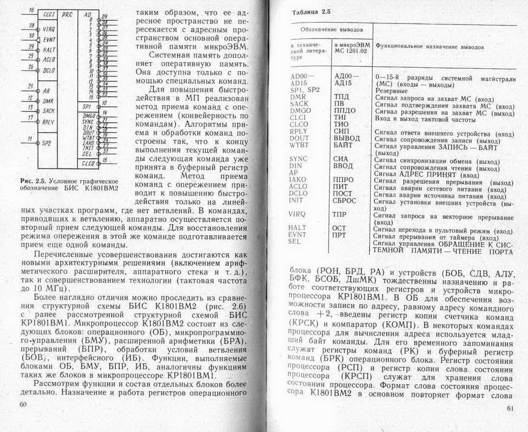 Код PDP11 - СОВМЕСТИМЫХ МИКРОПРОЦЕССОРОВ <Last correction : Date 20/12/89 Time 06:01:14> Описание процессоров серии 1801/1806. Внимание! Обе серии имеют большой набор БИС обвязки, реализованных на универсальных вентильных матрицах 1801ВП1 и 1806ВП1, среди которых есть: контроллеры клавиатуры, контроллеры графики, схемы управления памятью, в том числе со встроенным контролем по Хэммингу, контроллеры последовательных и параллельных интерфейсов, контроллеры дисководов, таймеры и другие устройства. Набор ПЗУ 1801РЕ2 содержит программы пультового терминала, поддержки реализации дополнительных команд, другие программы. Специально под шину QBUS разработано ППЗУ 573РФ3. Информация о прошивках ПЗУ имеется в файле 1801RE.DOC, о прошивках матричных БИС - в файле 1801VP.DOC. Имеются ППЗУ с электрической сменой информации и интерфейсом QBUS. Как дополнение серии 1801 разработана серия 1809. В ней отсутствует процессор, но есть многоканальные коммутаторы, контроллеры клавиатуры, видеоконтроллеры, контроллер накопителя на магнитофоне, контроллеры последовательных каналов, байтовый программируемый интерфейс, статическое ОЗУ 1кХ16 с циклом 400 нс, интерфейсом QBUS и программируемыми старшими разрядами адреса, масочные ПЗУ. Указанные серии совместимы и могут использоваться совместно с сериями 588,1811,1802,1804. 1801ВМ1 16-разрядный микропроцессор технология n-MOS, быстродействие до 500-600 тыс. регистровых сложений/с тактовая частота 100 кГц - 6 МГц напряжение питания +5В+-10% потребляемая мошность до 1.2 Вт входное напряжене 0..Uип емкость нагрузки <100 пФ электростатический потенциал <100В корпус металлокерамический 42-выводный 429.42-5 системная магистраль МПИ (QBUS) 69 команд: базовый набор +XOR+SOB(+MUL для 1801ВМ1Г) 8 регистров обшего назначения 4 уровня запросов прерываний адресное пространство 64 Кбайт имеются аппаратные средства построения многопроцессорных систем с числом процессоров до 4. Цоколевка: 1 CLCI вх вход тактовой частоты 2 SACK вх/вых подтверждение захвата ПДП 3 DMGI вх вход предоставления ПДП 4 DMGO вых выход предоставления ПДП 5 DMR вх/вых требование ПДП 6 ? вх назначение неизвестно. Соединить с +5 7 SEL1 вых выборка первого внешнего регистра 8 SEL2 вых -"- второго 9 AD0 вх/вых разряд шины адреса-данных 10 AD1 вх/вых разряд шины адреса-данных 11 AD2 вх/вых разряд шины адреса-данных 12 AD3 вх/вых разряд шины адреса-данных 13 AD4 вх/вых разряд шины адреса-данных 14 AD5 вх/вых разряд шины адреса-данных 15 AD6 вх/вых разряд шины адреса-данных 16 AD7 вх/вых разряд шины адреса-данных 17 AD8 вх/вых разряд шины адреса-данных 18 AD9 вх/вых разряд шины адреса-данных 19 AD10 вх/вых разряд шины адреса-данных 20 AD11 вх/вых разряд шины адреса-данных 21 GND обший 22 AD12 вх/вых разряд шины адреса-данных 23 AD13 вх/вых разряд шины адреса-данных 24 AD14 вх/вых разряд шины адреса-данных 25 AD15 вх/вых разряд шины адреса-данных 26 PA1 вх адрес процессора в системе 27 PA0 вх адрес процессора в системе 28 BSY вых занятость шины 29 DCLO вх авария источника питания 30 ACLO вх авария питаюшей сети 31 IRQ1 вх запрос радиального прерывания "пульт" 32 IRQ2 вх запрос прерывания от таймера, задний фронт, вект.100 33 IRQ3 вх запрос радиального прерывания,задний фронт, вект.270 34 INIT вх/вых сброс устройств на магистрали/сброс процессора 35 VIRQ вх требование векторного прерывания 36 IAKO вых предоставление прерывания 37 DOUT вых сопровождение записи 38 DIN вых сопровождение чтения 39 RPLY вх ответ пассивного устройства 40 WTBT вых запись/байт 41 SYNC вых синхронизация а