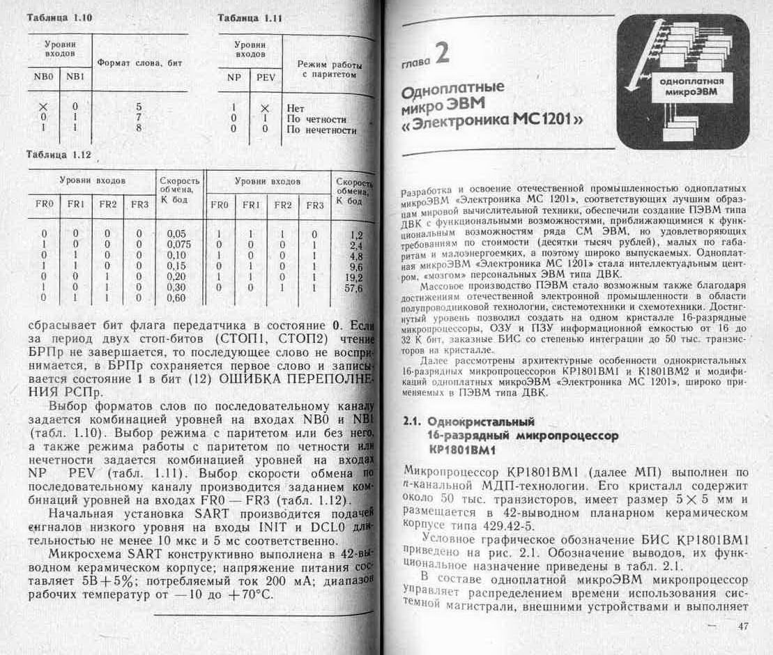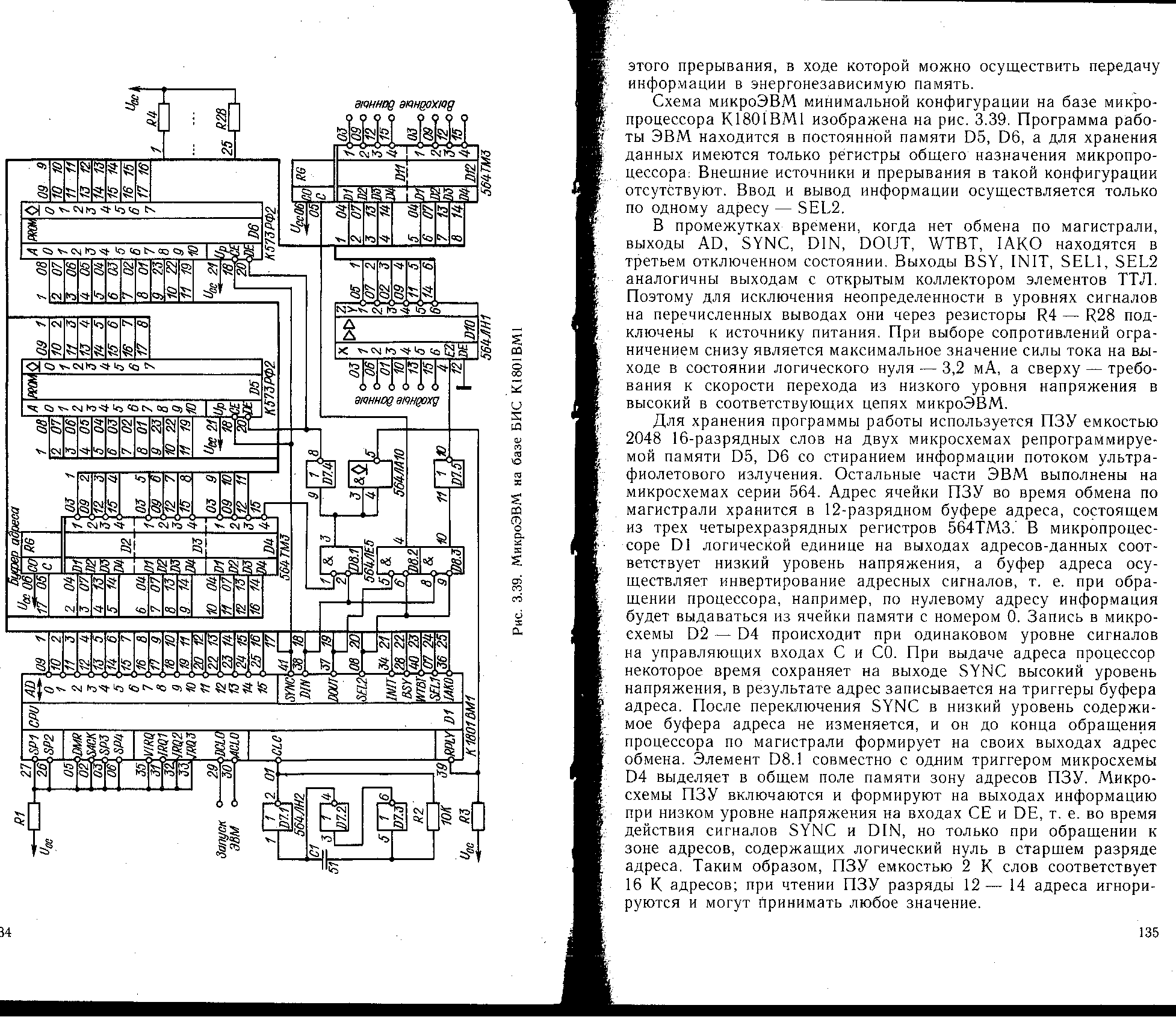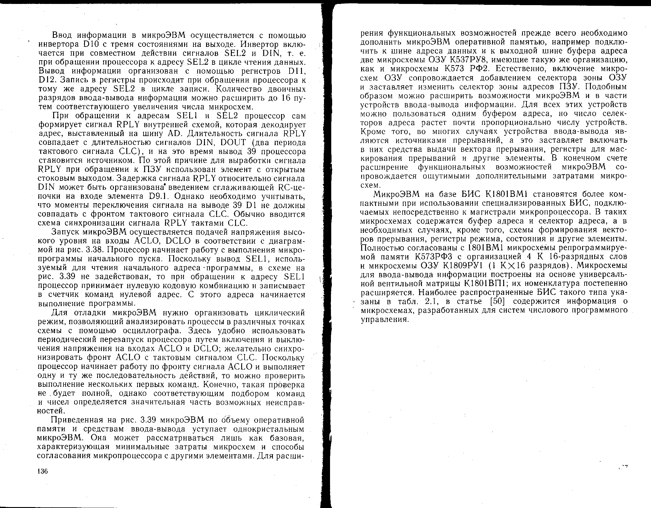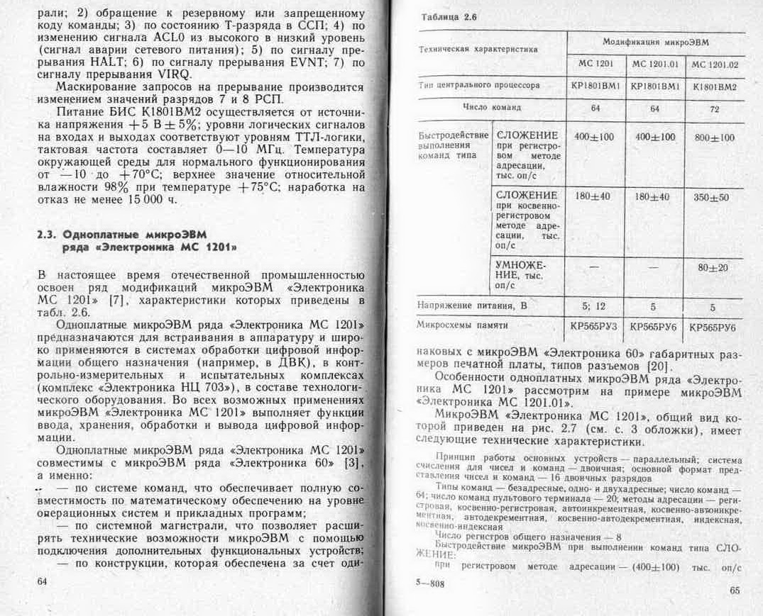 Код PDP11 - СОВМЕСТИМЫХ МИКРОПРОЦЕССОРОВ <Last correction : Date 20/12/89 Time 06:01:14> Описание процессоров серии 1801/1806. Внимание! Обе серии имеют большой набор БИС обвязки, реализованных на универсальных вентильных матрицах 1801ВП1 и 1806ВП1, среди которых есть: контроллеры клавиатуры, контроллеры графики, схемы управления памятью, в том числе со встроенным контролем по Хэммингу, контроллеры последовательных и параллельных интерфейсов, контроллеры дисководов, таймеры и другие устройства. Набор ПЗУ 1801РЕ2 содержит программы пультового терминала, поддержки реализации дополнительных команд, другие программы. Специально под шину QBUS разработано ППЗУ 573РФ3. Информация о прошивках ПЗУ имеется в файле 1801RE.DOC, о прошивках матричных БИС - в файле 1801VP.DOC. Имеются ППЗУ с электрической сменой информации и интерфейсом QBUS. Как дополнение серии 1801 разработана серия 1809. В ней отсутствует процессор, но есть многоканальные коммутаторы, контроллеры клавиатуры, видеоконтроллеры, контроллер накопителя на магнитофоне, контроллеры последовательных каналов, байтовый программируемый интерфейс, статическое ОЗУ 1кХ16 с циклом 400 нс, интерфейсом QBUS и программируемыми старшими разрядами адреса, масочные ПЗУ. Указанные серии совместимы и могут использоваться совместно с сериями 588,1811,1802,1804. 1801ВМ1 16-разрядный микропроцессор технология n-MOS, быстродействие до 500-600 тыс. регистровых сложений/с тактовая частота 100 кГц - 6 МГц напряжение питания +5В+-10% потребляемая мошность до 1.2 Вт входное напряжене 0..Uип емкость нагрузки <100 пФ электростатический потенциал <100В корпус металлокерамический 42-выводный 429.42-5 системная магистраль МПИ (QBUS) 69 команд: базовый набор +XOR+SOB(+MUL для 1801ВМ1Г) 8 регистров обшего назначения 4 уровня запросов прерываний адресное пространство 64 Кбайт имеются аппаратные средства построения многопроцессорных систем с числом процессоров до 4. Цоколевка: 1 CLCI вх вход тактовой частоты 2 SACK вх/вых подтверждение захвата ПДП 3 DMGI вх вход предоставления ПДП 4 DMGO вых выход предоставления ПДП 5 DMR вх/вых требование ПДП 6 ? вх назначение неизвестно. Соединить с +5 7 SEL1 вых выборка первого внешнего регистра 8 SEL2 вых -"- второго 9 AD0 вх/вых разряд шины адреса-данных 10 AD1 вх/вых разряд шины адреса-данных 11 AD2 вх/вых разряд шины адреса-данных 12 AD3 вх/вых разряд шины адреса-данных 13 AD4 вх/вых разряд шины адреса-данных 14 AD5 вх/вых разряд шины адреса-данных 15 AD6 вх/вых разряд шины адреса-данных 16 AD7 вх/вых разряд шины адреса-данных 17 AD8 вх/вых разряд шины адреса-данных 18 AD9 вх/вых разряд шины адреса-данных 19 AD10 вх/вых разряд шины адреса-данных 20 AD11 вх/вых разряд шины адреса-данных 21 GND обший 22 AD12 вх/вых разряд шины адреса-данных 23 AD13 вх/вых разряд шины адреса-данных 24 AD14 вх/вых разряд шины адреса-данных 25 AD15 вх/вых разряд шины адреса-данных 26 PA1 вх адрес процессора в системе 27 PA0 вх адрес процессора в системе 28 BSY вых занятость шины 29 DCLO вх авария источника питания 30 ACLO вх авария питаюшей сети 31 IRQ1 вх запрос радиального прерывания "пульт" 32 IRQ2 вх запрос прерывания от таймера, задний фронт, вект.100 33 IRQ3 вх запрос радиального прерывания,задний фронт, вект.270 34 INIT вх/вых сброс устройств на магистрали/сброс процессора 35 VIRQ вх требование векторного прерывания 36 IAKO вых предоставление прерывания 37 DOUT вых сопровождение записи 38 DIN вых сопровождение чтения 39 RPLY вх ответ пассивного устройства 40 WTBT вых запись/байт 41 SYNC вых синхронизация а