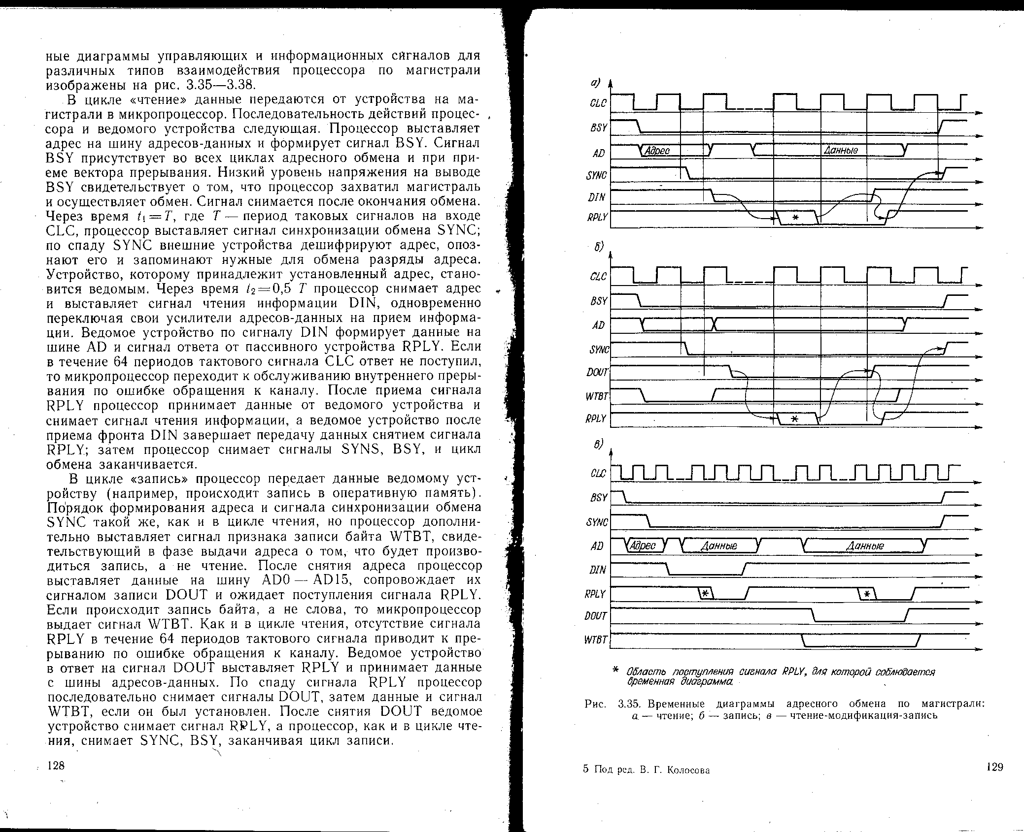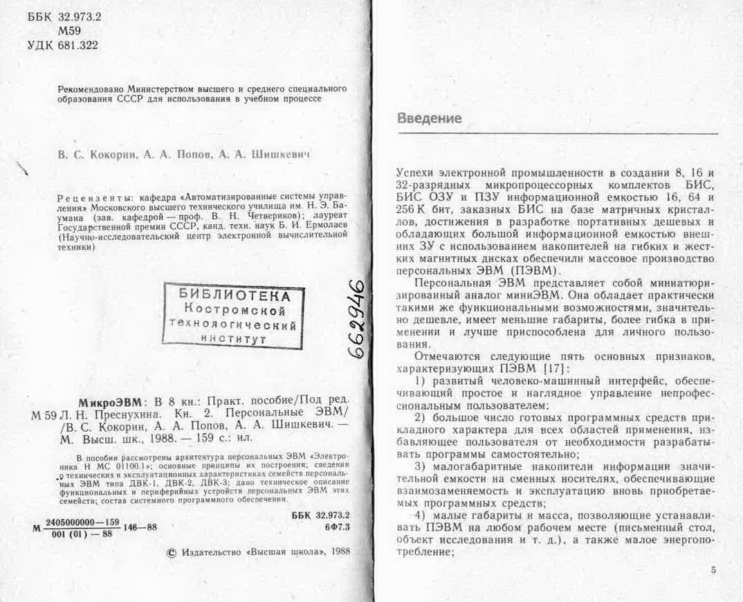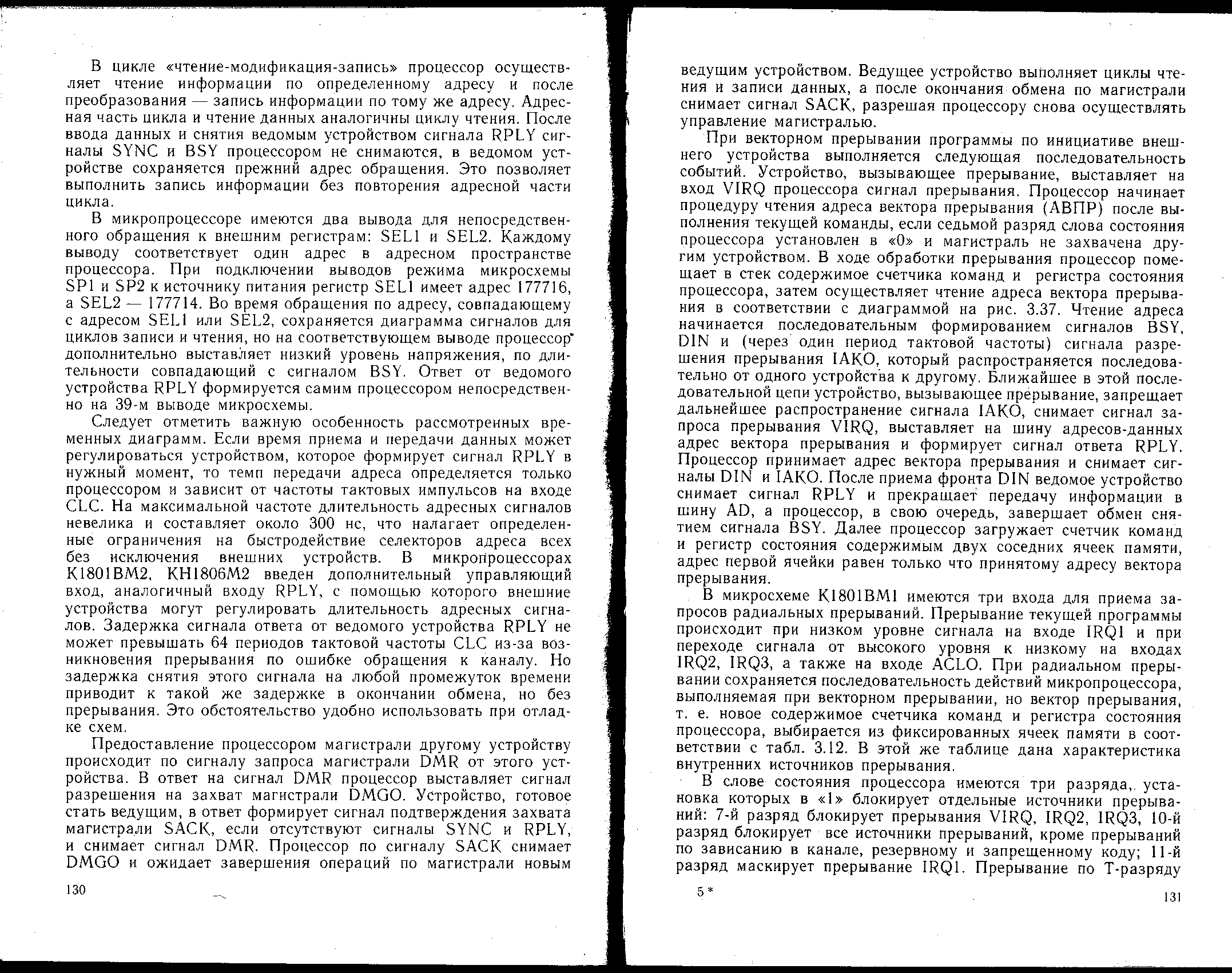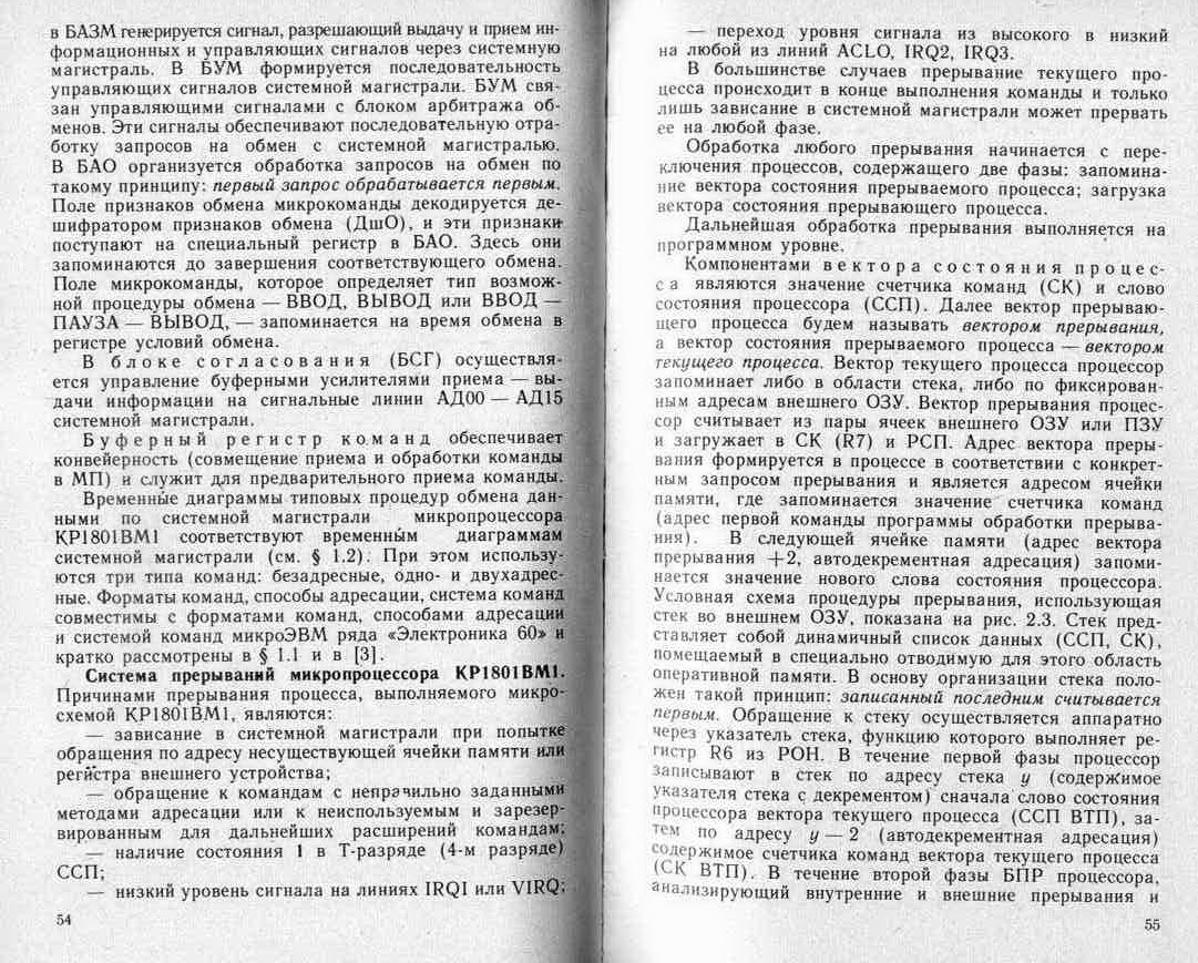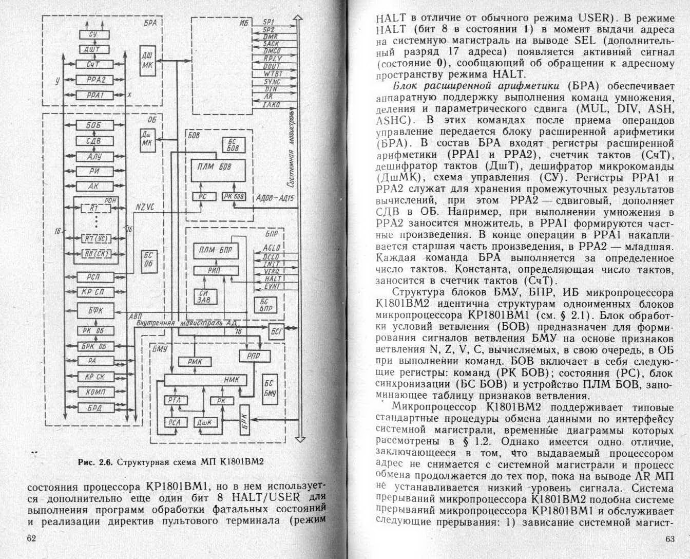 Код Микропроцессор К1801 ВМ1. Микропроцессор К1801 ВМ1 представляет собой одно кристальный 16-разрядный модуль. Этот конструктивно и функ ционально законченный модуль реализует систму команд микро ЭВМ "Электроника 60", обспечивает управление системным ин терфейсом , аналогичным по составу управляющих сигналов и алгоритмам обмена системному интерфесу микроЭВМ. 16-разрядный операционный блок включает в себя арифме тическо-логическое устройство , секцию из 8 регистров обще го назначения, регистр состояния процессора. Операционный блок осуществляет формирование адресов команд и операндов, прием данных с внутренней магистрали , выполнение арифмети ческих и логических оперций, хранение операндов и результа та , выдачу в канал , формирование состояний процессора и адресов векторов прерывания. Секция регистров общего назначения содержит восемь 16-разрядных регистров , которые могут выполнять функции регистров хранения данных и адресов, индексных регистров, регистров автодекрементной и автоинрементной адресации, указателей стека . Регистры R6 и R7 являются специализиро ванными . Регистр R6 используется как указатель стека SP, а R7-только как счетчик команд РС. Кроме восьми программо-доступных регистров общего назначения операционный блок включает в себя , буферные ре гистры адресов данных , через которые осуществляется связь с внутренней магистралью процессора. Арифметическо-логичес кое устройство операционного блока формирует ряд признаков записываемых в регистр состояния процессора. Признак I/O определяет приоритет выполняемой программы по прерыванию внешних устройсв . Прерывание программы со стороны внешних устройств запрешено, если значение разряда 7 регистра состо яния процессора равно 1. С целью упрощения отладки програм мы в любой ее точке командой записи слова состояния процес сора в Т-разряд может быть записана 1. Это превидет к пре рыванию программы с адресом вектора прерывания 14(переход на программу связи с оператором). Остальные разряды регист ра состояния процессора хранят признаки результата операци и в арифметическо-логическом устройстве , используемые в командах ветвления программы. Установка признаков произво дится в следующих случаях :N=1, если результат отрицателен; Z=1, если результата равен 0;V=1 , если при выполнении ари фметической операции произошло переполнение;C=1 ,если про изошел перенос из старшего разряда арифметическо-логическо го устройства , сдвиг единицы из старшего разряда влево или из младшего разряда вправо. Слово состояния процессора может быть считано и вновь записано в регист состояния про цессора с помощью спциальных команд. При выполнении команд передачи управления содержимое регистра состояния сохрани ется в стеке. Структурная схема . |-------------| |---------------| Шина | Блок | | Операционный | -----| системный |--|-| блок | AD0- | магистрали | | |--------|------| AD15 |-------------| | | |----------| |-------| |----------| Интер- | | | | фейсный | ---------|--------| |----|------| | блок | | Блок | | Блок | |----------| INIT | | | прерываний| -------| микропрограм | |-|-|-|-|-|-| | ного управления | | | | | | | |-------|---------| | | | | | | | | | | | | | |--------|-------| | | | | | | SLC |--Схема | | | | | | | -------| тактирования | | | | | | | |----------------| | | | | | | | | | | | | ACLO | | | | | | ------------| | | | | | DCLO --------------| | | | | VIRQ ----------------| | | | IRQ1 ------------------| | | IRQ2 -----------------| | IRQ3 ----------------| Обозначения на структурной схеме: AD0-AD15 -шина "Адрес/Данные" INIT- Инициализация вычислител