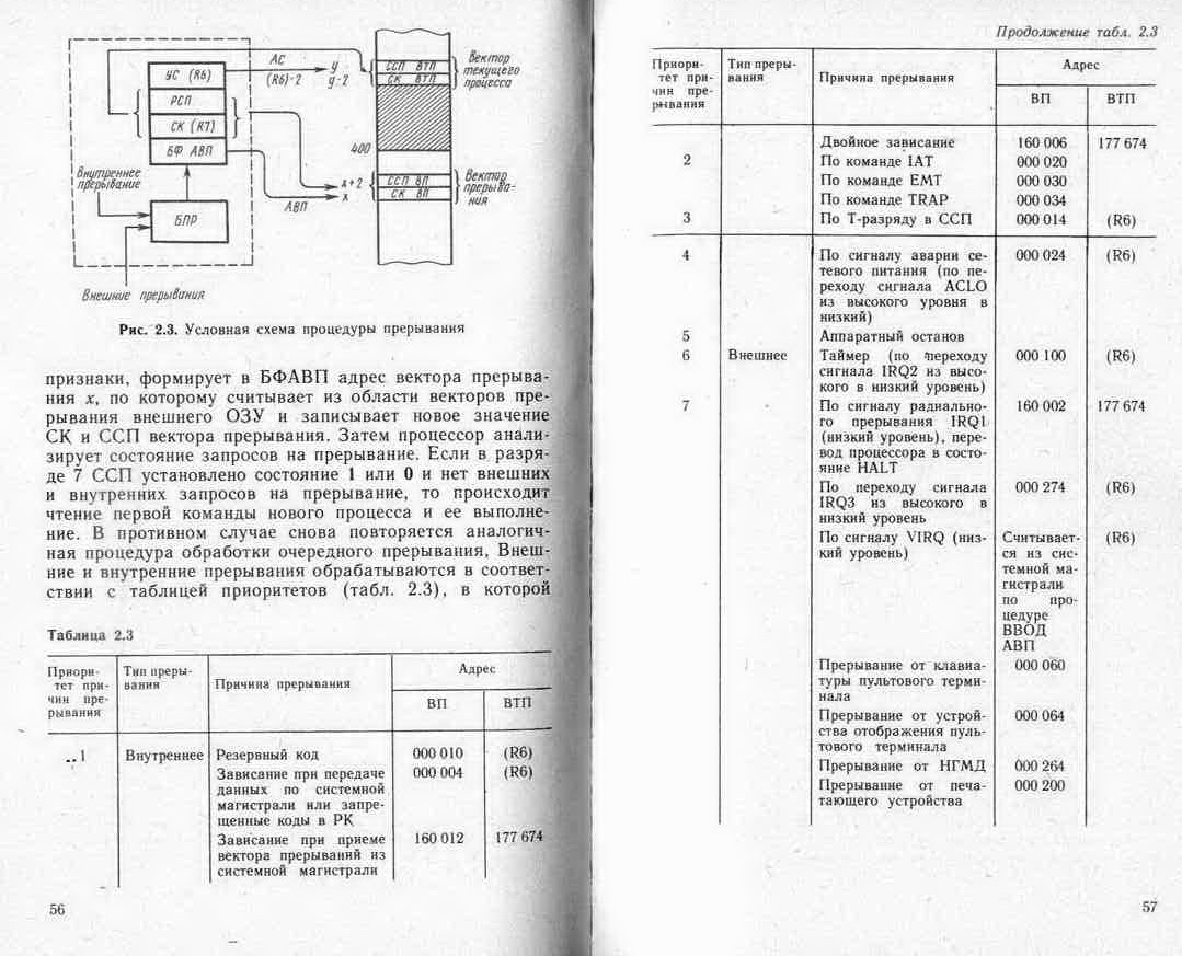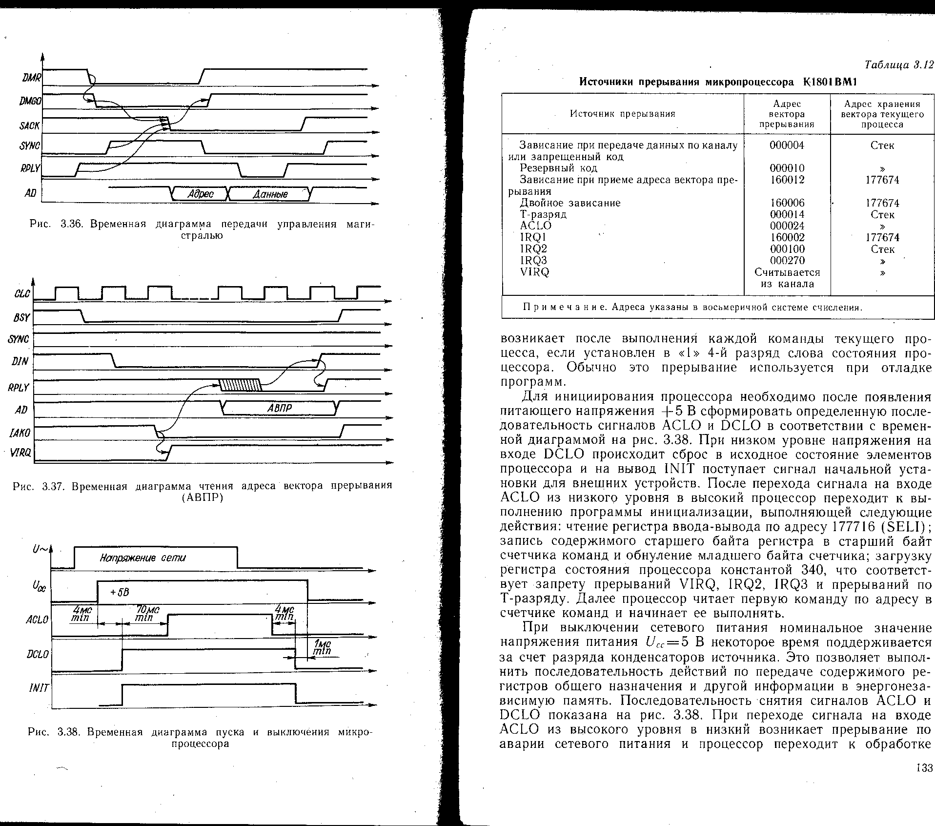 Код BIS #10,@#177716 ; для отключения пользовательского ПЗУ и подключения ПЗУ с отладчиком, которого в БК нет. MFPS @#177676 ; сохранение вектора текущего процесса MOV PC,@#177674 ; --//-- MOV @#(SEL1[разряды 8-15]+C), PC ; переход к обработчику MTPS @#(SEL1[разряды 8-15]+C+2) ; исключительных ситуаций Поскольку регистры 177674,177676 в БК не реализованы, при записи в них возникают ошибка шины и прерывание по вектору 4. Но благодаря тому, что процессор успел попытаться выставить бит 3 в регистре SEL1, при следующем прочтении SEL1 бит признака записи в системный регистр 2 в нем будет установлен в "1". Этим можно воспользоваться для того, чтобы отличить прерывание по нажатию СТОП от ошибок шины. Переход по векторам обработчиков исключительных ситуаций, лежащих за адресом перезапуска, в БК-0010 невозможен, поэтому эти адреса памяти использованы в БК-0010 иначе. Ниже - выбранные цитаты из книги "Микро-ЭВМ "Электроника МС 1201" Техническое описание и инструкция по эксплуатации" Т.е. это описание, как подключение 1801ВМ1 сделано в ДВК (выборка информации только для ВМ1, у ВМ2 всё совершенно по другому) Устройство управления ОЗУ (УОЗУ) выполнено на основе микросхемы К1801ВП1-030.У ДВК-1 - фактически 64КБ ОЗУ (32 шт. 565РУ6). Но ВП1-030 "вырезает" из ОЗУ старшие 8К и размещает там: кусочки памяти, кусочки системного ПЗУ и оставляет место для регистров ввода/вывода. Область СОЗУ (177600...177767) предназначена для хранения информации программ пультового режима работы и режима начального пуска. Регистр режима начального пуска (РНП) предназначен для указания адреса программы начального пуска, а также для хранения "флажков" Ф1 (бит 2) и Ф2 (бит 3) управления скрытыми областями СПЗУ. Разряды Ф1 и Ф2 доступны по чтению и по записи. Если Ф1=1, то открывается по доступу в адресном пространстве скрытая область СПЗУ по адресам от 160000 до 163776 и закрывается соответствующая область а вдресном пространстве регистров внешних устройств. При Ф2=1 скрытая область СПЗУ расширяется до адреса 172766. Разряды 0 и 1 РНП доступны только по чтению и определяют режим начального пуска микро-ЭВМ. "00" - пуск через вектор по адресу 24 (сбой по питанию) "01" - безусловный выход на программу связи с пультом "10" - переход на программу начального загрузчика 173000 "11" - переход по адресу 140000 (ПЗУ пользователя) Область СПЗУ от 173000 до 173776 (область загрузчика) всегда открыта для пользователя и не зависит от состояния разрядов Ф1 и Ф2. Разряды 8...15 РНП определяют адрес програмы начального пуска (160000) микро-ЭВМ (младший байт адреса принимается равным 0). Адреса РНП - 177716, СОЗУ - 177600...177676 и резервных регистров - 177700...177714 являются адресами системных (служебных) ячеек, используемых для организации микро-ЭВМ, которые не рекомендуется использовать в программах пользователя. -------------------- Живы будем - Не помрем !