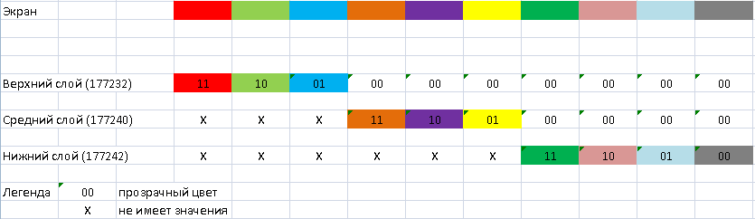 визуальный калькулятор видеорежимов тут теперь вот так: 177230 - регистр управления 177232 - регистр номера страницы начала отображения - верхняя страница (слой 0) 177240 - регистр номера страницы начала отображения - средняя страница (слой 1) "под спрайты" 177242 - регистр номера страницы начала отображения - нижняя страница (слой 2) "под фон" 177244 - регистр вертикального скролинга слой 2 177246 - регистр вертикального скролинга слой 1 177250 - регистр вертикального скролинга слой 0 177252 - регистр гозизонтального скролинга слой 0 177254 - регистр гозизонтального скролинга слой 1 177256 - регистр гозизонтального скролинга слой 2 Код РЕГИСТР УПРАВЛЕНИЯ ВИДЕОКОНТРОЛЛЕРОМ АДРЕС = 177230 ФОРМАТ РЕГИСТРА доступен по чтению и записи ┌──┬──┬──┬──┬──┬──┬──┬──┬──┬──┬──┬──┬──┬──┬──┬──┐ ┌────────────────────┐ │15│14│13│12│11│10│09│08│07│06│05│04│03│02│01│00│ │ 0 - 1 бит на цвет*│ └──┴──┴──┴──┴──┴──┴──┴──┴──┴──┴──┴──┴──┴──┴──┴──┘ │ 1 - 2 бита на цвет │ ║ ║ ║ │ │ │ │ │ │ ║ │ │ │ 2 - 4 бита на цвет │ ║ ║ ║ └───┤ └───┤ └───┤ ║ └───┴──┤ 3 - 8 бит на цвет │ ╠════════╝ ║ │ │ │ ║ └────────────────────┘ ║ ║ │ │ │ ║ ┌────────────────────┐ ║ ║ │ │ │ ╚═════════╡ =1 слоеный режим │ ║ ║ │ │ │ └────────────────────┘ ║ ║ │ │ │ ┌─────────────────────┐ ║ ║ │ │ └───────────┤ 0 - 32 слова │ ║ ║ │ │ │ 1 - 64 слова │ ║ ║ │ │ │ 2 - 128 слов │ ║ ║ │ │ │ 3 - 256 слов │ ║ ║ │ │ └─────────────────────┘ ║ ║ │ │ ┌─────────────────────┐ ║ ║ │ └────────────────────┤ 0 - х1 - 1024 точки │ ║ ║ │ │ 1 - х2 - 512 точки │ ║ ║ │ │ 2 - х3 - 256 точки │ ║ ║ │ │ 3 - х4 - 128 точки │ ║ ║ │ └─────────────────────┘ ║ ║ │ ┌───────────────────────────┐ ║ ║ └─┤ 0 - х1 - 768 строк │ ║ ║ │ 1 - х2 - 384 строк │ ║ ║ │ 2 - х3 - 256 строк │ ║ ║ │ 3 - х4 - 192 строк │ ║ ║ └───────────────────────────┘ ║ ║ ┌───────────────────────────┐ ║ ╚════════╡ Управление синхронизацией │ ║ │ =1 включена │ ║ └───────────────────────────┘ ║╔═════════════════════════╗ ╚╣ длина рулона в словах ║ ║ 0 6144 ║ ║ 1 8192 ║ ║ 2 12288 ║ ║ 3 16384 ║ ║ 4 24576 ║ ║ 5 32768 ║ ║ 6 49152 ║ ║ 7 65536 ║ ║ 8. 98304 ║ ║ 9. 131072 ║ ║ 10. 196608 ║ ║ 11. 262144 ║ ╚═════════════════════════╝ РЕГИСТР ОСНОВНОЙ (ВЕРХНЕЙ) СТРАНИЦЫ ОТОБРАЖЕНИЯ АДРЕС = 177232 ФОРМАТ РЕГИСТРА ┌──┬──┬──┬──┬──┬──┬──┬──┬──┬──┬──┬──┬──┬──┬──┬──┐ │15│14│13│12│11│10│09│08│07│06│05│04│03│02│01│00│ └──┴──┴──┴──┴──┴──┴──┴──┴──┴──┴──┴──┴──┴──┴──┴──┘ │ │ └──────────НОМЕР СТРАНИЦЫ ───────────┘ РЕГИСТР СРЕДНЕЙ СТРАНИЦЫ ОТОБРАЖЕНИЯ АДРЕС = 177240 ФОРМАТ РЕГИСТРА ┌──┬──┬──┬──┬──┬──┬──┬──┬──┬──┬──┬──┬──┬──┬──┬──┐ │15│14│13│12│11│10│09│08│07│06│05│04│03│02│01│00│ └──┴──┴──┴──┴──┴──┴──┴──┴──┴──┴──┴──┴──┴──┴──┴──┘ │ │ └──────────НОМЕР СТРАНИЦЫ ───────────┘ РЕГИСТР НИЖНЕЙ СТРАНИЦЫ ОТОБРАЖЕНИЯ АДРЕС = 177242 ФОРМАТ РЕГИСТРА ┌──┬──┬──┬──┬──┬──┬──┬──┬──┬──┬──┬──┬──┬──┬──┬──┐ │15│14│13│12│11│10│09│08│07│06│05│04│03│02│01│00│ └──┴──┴──┴──┴──┴──┴──┴──┴──┴──┴──┴──┴──┴──┴──┴──┘ │ │