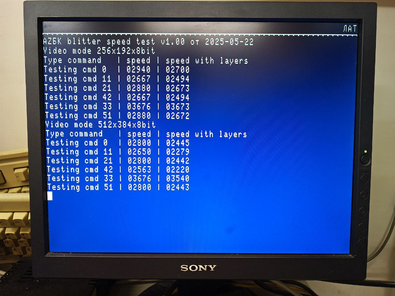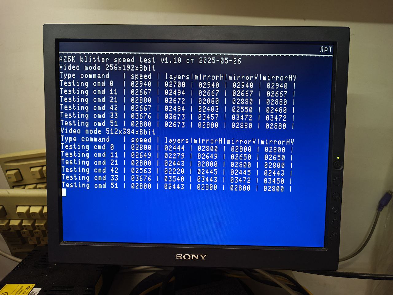cм https://forum.maxiol.com/index.php?s=&showt...indpost&p=58488 редакция от 2025-05-26 для прошивки 19b1 Блиттер в мой реализации есть робот читающий набор команд и выполняющих их по окончанию отображения кадра в отличии от классического блиттера в амиге, где команды подаются в режиме реального времени Примеры применения блиттера с исходниками вот ТУТ изначальные ограничения: 1. блиттер оперирует только словами, иначе говоря минимальная дискретность по горизонтали - 2пикселя (в видеорежиме 256цветов) *все расчеты в блиттере ведутся словами.* 2.команда блиттера - 8. слов 3. блиттер может работать в автоматическом или ручном режиме запуска. автоматический режим запуска производится по факту окончания отображения видимой части кадра. ручной запуск производится по факту установки бита 12 в регистре управления блиттером (177270) и при установленном бите 14. Бит 14 доступен и по чтению и по записи, тогда как бит 12 будет всегда читаться как 0. 4. после получения сигнала к запуску блиттера, он сначала читает пакет команд в память ПЛИС, а зачем начинает выполнять пакет команд. как только блиттер начал что-то делать, блиттер устанавливает флаг своей работы (занятости) - бит 15 в регистре управления блиттером (177270), данный бит доступен по чтению, записать туда не получится. Для организации конвейерной обработки, есть бит 9 который устанавливается во время чтения пакета команд в буфер и означает запрет на изменения в этом пакете. 5. блиттер работает в плоском адресном пространстве со словами 16бит и адресом 24 бита иначе говоря он видит всю память [расширенную - те 32МБ] сразу. 6. макс количество команд - 511. (нулевое количество команд = выключение блиттера) 8. макс количество слов в команде - те обрабатываемое в пакете - 256*256=65536 cлов 9. хранение исходных (SRC) спрайтов строго линейное и кратное 32м словам те спрайт должен начинаться с адреса кратному 100(8) 9. расположение целевых данных (DST) прямоугольное - те строка cпрайта (ширина спрайта) + строчная инкрементация. важно для понимания: ширина спрайта + строчная инкрементация = длина строки в данном видеорежиме. 10. максимальная шbрина спрайта - 256. слов 11. максимальная строчная инкрементация - 256. слов 12. максимальное количество строк - 256. 13. операции: - заполнение константой - копирование из SRC в DST (дискретность - слово) - наложение SRC на DST и помещение результата в DST при SRC!=константа прозрачного цвета (дискретность - байт) - наложение SRC на DST и помещение результата в DST при SRC!=константа прозрачного цвета и DST==константа прозрачного цвета (дискретность - байт) - копиирование из прямоугольного DST в линейный SRC (сохранение фона) (дискретность - слово) - NOP - пропуск команды что означает дискретность: слово - те операция всегда пишет слово (2 байта) байт - означает, что тут проверяется каждый байт на соответствие правил и пишутся только те байты которые выполнили условия иначе говоря наложение спрайта на фон будет без дефектов - те оно попиксельное! 14. под блок команд блиттера выделяется страница (технически любая cвободная, просто команды читаются с начала указанной в регистре страницы) иначе говоря набор команд можно быстро менять просто меняя номер страницы 15.После чтения строки команд в буфер ПЛИС, регистр номера страницы можно менять как угодно это сделано для того чтобы пока одна пачка команд выполняется, можно было подготовить новую пачку команд. для индикации есть бит 9 