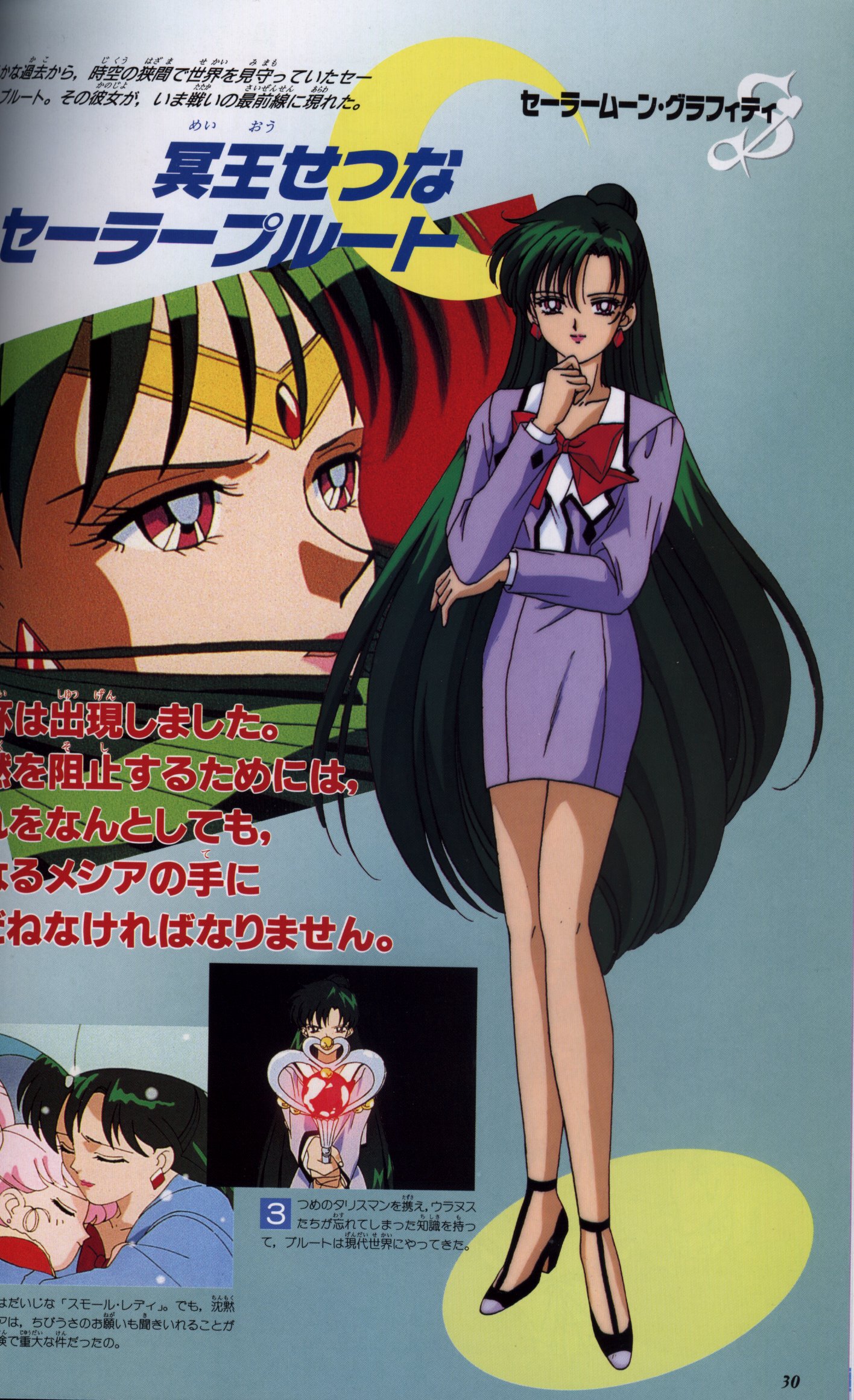 День рождения: 29 октября Астрологический знак: Скорпион Группа крови: A Любимый цвет: темно-красный Хобби: ходить по магазинам Любимая еда: о-тя ("o-cha" - зеленый чай) Наименее любимая еда: баклажан Любимый школьный предмет: физика Самый нелюбимый школьный предмет: музыка Проблемы с: тараканами Хорошо получается: шить Мечта: стать дизайнером Любимый камень: гранат Плутон является хранителем временем, поэтому знает и прошлое, и настоящее, и будущее, она знает, к каким событиям приведет тот или иной поступок, может направлять их в нужное русло. Плутон ценит каждого воина, так как знает о роли и ценности каждого, но все же предпочитает сражаться вместе с внешними воинами. Хотя в будущем единственные кто навещали ее, были члены королевской семьи.В манге определяется ее положение так: - Миссия Сейлор Плутон отличается от миссии четырех внутренних воинов- хранителей принцессы. В ней течет кровь бога времени Хроноса. Она живет между временем и пространством. Время - неприкосновенная территория. Двери времени были закрыты от посторонних с незапамятных времен. Сейлор Плутон - единственная, кто охраняет их. Но такая важная функция обязывает Сетсуну безвылазно находиться у Врат Времени, единственное исключение в случае, если присутствие Плутона необходимо для спасения мира. Ее нередко называют одиноким стражем временем. Из манги: Земли пустынные... безжизненные... - Мы были совершенно одиноки. - Никто не пришел бы к нам на помощь... одиночество! - Но в любое время мы могли оглянуться назад... и там вдали... увидеть Серебряное Тысячелетия, образы прекрасной Королевы и принцессы. Это был наш луч света! -Когда мы были близки, чтобы сдаться, чтобы бросить все - сказала Сетсуна,- Этот свет вел нас вперед! Одиночество Космоса невозможно сравнить с одиночеством на Земле, и это одиночество длилось веками и тысячелетиями. Это несомненно повлияло на характер Сетсуны, и даже когда она улыбается, в ее глазах видна затаенная грусть. Внешне Плутон всегда спокойна и рассудительна, и даже в бою не теряет хладнокровия, а по своему мужеству и стойкости она не уступает никому. Воин времени всегда отличается завидной выдержкой, выносливостью, решительностью и невозмутимостью. Плутон - планета времени, теней и смерти наложила свой отпечаток на характер девушки, наделив ее молчаливостью, мистичностью, непроницаемостью и какой-то ледяной отстраненностью. Может быть поэтому, ее уважают все без исключения воины. В ней чувствуется нечеловеческая мудрость и сила, она словно является воплощением знаний и поистине космического спокойствия. Как ничто не может повлиять на течение времени, так и никто не может заставить Плутон свернуть со своего пути, отказаться от ее миссии. Этот самый задумчивый и сдержанный воин всегда действует очень продуманно, и силой своего разума, а также силой времени, задействованной в нужный момент, наносит ощутимый урон врагу. Сетсуна - самая старшая из всех воинов (ей 18 лет), она является воином, защищающим Врата Времени, и ее основная миссия следить за нерушимостью временных границ, предотвращать и пресекать любое вмешательство в дела прошлого и будущего. Именно поэтому, зная заранее все случившееся, она практически не вмешивается в деяния других воинов, никогда не говорит им о том, что должно случится, не пытается спорить или отговаривать, словно бы пр