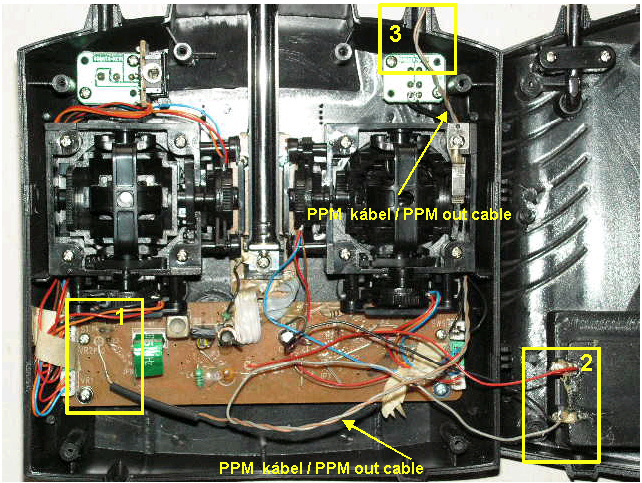 X-UFO is a very sweet toy, so due to the high price it would be too much to be regretted to let gravity win against our lovely UFO right at the first fly. Beginner aliens can easily hit the ground, and unfortunately the manufacturer hadn't provided for the optional interface between the remote control and a UFO simulator software what one could get the routine of flying by to avoid the mass destruction in the garden, or even the living room. There is a 3.5mm jack connector on the remote unit, but it is designed only for an other remote especially for traning reasons. If we push trainer button, there is only a logical "0" sign on the output. It means that for training we need a remote unit working on exactly the same frequency as the beginners one, and the output -I mentioned above- is only for switching between two remotes. For this reason I had to make some changes to make it able to be attached to the FMS simulator. If you want to practice using simulator, grasp your favourite screwdriver and after removing all the batteries take the remote to pieces! After removing every screws, two side of the box must be slightly pushed to release small fastenings. At the bottom of the box there is a pcb. At its left corner, there is a point signed P65, located at the left of the XTAL. Here you can find a small piece of undressed wire. This is the point where the PPM signal runs into the transmitter unit. Use a thin twin-cable. In this example solder the brown wire to P65, this is the sign, and the grey wire to the negative part of the battery, this is the ground. Bind the wire forward near SW9 parallel with its cables, and let it out through the small hole next to the holder and put the box together. (If you can't find the orphan small wire coming out of the P65 on the pcb, than you should lift the board up, and solder the wire to the tared all-around-feeted processor-brains P65 point.) You can put a connector to the external end of the wire, whatever you want, for example a clipped one, simple mother jack, or RCA. For the other side, you should create the printer port cable as well. The parallel port joystick driver, and the FMS simulator is available at http://www.spmodell.hu/repletoltesek.htm There is an X-UFO modell file for FMS, or a similar four propellered terrible one. Эскизы прикрепленных изображений Прикрепленные файлы