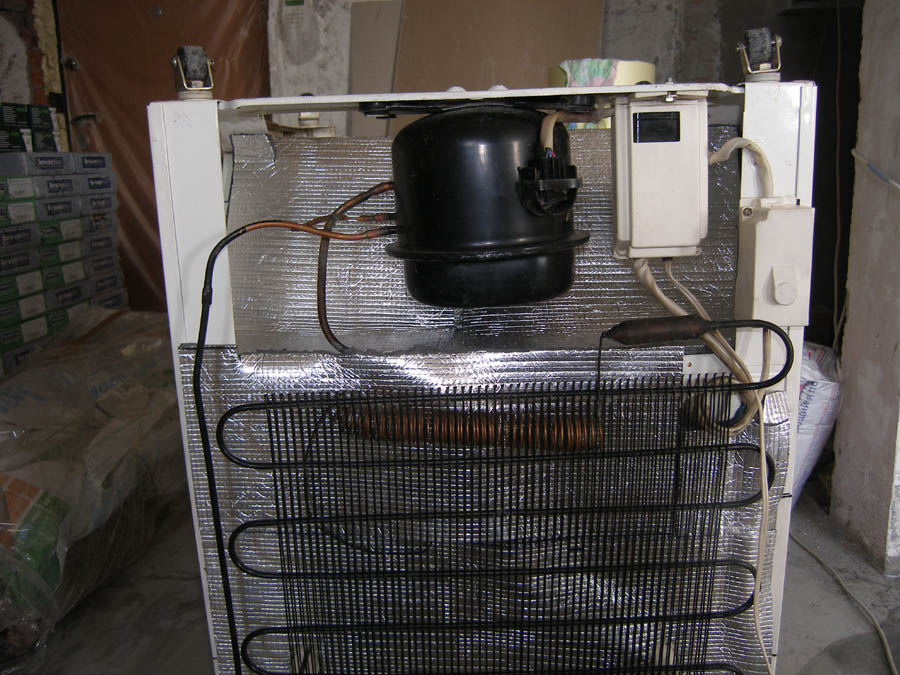 Однако не многие знают, что ее энергопотребление можно достаточно просто уменьшить Основные теплопотери происходят через самую горячую часть морозилки - заднюю стенку так как там находится радиатор конденсатора и компрессор. Перевернем морозилку и вымоем начисто поверхности. После обезжирим ацетоном для хорошей адгезии фольгированного самоклеющегося пенополиэтилена Обклеим Заклеим стыки аллюминиевой фольгой Перевернем и обклеим крышу (предвариельно вынув старый пенопласт) Результат: -------------------- Живы будем - Не помрем !
