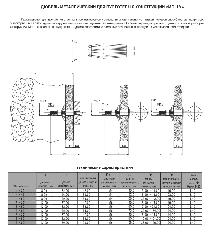 Предназначен для крепления строительных материалов к основаниям, отличающимся низкой несущей способностью, например: гипсокартонные плиты, древесностружечные плиты или пустотелые материалы. Также используется при необходимости частой разборки конструкции. Монтаж возможно осуществлять двумя способами: с помощью специальных клещей, с использованием отвертки. Технические характеристики.