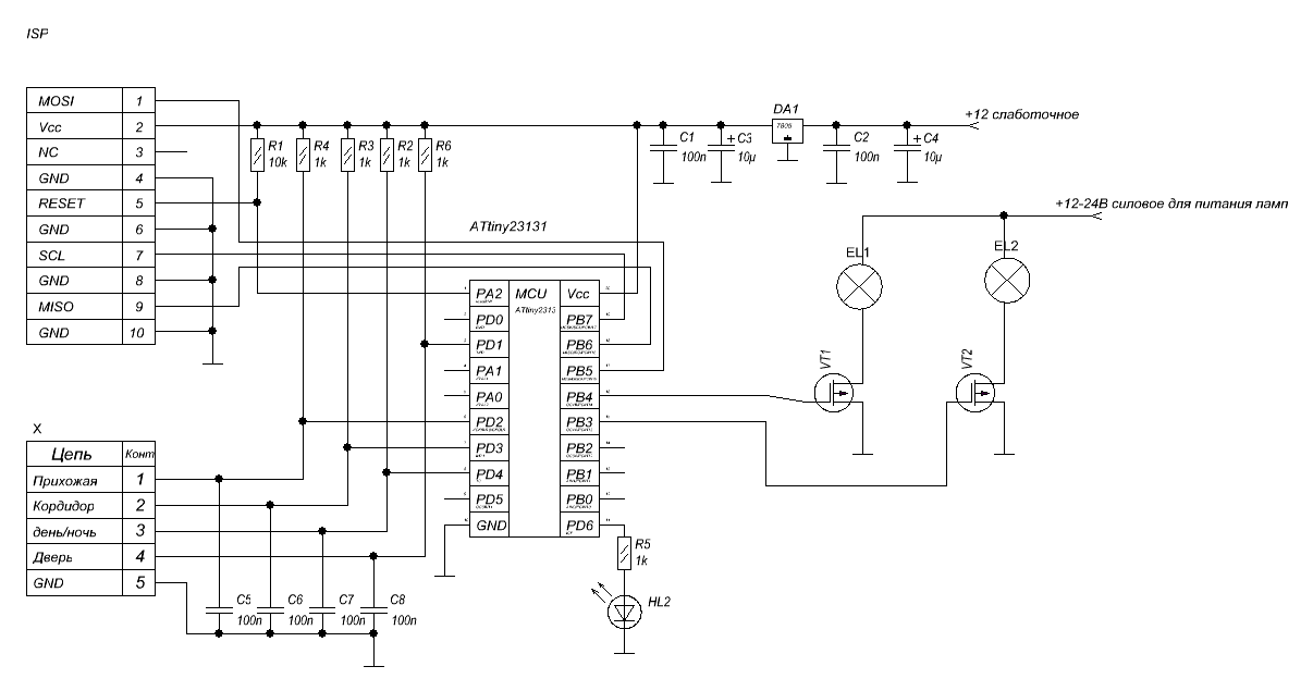 Постановка задачи: 1. есть прихожая и длинный коридор. надо обеспечить экономичное освещение при наличии необходимости в нем, 2. желательно обеспечить управление яркостью освещения ночью. Решение. 1. используется простенький контроллер ATMEL ATTINY 2313 ![]() тактируется от встроенного генератора 8MHz 2. внешние датчики DSC LC-100 PI ![]() настроены на максимальную чувствительность и расположены так, чтобы покрыть указанную территорию. для удобства датчики подключаются по витой паре которая в конце разделывается в стандартные разъемы 3. для освещения использутся 12В светодиодная лента 4. Источник питания +12В - переделанный БП ATX-350 5. Для переключения день-ночь используется внешний таймер с календарем. Решение обеспечивает плавное включение/выключение освещения с учетом времени суток. -------------------- Живы будем - Не помрем !
