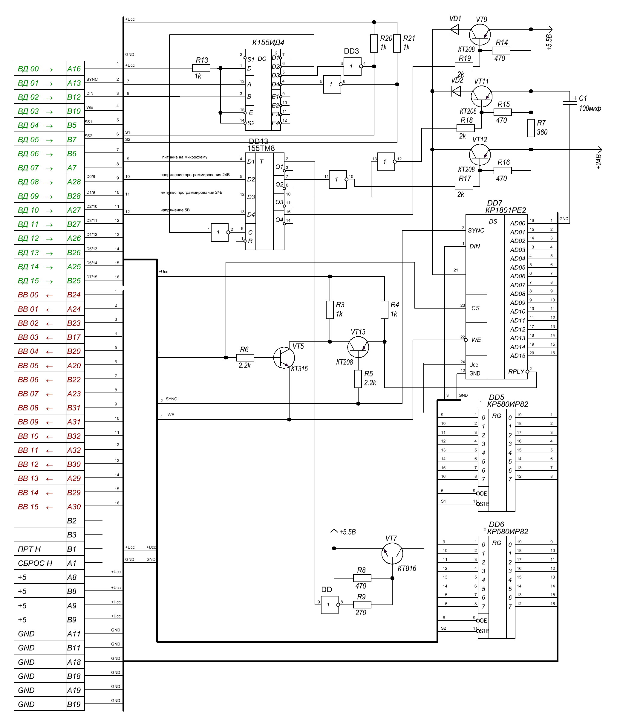 основное назначение - прошивка 1801РР1 изначально ему требовалось двойное внешнее питание но я его доработал (вставил преобразователь 5->24В и стабилизатор +5.5В) также пришлось поменять почти все микросхемы ибо они были армянские... а качество в 90х у армянских микросхем было мягко говоря плохое.... фото схема -------------------- Живы будем - Не помрем !