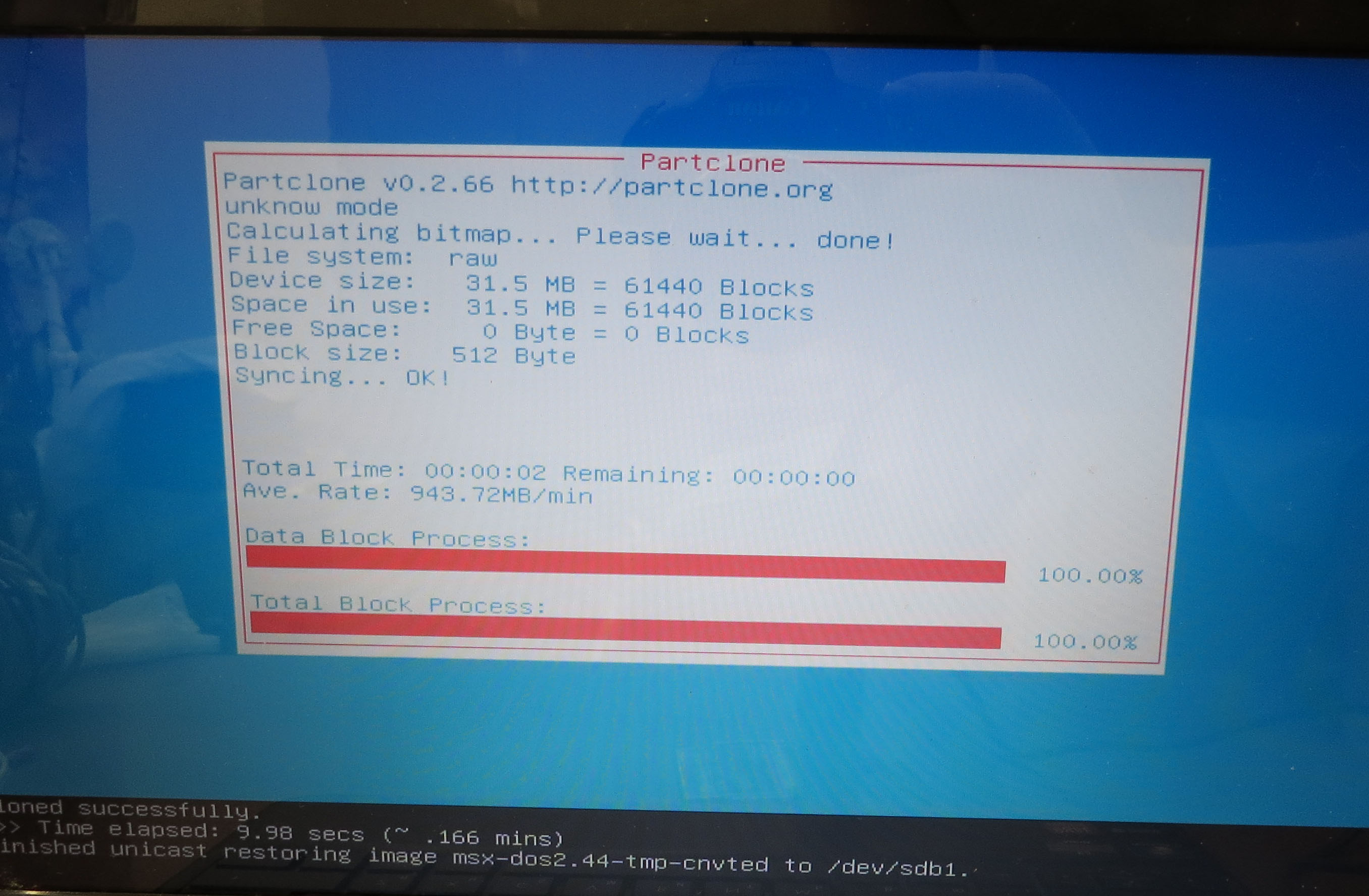 Кол-во скачиваний: 4002B. You do not have Linux on the desktop (for example I have my Linux servers and desktops on Windows only) You need: - USB flash - USB card reader for CF or another option to connect CF-Card 1. formatted USB flash FAT16 or FAT32 2. deploy archive Attachment clonezilla_live_msx_dos2.44.zip (173.02 megabyte) Number of downloads: 20 on USB flash then at the very start the flash drive utils win32 makeboot.bat Hit enter 2 times 3. To turn off the PC, connect the USB flash and CF-card 4. turn on when you start entering the boot menu choose to boot from USB flash After a successful download see: choose the credit default menu, click enter 5. From the menu, select the drive where chooses to deploy CF-card make no mistake! and press enter, then repeatedly confirm 6. Successful completion of the fill image -------------------- Живы будем - Не помрем !