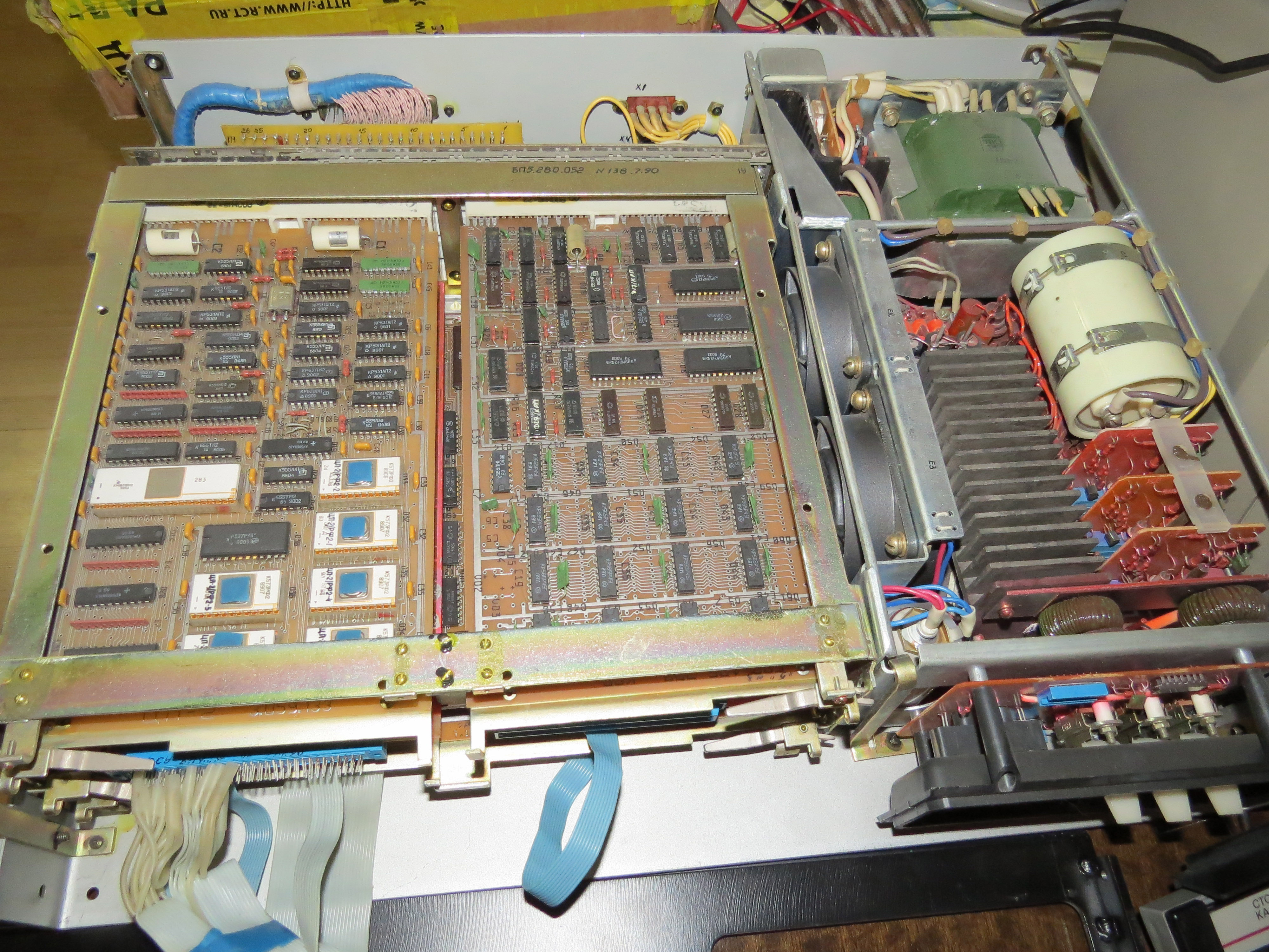 Оперативная память что бросается в глаза - на плате 128КБ (!) и судя по всему может быть больше ? может конечно всё банально - это половинки, а плата изначально делалась под РУ6 Процессорная плата Плата портов - те сюда воткнут терминал КСМ и что-то еще вот тут на фото видно расположение плат в основном блоке верх слева направо проц - память пусто-пусто интерфейс терминала (тудаже и reset подключен) - интерфейс ? Загадочная плата те видна линейка ЛА2 ТМ2 ИЕ7 и РУ3 (!) в углу маркировка КЦДР-1 КСМ Корзина системного блока - вид сзади Пульт -------------------- Живы будем - Не помрем !