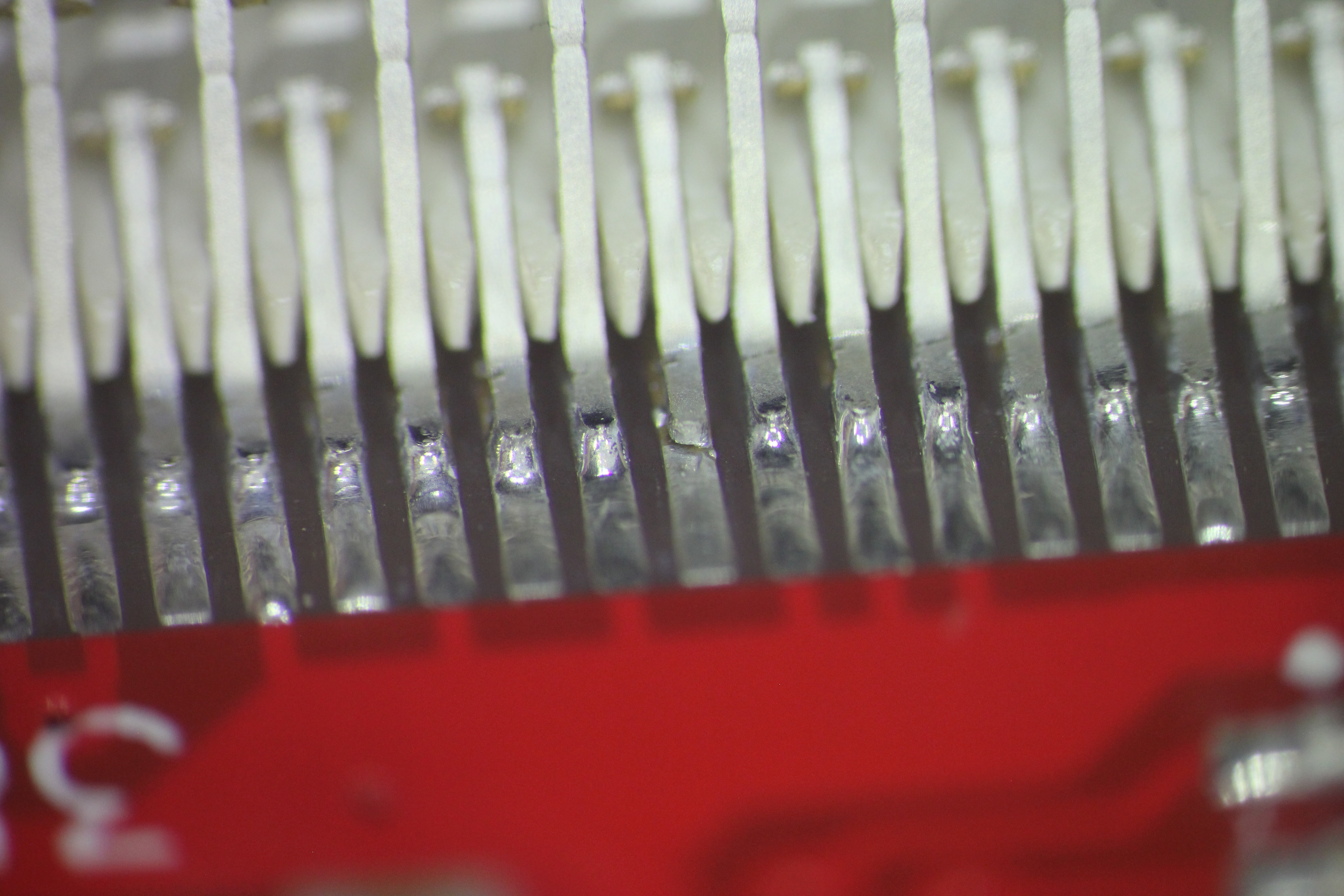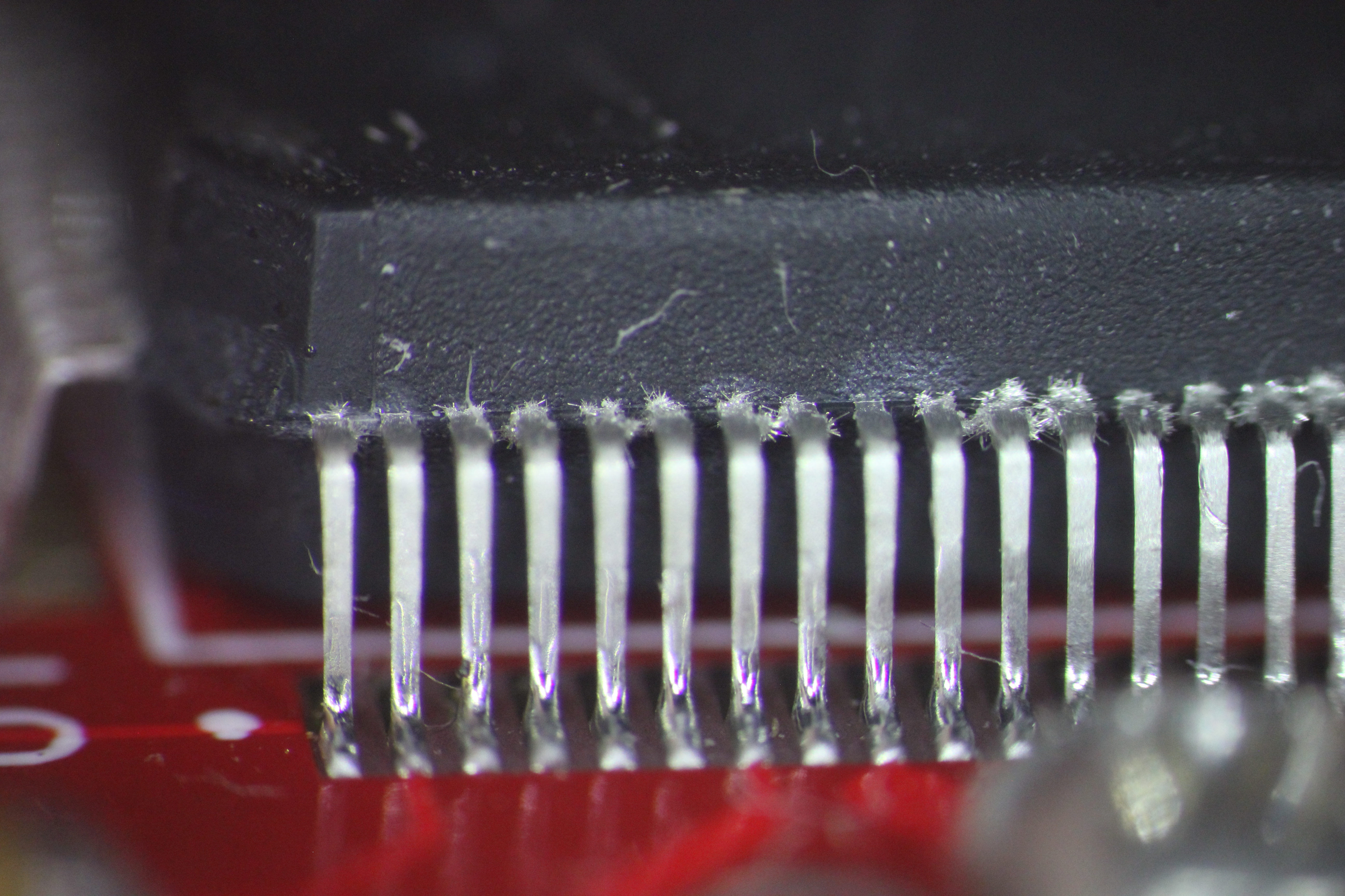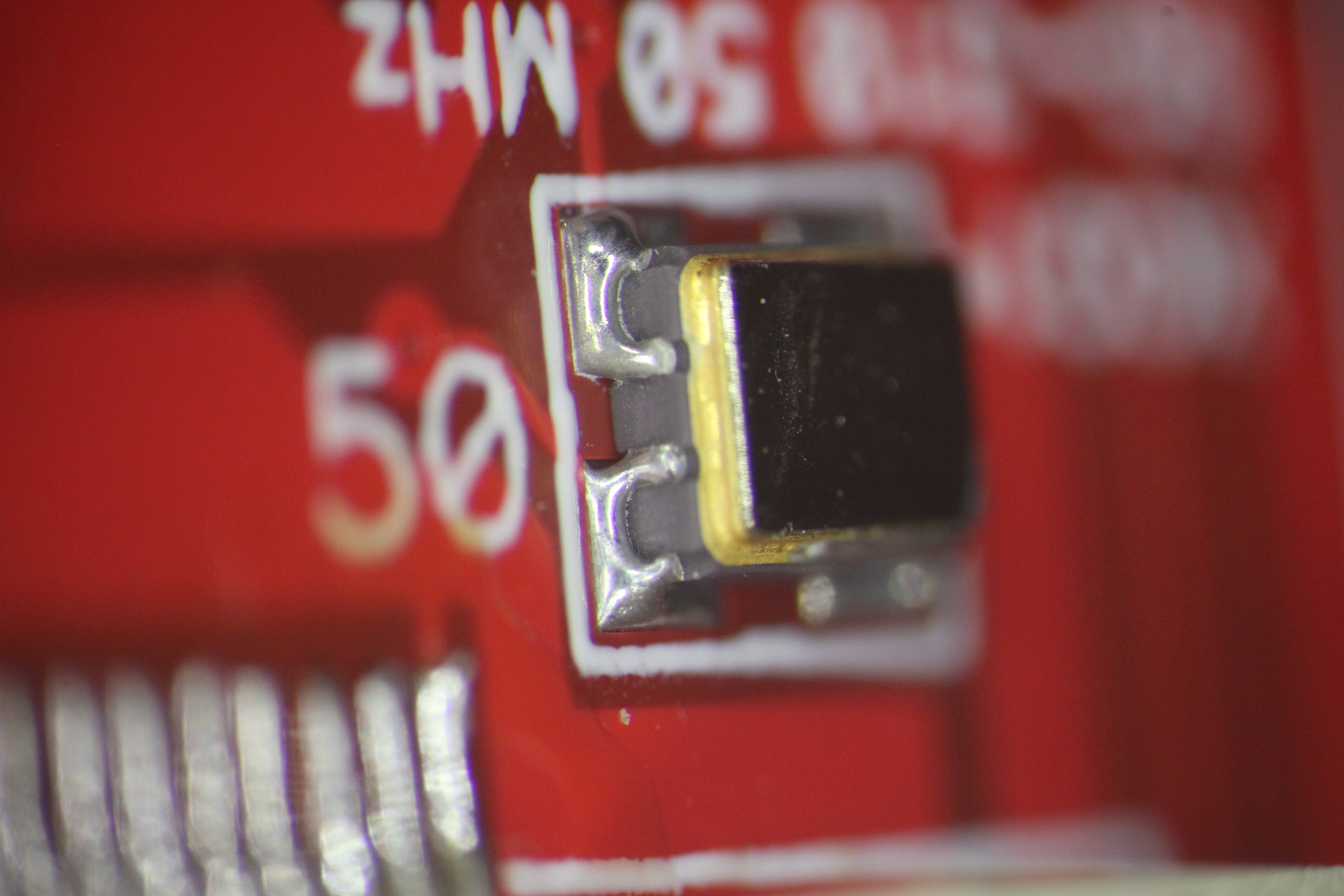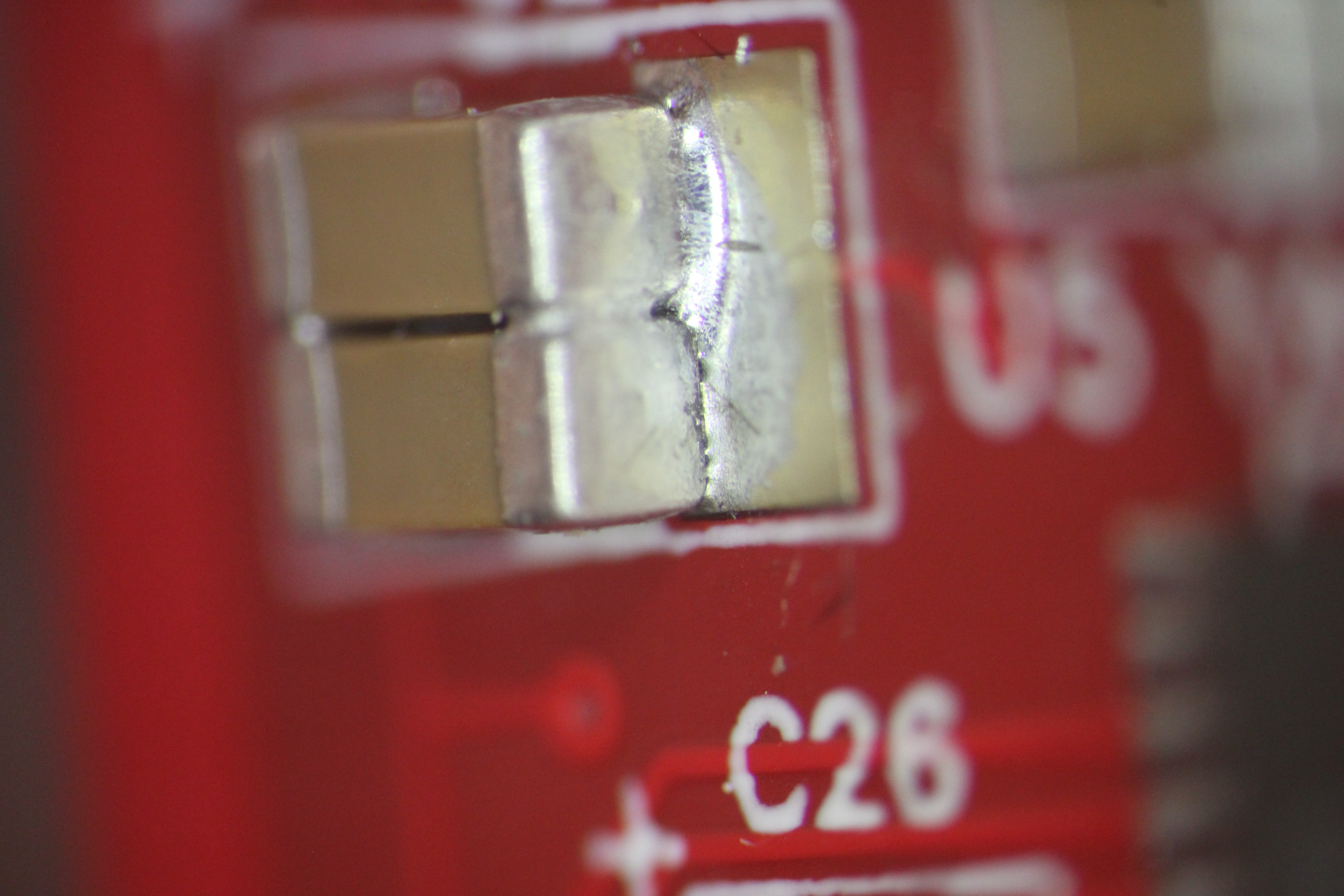 видна микротрещина пайки конденсатора 5ая нога слева в воздухе нога в центре вообще не пропаяна 4,7,8 ноги в воздухе хорошо виден зазор 5ая нога слева в воздухе 1,5,7 нога слева в воздухе хорошо виден зазор есть припой, есть остатки флюса но контакта нет нога в центре в воздухе пятно контакта меньше 0,2кв мм ! ноги в воздухе эти дефекты хорошо показывают жесткую необходимость работать с микроскопом ибо автор этих дефектов паял с такой наглазной лупой и в принципе не удивительно - она всего 2.5x -------------------- Живы будем - Не помрем !