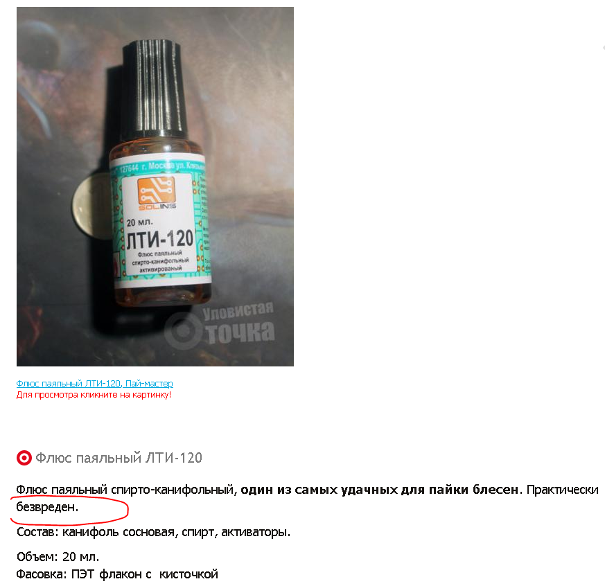 в продаже есть флюс ЛТИ-120 про который пишут что он безвреден на самом деле он ядовит, причем сильно. а тот торгаш, что пустил утку о его безвредности и как следствие посадил печень многим радиолюбителям, пусть сам им пользуется! Смотрим состав: Диэтиламин. ПДК 0,05 мг/м 1.2.3.4. Помещения, в которых проводят работы с техническим диэтиламином, должны быть снабжены приточно-вытяжной и местной вентиляцией по ГОСТ 12.4.021-75, обеспечивающей состояние воздушной среды в соответствии с требованиями ГОСТ 12.1.005-76. 1.2.3.5. Работающие с техническим диэтиламином должны быть обеспечены защитными средствами для кожи и глаз. Средством защиты от воздействия паров технического диэтиламина является фильтрующий противогаз по ГОСТ 12.4.121-83 с коробкой марки КД. Триэтаноламин почти аналогично, но кроме противогаза надо еще и костюм с фартуком теперь смотрим состав ЛТИ-120 спирт этиловый 90-95% канифоль 20-25% диэтиламин 3-5% триэтаноламин 1-2% пусть в процессе дневной работы вы истратили 1кубик (плотность у ЛТИ-120 0,902 кг/см3) это диэтиламин 5% - 0,0451 грамма = 45мг триэтаноламин 2% - 0,0180 грамма = 18 мг пересчитаем на объем воздуха пусть это будет 100кубов 0.45 и 0.18 против ПДК 0,05 те без принудительной вентиляции уже хана даже от одного кубика ЛТИ-120 (!) причем, что важно, отравляющие вещества не будут распределяться по квартире равномерно - они будут концентрироваться в месте пайки. соответственно ПДК будет превышен даже после 1 капли! надо понимать, что даже 1 час пайки будет убивать вашу печень и серьезно ухудшит качество вашей жизни в будущем. -------------------- Живы будем - Не помрем !