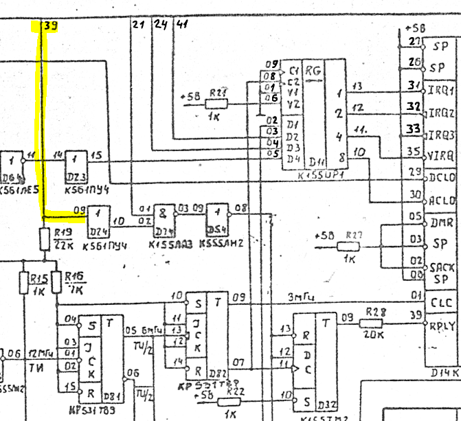 Да, для этого потребуется не деструктивная доработка БК-0010(01) (не деструктивная - это означает, что БК-0010(01) полностью сохраняет свой функционал при работе без AZБК) Также данная доработка позволяет подключить внешнюю PS/2 клавиатуру, особенности ее подключения описаны вот тут Для начала разберемся с видами БК-0010 и БК-0010.01 Клавиатурная терминология мягкая клавиатура это вот такая: скрипучка вот такая: пленочная (плоская) клавиатура вот такая: реально там под пленкой и бумагой ПКН-150 Теперь классифицируем виды БК-0010(01) Cхемы БКшек смотрим тут и тут 1. новая БК-0010-01 с мягкой клавиатурой с и новой печатной платой имеет впаянный бейсик и его блокировка выведена на А14 (все 3 ПЗУ блокируются этим сигналом) монитор отключается - его блокировка выведена Б1 отличия на МПИ как на БК11М тут добавлено: A21 - 6MHz Б9 - чтение 177716 (РПН) Б10 - запись 177716 (РПН) А29 -DIN с отсечкой в адресах 177600 и выше и через резистор 1ком, позволяет персонально блокировать ПЗУ со 160000 (видимо для совместимости с первыми БК) тк этот DIN формирует 037 и он через резистор подключен к А29, как следствие если зацепить его через 300ом на питание +5В то DIN на ПЗУ не пройдет. собственно это есть на моей схеме КНГМД А30 -DIN с отсечкой в адресах 177600 и выше Б4 - IAKO прямо с проца Б15 - IRQ3(274) отличия от других БК Б8 никуда не подключен отличия от схемы по RPLY - 13й контакт ТМ2 не соединен с 12м - он соединен с 10м ![]() Б20 RPLY c номером #21 на шине 014 RPLY - 21 037 RPLY - 21 ПЗУ RPLY - на 2 ногу ЛА3 вход ПУ4 нога 9 тоже на 2 ногу ЛА3 (!) выход ПУ4 нога 10 в воздухе (!) см схема те ответы от 037й 014й будут видны стенду а вот ответы ПЗУ нет Ч/Б видеовыход не требует соединения 3 и 5 контактов в разъеме ТВ печатная плата вот такого вида Совместимость без доработок КНГМД с раширенной памятью - ДА SMK 32/64/128/512 - ДА AZБК - ДА AZБК эмуляция БК11М - НЕТ 2. скрипучка без пачки проводов сзади имеет впаянный бейсик и его блокировка 2х ПЗУ (120000 и 140000) выведена на A14 блокировка одной ПЗУ (той что со 160000) через А29 монитор не отключается отличия на МПИ Б20 - RPLY (#21на шине по схеме) отличия от схемы по RPLY - 13й контакт ТМ2 не соединен с 12м - он соединен с 10м ![]() Б1 соединен с Б8 и через резистор 11ком подключен к выходу 12 регистра ИР1 технически это бит 5 (используется для передачи данных на магнитофон, либо сигнала готовности на линию) те на схеме он должен быть соединен с выходом на магнитофон, но в ранних БК этого не было Б9 Б10 не подключен А29 -DIN с отсечкой в адресах 177600 и выше и через резистор 1ком А30 -DIN с отсечкой в адресах 177600 и выше напрямую с 037й тк этот DIN формирует 037 и он через резистор подключен к А29, как следствие если зацепить его через 300ом на питание +5В то DIN на ПЗУ не пройдет. собственно это есть на моей схеме КНГМД данная доработка явно сделана проводком - см фото ниже Ч/Б видеовыход не требует соединения 3 и 5 контактов в разъеме ТВ печатная плата вот такого вида Совместимость без доработок КНГМД с расширенной памятью - ДА SMK 32/64/128/512 - ДА AZБК - ДА AZБК эмуляция БК11М - НЕТ 3. скрипучка без пачки проводов сзади но с проводком на Б20 имеет впаянный бейсик и его блокировка 2х ПЗУ (120000 и 140000) выведена на A14 блокировка одной ПЗУ (той что со 160000) через А29 монитор не отключается RPLY на Б20 но не так как у всех остальных БК отличия от схемы по RPLY - 13й контакт ТМ2 не соединен с 12м - он соединен с 10м ![]() Б1 соединен с Б8 и через резистор 11ком подключен к выходу 12 регистра ИР1 технически это бит 5 (используется для передачи данных на маг