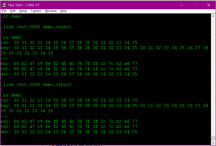 Кол-во скачиваний: 838Для примера собираем DEMO.C - это пример AES256ECB шифрования и дешифрования я его конечно привел к виду который может компилировать данный компилятор, и это не сложно Код .set sl on .cc demo .link /bot:3000 demo,ceisrt .ru demo txt: 30 31 32 33 34 35 36 37 38 39 30 31 32 33 34 35 key: 30 31 32 33 34 35 36 37 38 39 30 31 32 33 34 35 30 31 32 33 34 35 36 37 38 39 30 31 32 33 34 35 --- enc: 06 b2 d7 c9 fe f2 45 4c 76 7f 3f 1c 7c b2 a6 77 tst: 06 b2 d7 c9 fe f2 45 4c 76 7f 3f 1c 7c b2 a6 77 dec: 30 31 32 33 34 35 36 37 38 39 30 31 32 33 34 35 .link /bot:3000 demo,cfpurt .ru demo txt: 30 31 32 33 34 35 36 37 38 39 30 31 32 33 34 35 key: 30 31 32 33 34 35 36 37 38 39 30 31 32 33 34 35 30 31 32 33 34 35 36 37 38 39 30 31 32 33 34 35 --- enc: 06 b2 d7 c9 fe f2 45 4c 76 7f 3f 1c 7c b2 a6 77 tst: 06 b2 d7 c9 fe f2 45 4c 76 7f 3f 1c 7c b2 a6 77 dec: 30 31 32 33 34 35 36 37 38 39 30 31 32 33 34 35 это сборка на 11/73 для сборки на ВМ3 надо собирать только так (тк в ВМ3 нет FPU) Код .link /bot:3000 demo,ceisrt Особенности компилятора (те что нашел я пока собирал этот пример) 1. не понимает // 2. все имена - до 6 символов включительно 3. убирайте регистровые переменные - компилятор может на них запнуться и сделать нерабочий код 4. результат работает и под обычной RT11SJ -------------------- Живы будем - Не помрем !