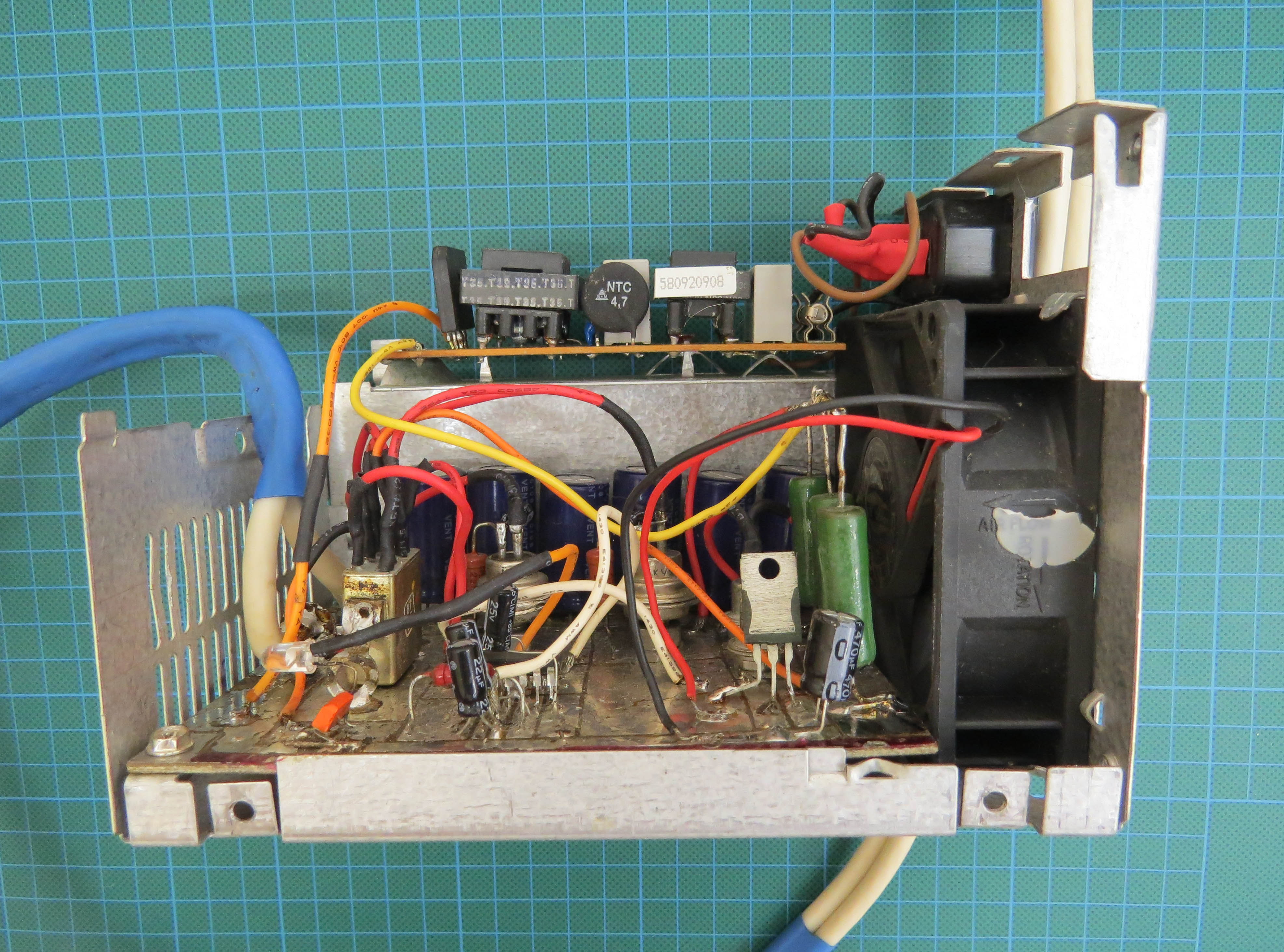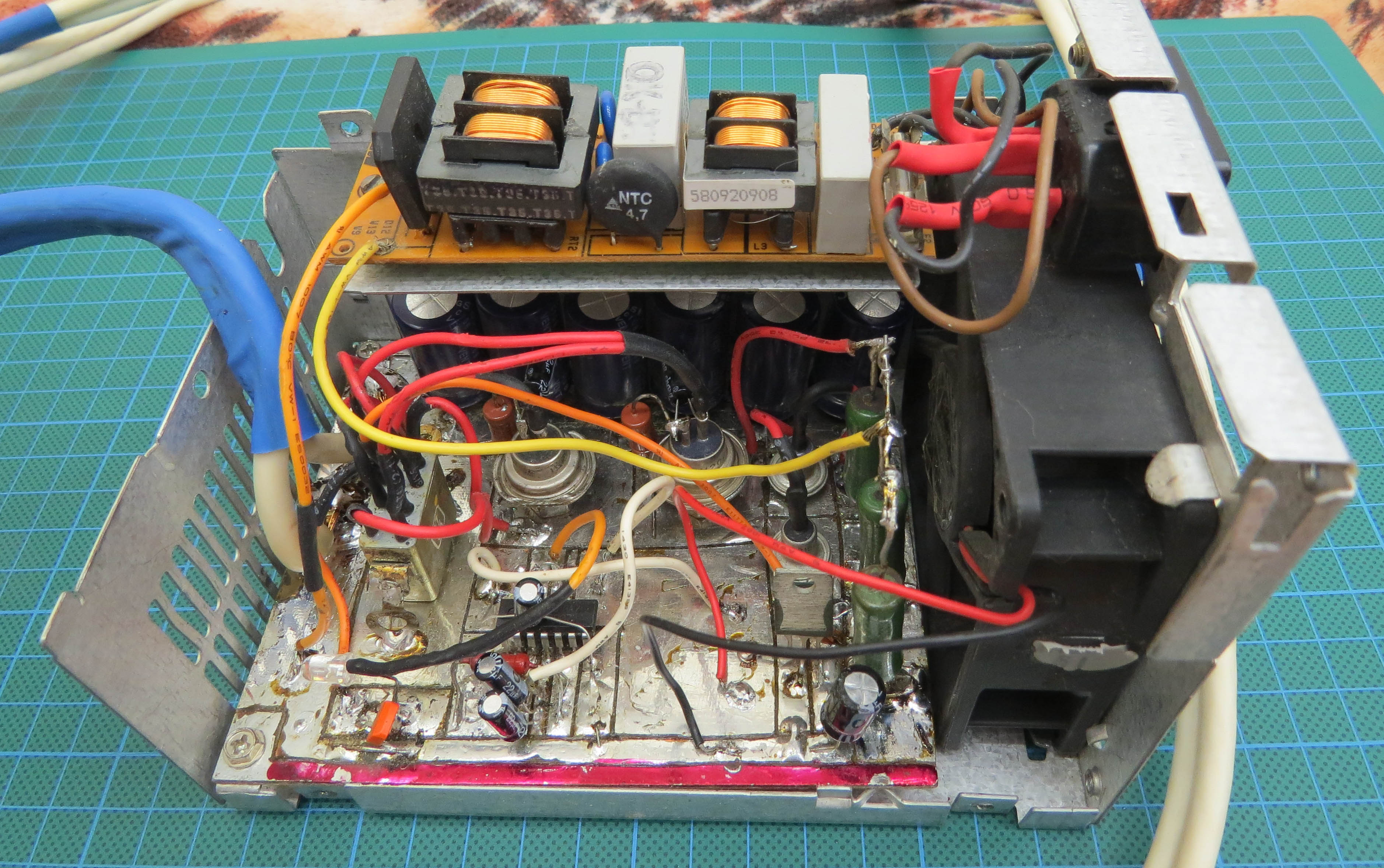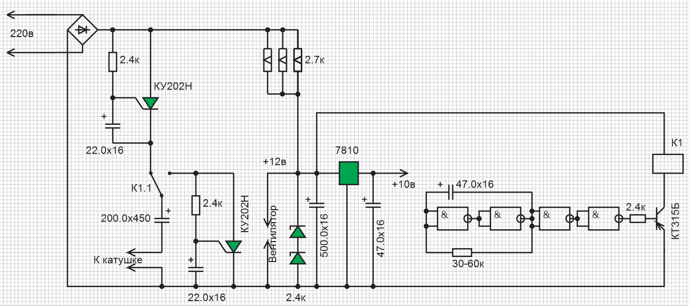 сделан в 2004м из того, что попалось под руку ) Схема микросхема - 176ЛА7 и можно заменить на любую другую логику задача генератора - давать примерно меандр с частой 0,5Гц батарея конденсаторов набирается из конденсаторов небольшой емкости - те 47.0x450в реле - РЭС-48Б стабилитроны Д815 (буквы не помню) - набираем чтобы получить 12-15в (надо чтобы срабатывало реле и работал вентилятор) конструктивно собирается в корпусе от компьютерного БП 12В вентилятор необходим для охлаждения конденсаторов также в данной конструкции он охлаждает резисторы 2,7к очевидно, что БП12В можно собрать иным способом - хоть применить готовый китайский катушка - была взята готовая, провод там 0.45мм количество витков можно прикинуть из габаритов при работе катушка нагревается, собственно нагрев выше 60С происходит как раз через 10 минут что как раз означает необходимость закончить сеанс назначение аппарата - ускорение процесса рассасывания гематом втч и глубоких и даже сухих исключение - головной мозг тк аппарат мощный, то ни шею ни голову им не лечим у пожилых людей с хрупкими капилярами возможны кровоизлияния при длительном применении соответственно катушку кладем через прокладку 2см и сокращаем время терапии до 2-3х минут Важно! применяете на свой страх и риск. фото конструкции напомню - 2004й год из того что было под рукой - цель было сделать быстро ну а временное становится постоянным - конструкция оказалась очень удачной -------------------- Живы будем - Не помрем !
