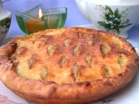 для теста: творог жирный - 100г; масло растительное - 2 ст.л.; яйцо - 1 шт.; мука - 150г; разрыхлитель - 1 ч.л.; соль - 1/2ч.л.; для начинки: лимон - 1 шт.; яблоко - 1 шт.; сахар - по вкусу Для теста соединить творог с яйцом, добавить масло, после чего всыпать смешанную с солью и разрыхлителем просеянную муку. Вымешивать тесто до тех пор, пока оно перестанет липнуть к рукам, но не переусердствуете, чтобы тесто не оказалось очень крутым. Обернуть тесто пленкой и убрать в холодильник на 30 минут. Приготовить начинку. Для этого измельчить в процессоре или пропустить через мясорубку лимон со шкуркой (предварительно ошпарьте лимон кипятком) и яблоко, соединить их, добавить сахар и перемешать. Тесто разделить на 2 половины. Из большой половины раскатать через пленку круг для основания пирога с бортиками (диаметр около 26 см), уложить на дно смазанной маслом и припудренной мукой огнеупорной формы. Вторую меньшую половину раскатать и сделать небольшие разрезы, которые затем растянуть, как показано на фотографии, чтобы получилась решетка. Наполнить основание пирога лимонной начинкой (в начинку можно добавить ст.л. любимого ликера), сверху уложить решетку и защипнуть края. Выпекать нагретой до 180 градусов духовке примерно 45 минут. Готовый пирог достать из формы, остудить и сразу же подавать к столу. Приятного аппетита! Эскизы прикрепленных изображений |
