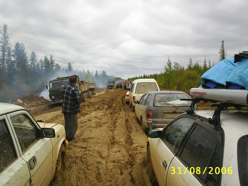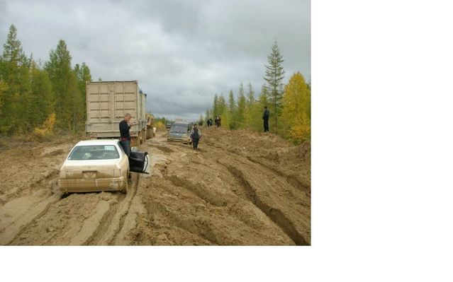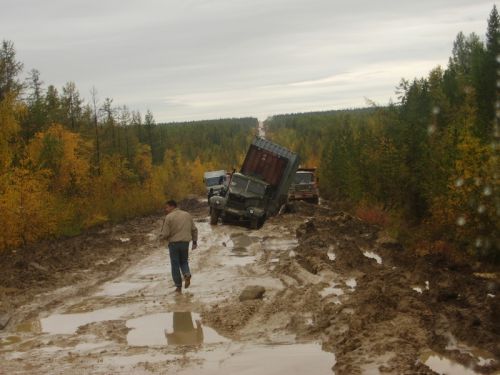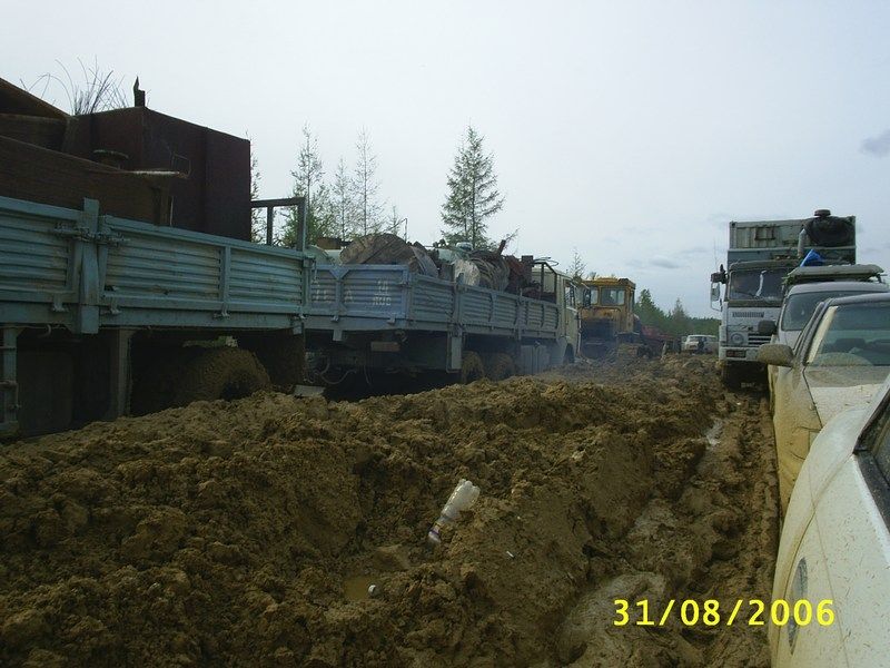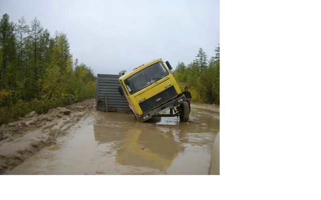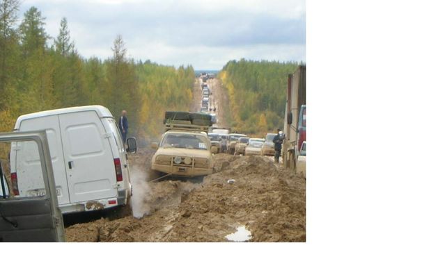 "1-е фото - федеральная дорога до Якутска, (дорога кстати единственная)и этот участок еще не самый плохой, плохой был дальше, где даже камазы не могут пройти. На момент когда сделано фото на том участке скопилось более 300 грузовых машин, не считая легковых." "2,3,4,5- дают общее впечатление от дороги. Повторюсь, это не самыйплохой участок, на самом плохом снимать не мог - руки только 2 ксожалению. На участке с названием "Мундручу" уже пробка из более 600машин (данные на 16 сентября), голод, отсутствие топлива, женщина однародила прямо в автобусе. Ремонтники уже не появляются - их простожестоко избивают обозленные водители. Раньше грибами народ питался -заморозки были, есть уже нечего. Народ вскрывает контейнера в поискахеды и теплых вещей, драки, стрельба и прочее. Самое ценное там -топливо, еда, оружие и железный трос. Правительству дела нет, хотя еслив городе дороги в ужасном состоянии - что говорить о удаленных местах?" Эскизы прикрепленных изображений -------------------- Живы будем - Не помрем !