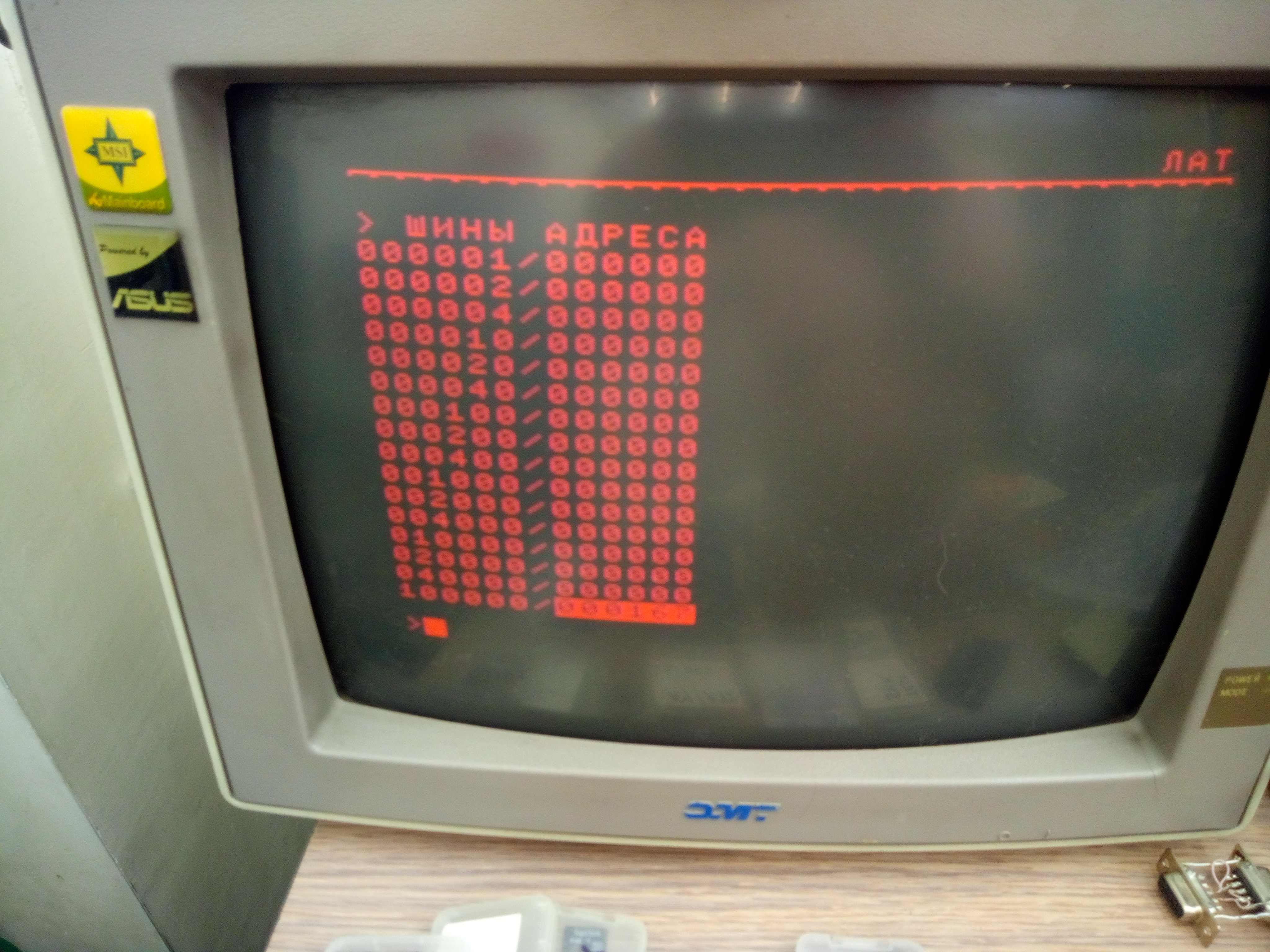На третьей итерации, отрезанная дорожка, не только вернула 5В на 39 ножку процессора (RPLY) но и привела в норму шину адрес-данные: При остановленном процессоре, на всех без исключения 16 битах установились высокие физические уровни (они же логические 0, будь она не ладна, эта инверсия). Однако… Далее – дело техники: еще пара отрезанных дорожек и вариантов не осталось. Мы уперлись в «сороконожку» КР1801ВП1-014 – контроллер клавиатуры.