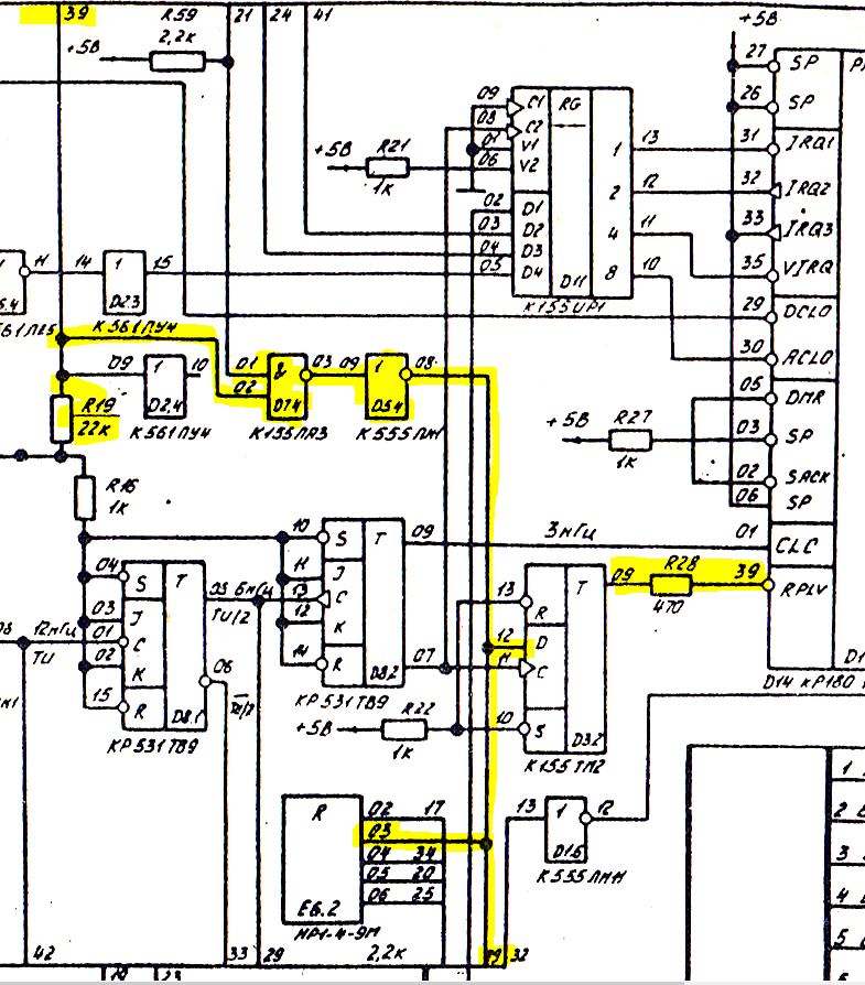 Однако, все это утешало весьма слабо. Пошли дальше. Коль процессор стоит, то попробуем это его обморочное состояние использовать себе на пользу. После подачи питания и до запуска процессора, в нормальном состоянии, на шине адрес-данные AD0…AD15 должны быть логические «0» (физические «1»). Отложим в сторону высокоученые «волшебные палочки» и вернемся к банальному мультиметру. Один щуп цепляем на «минус» платы, а другим просто прозваниваем соответствующие ножки и видим, что на 9, 13 и 16 ножках (сигналы шины адрес-данных AD0, AD4 и AD7) даже не физические «0», которым соответствует напряжение где–то 0,4 В (400 милливольт), а прям нуль нулей - 0,87 милливольт. Такая картина явно говорит о неприятностях на шине. Скорее всего что-то или кто-то, как говорится, «садит» шину. Продолжаем прозвон ножек процессора и далее видим еще одну нетипичную картинку на 39 ножке процессора, куда должен приходить сигнал RPLY. Подключаем анализатор логики к 39 ножке и видим, что прямо с момента появления на ножке 1 (CLC) тактовых импульсов, на линии RPLY сразу же раз и навсегда устанавливается высокий логический уровень (физический «0»). Снова берем в руки мультиметр и удостоверяемся, что этот физический «0» подозрительно напоминает «0» на трех злополучных битах шины процессора, это те же предательские 0,87 мВ. Такое положение вещей наводит на мысль, что и шину процессора и линию RPLY «highly likely» просаживает один и тот же субъект. Выяснить, кто виновник торжества можно лишь физически отсекая поставщиков RPLY от процессора, а их на плате немало. Найдя на схеме резистор R59, который «подтягивает» RPLY к 5В и пройдя от него вглубь схемы, примерно с середины пути начал отрезать дорожки, чтобы понять, в какую сторону топать дальше методом половинного деления.