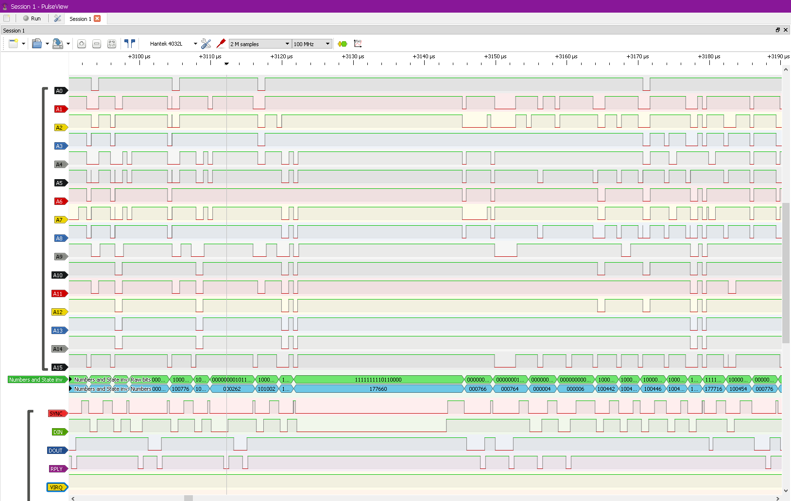 С подачей питания, запускается анализ. Получаем красивую картинку, на которой можно даже прочитать адрес, который к моменту начала сеанса обмена (поднятие сигнала SYNC) уже должен быть выставлен на шине процессора. Читать удобно по нисходящему фронту SYNC. Явно читается адрес 177716.