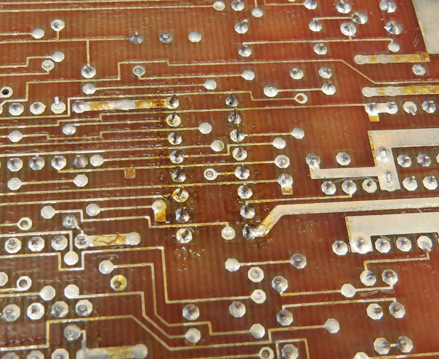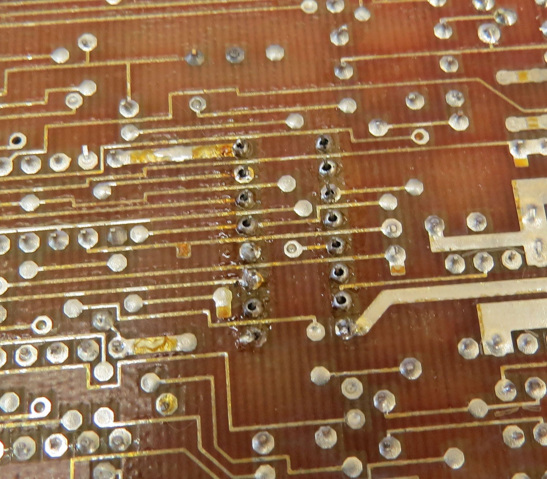 Так как никаких ошибок в логике работы схемы запуска найдено не было, кроме подозрительно малого времени между сигналами DCLO и ACLO, коллегиально процессор был признан умершим и приговорен к замене. Удаляение с паты процессора производилось по методике Максима. Ножки процессора по одной аккуратно откусывались миниатюрными бокорезами. Остатки ножек выпаивались с платы паяльником и пинцетом. Отверстия прочищались бамбуковыми зубочистками. Метод вполне рабочий и, при определенной доле сноровки и правильно подобранной температуре паяльника, дает отличный результат. Этот конкретный экземпляр платы был по-видимому сильно пересушен и дорожки на плате буквально дышали на ладан. При температуре паяльника 250 градусов, контактные площадки отходили от платы при малейшем прикосновении.