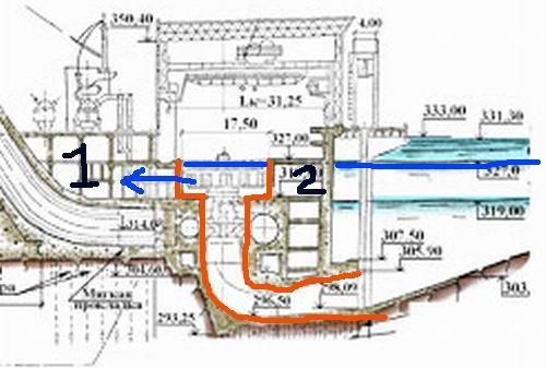 Синим там проведен нынешний предположительный уровень нижнего бьефа, где-то 326. Помещения со стороны верхнего бьефа (1) вполне могут быть оставаться затопленными и из за поступающей воды (синяя стрелка), но реально откачать воду возможно, так как 2ГА - единственный путь для поступления воды в помещения, и не думаю, что там очень большой расход, непосильный для нескольких мощных насосов. Тем более, что выходы в те помещения в площади не должны быть невероятно огромными, и их невозможно перекрыть с машзала, например мешками с песком. кроме того в помещения 1 можно пробиться сквозь перекрытия у трансформаторной площадки, наконец там должны быть перегрузочные люки (по любому). Вообщем способы есть.