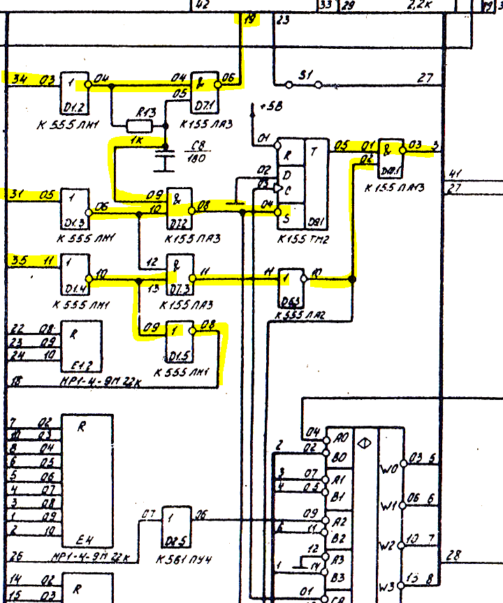Однако, все это утешало весьма слабо. Пошли дальше. Коль процессор стоит, то попробуем это его обморочное состояние использовать себе на пользу. После подачи питания и до запуска процессора, в нормальном состоянии, на шине адрес-данные AD0…AD15 должны быть логические «0» (физические «1»). Отложим в сторону высокоученые «волшебные палочки» и вернемся к банальному мультиметру. Один щуп цепляем на «минус» платы, а другим просто прозваниваем соответствующие ножки и видим, что на 9, 13 и 16 ножках (сигналы шины адрес-данных AD0, AD4 и AD7) даже не физические «0», которым соответствует напряжение где–то 0,4 В (400 милливольт), а прям нуль нулей - 0,87 милливольт. Такая картина явно говорит о неприятностях на шине. Скорее всего что-то или кто-то, как говорится, «садит» шину. Продолжаем прозвон ножек процессора и далее видим еще одну нетипичную картинку на 39 ножке процессора, куда должен приходить сигнал RPLY. Подключаем анализатор логики к 39 ножке и видим, что прямо с момента появления на ножке 1 (CLC) тактовых импульсов, на линии RPLY сразу же раз и навсегда устанавливается высокий логический уровень (физический «0»). Снова берем в руки мультиметр и удостоверяемся, что этот физический «0» подозрительно напоминает «0» на трех злополучных битах шины процессора, это те же предательские 0,87 мВ. Такое положение вещей наводит на мысль, что и шину процессора и линию RPLY «highly likely» просаживает один и тот же субъект. Выяснить, кто виновник торжества можно лишь физически отсекая поставщиков RPLY от процессора, а их на плате немало. Найдя на схеме резистор R59, который «подтягивает» RPLY к 5В и пройдя от него вглубь схемы, примерно с середины пути начал отрезать дорожки, чтобы понять, в какую сторону топать дальше методом половинного деления.