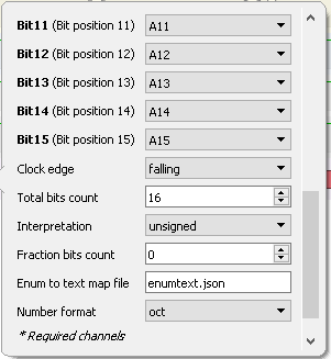 С подачей питания, запускается анализ. Получаем красивую картинку, на которой можно даже прочитать адрес, который к моменту начала сеанса обмена (поднятие сигнала SYNC) уже должен быть выставлен на шине процессора. Читать удобно по нисходящему фронту SYNC. Явно читается адрес 177716.