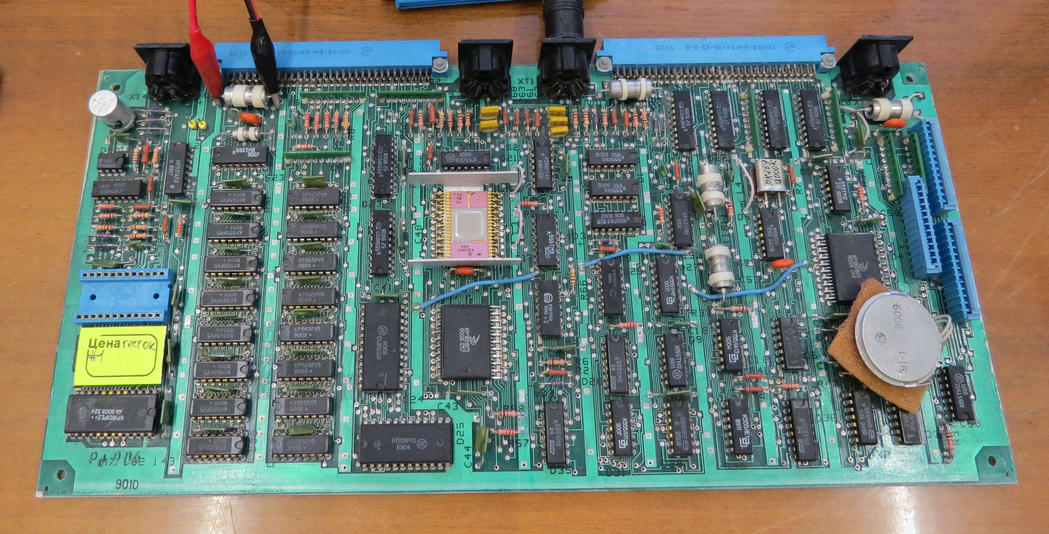 На третьей итерации, отрезанная дорожка, не только вернула 5В на 39 ножку процессора (RPLY) но и привела в норму шину адрес-данные: При остановленном процессоре, на всех без исключения 16 битах установились высокие физические уровни (они же логические 0, будь она не ладна, эта инверсия). Однако… Далее – дело техники: еще пара отрезанных дорожек и вариантов не осталось. Мы уперлись в «сороконожку» КР1801ВП1-014 – контроллер клавиатуры.