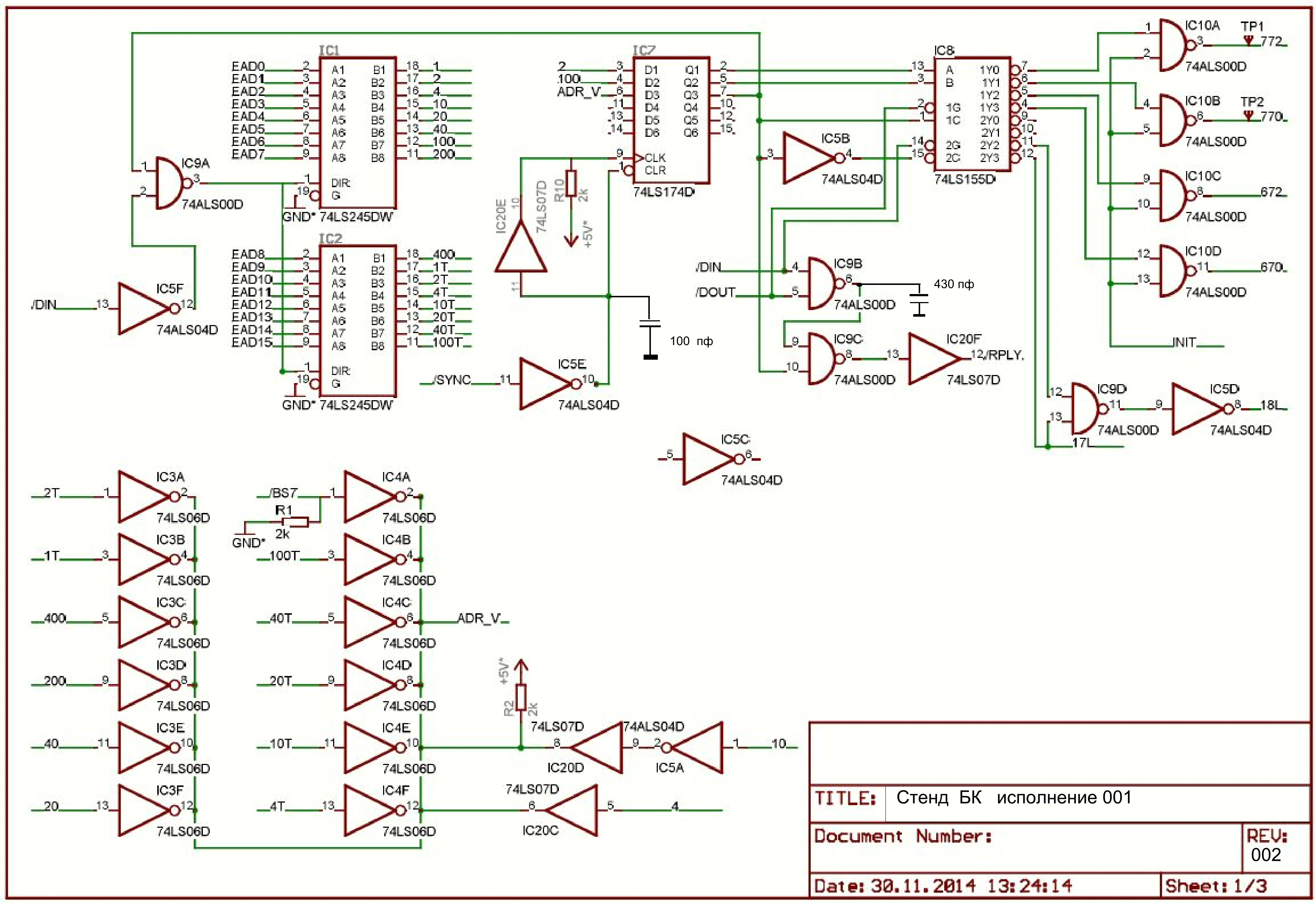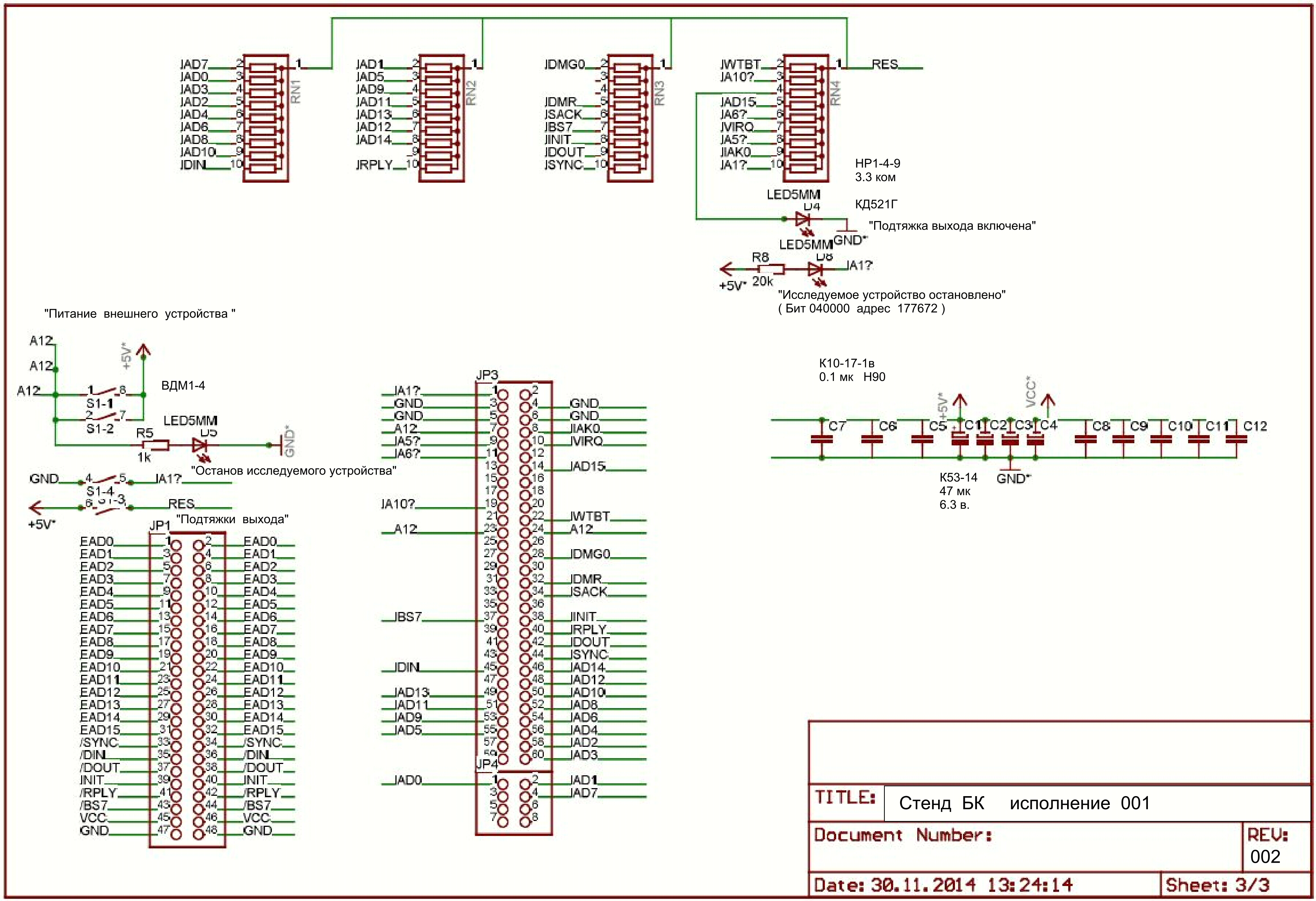 Выходы СБК - 001 выполнены на ИС 133ЛП9 (или их аналоге) и допускают ток в состоянии 0в. до 40 ма. Входы СБК - 001 выполнены на ИС КР1533КП11 и имеют входящий ток не более 1 ма при напряжении 0в. Точка переключения с лог. 0в. до лог. +5в - порядка 1.20 вольт. Не допускается подача на линии выхода СБК - 001 напряжения более, чем плюс 1 вольт от напряжения питания СБК - 001.