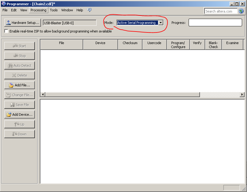 подключаем программатор USB Blaster к порту AS на нижней плате AZBK: