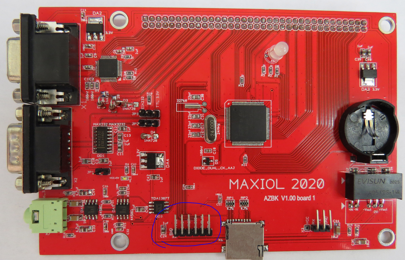 порт для программирования отмечен синим на фотографии, каждый пин имеет подпись на печатной плате