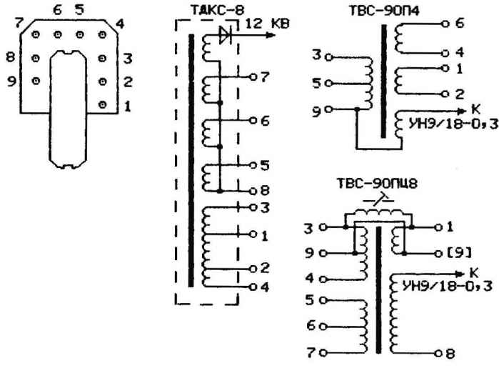 Следует отметить, что в случае применения умножителя напряжения УН9/27 (трехкратного действия) намоточные данные для ТВС-90П4 (табл. 1) остаются неизменными, за исключением обмотки с выводами 9-10. Она содержит 1266 витков провода ПЭВШО диаметром 0,08 мм. Может, поэтому УН9/27 дешевле умножителя УН9/18 и менее дефицитен?
