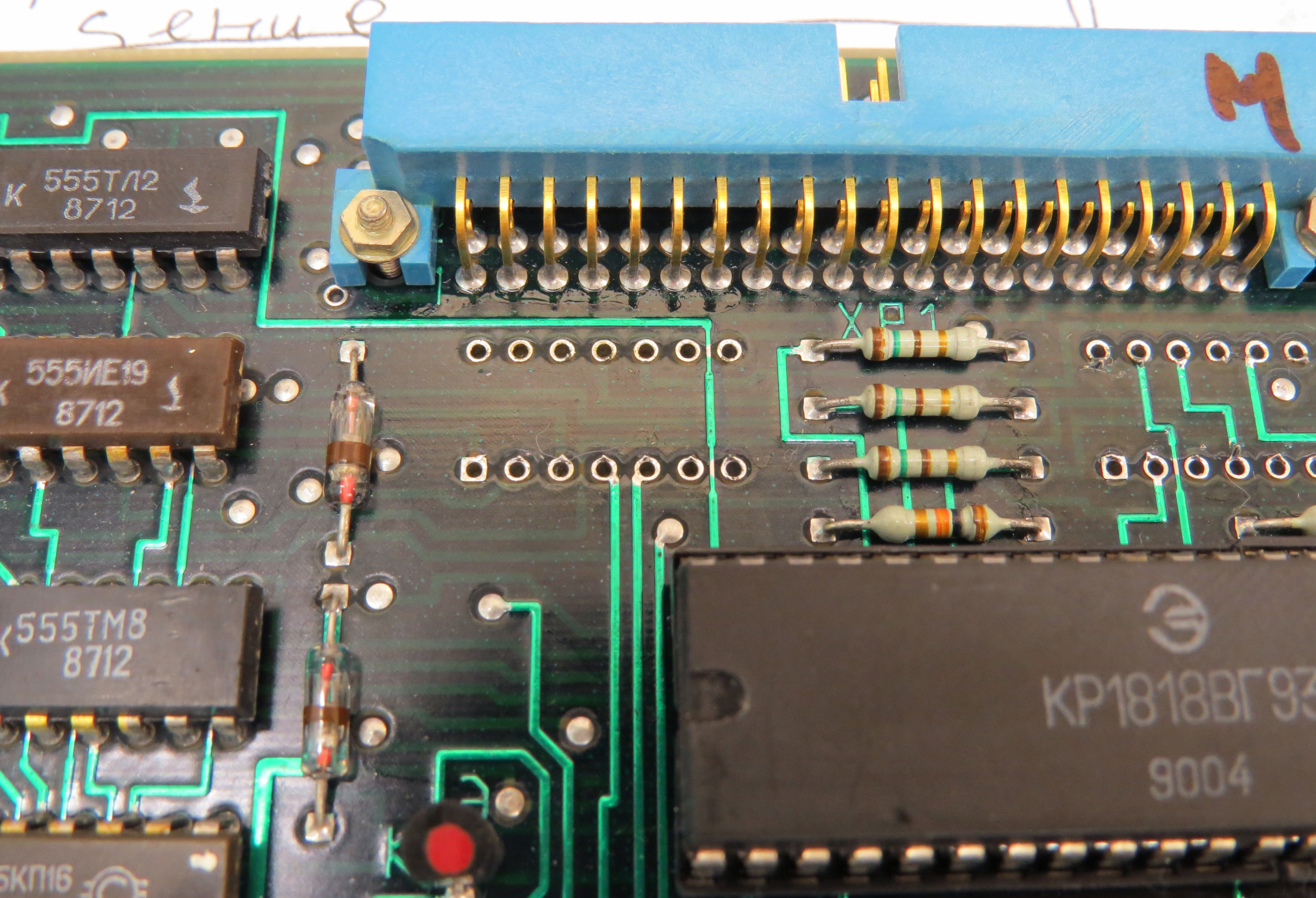 3. Теперь надо разобраться с отсутствием картинки. Начинаем с видеоусилителя и обнаруживаем, что он хоть и подвергся варварскому перекраиванию, но сохранил работоспособность, а именно причина в отсутствии видеосигнала. Теперь мы как сыщик идем по линии видеоусилителя и приходим на плату ГС - генератор сигнала. Внимательно изучив ее, приходим к выводу, что не поступает какой-то сигнал с платы процессора для управления видеосигналом.
